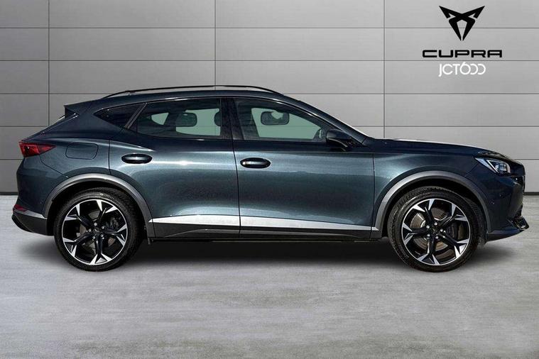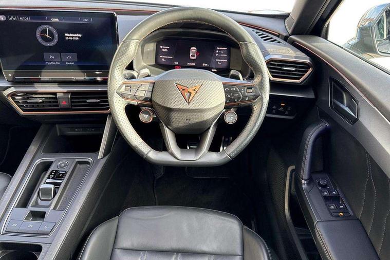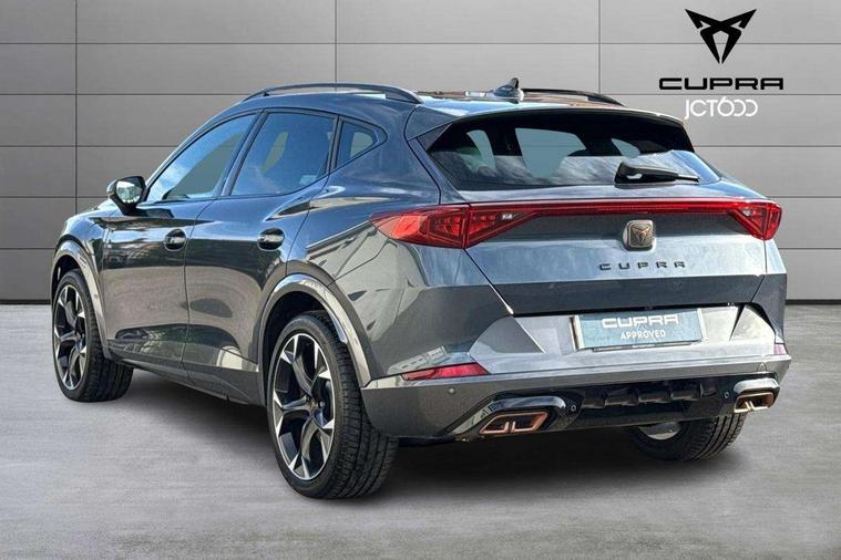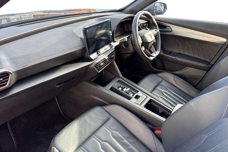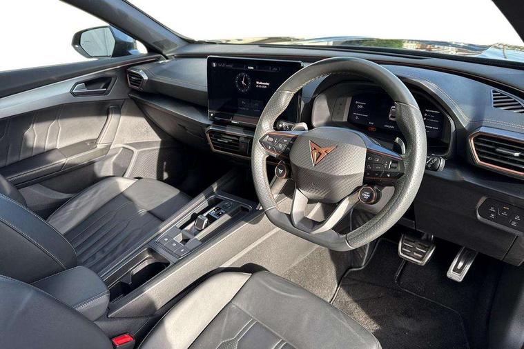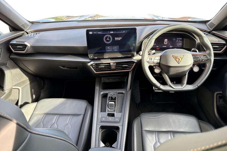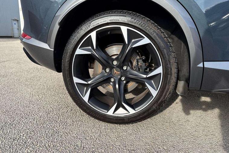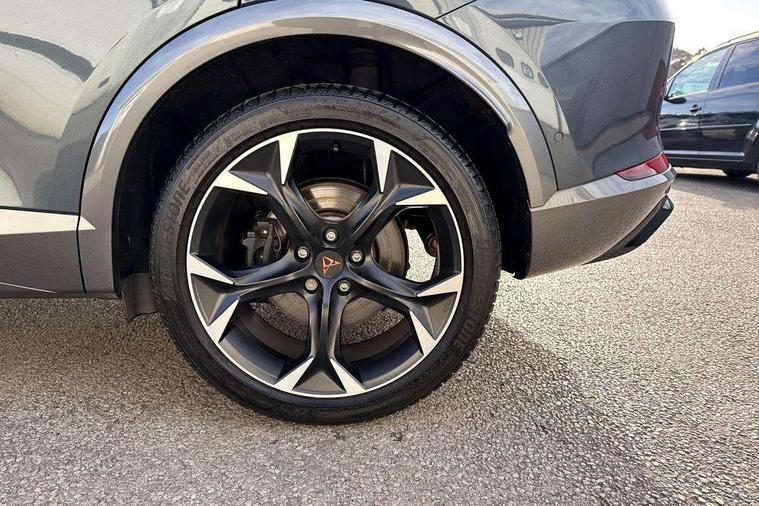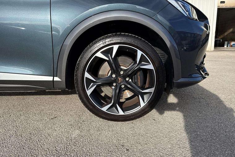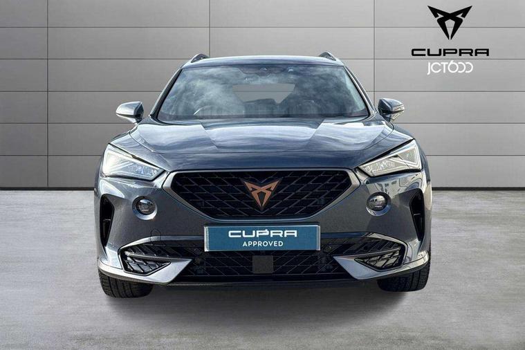 Digital cockpit and configurable dashboard, Driver alert system, Dynamic chassis control with driving profile selection (Comfort, Sport, CUPRA, Individual), Forward collision warning with automatic braking, Lane assist, Navigation system with 12'' Touchscreen Display, Park assist (inc front/rear parking sensors), Predictive adaptive cruise control with speed limiter, RPM, trip computer, outside temp gauge, instrument light brightness, low fuel warning light, lights on reminder, gearshift indicator, Service interval indicator, Speed sensitive power steering, Start/stop system with regenerative braking, Virtual pedal and electric tailgate, Voice control system, Wired Android Auto, Wireless apple carplay, Wireless phone charger, 10 amp mode 2 charging cable, 16 amp mode 3 charging cable, 3.6 kw On-board charger, Electronic locking differential and dynamic traction support, Sports suspension with front shock absoption, 2 front and 2 rear USB type C sockets, Auxiliary input socket, DAB radio, Auto dimming rear view mirror, Body colour door handles, Body coloured bumpers, Dark grey wing mirror, Daytime running light with automatic headlight control and coming home feature, Dynamic headlight range control, Electric front/rear windows, Electrically adjustable heated and folding door mirrors with memory function, Front fog lamps with cornering function, Gloss black roof rails and window surrounds, LED Headlights, LED Taillights with dynamic indicator, Rain sensing wipers, Rear diffuser with twin exhaust pipe on each side with simulated exhausts, Rear side wing doors, Rear wash/wipe, Sports bumpers, Third brake light, Tinted rear windows, Welcome lights, 12v power supply in centre console, 12V socket, 12v socket in loadspace, 2 front and 2 rear reading lights, 230V socket, 3 seat bench in 2nd row, 60/40 split rear bench seat with armrest and mechanical seat release, Black headlining, Cupra sports pedals, Dust/pollen filter, Front and rear head restraints, Front centre armrest, Height/reach adjust steering wheel, Illuminated interior front door sills, Illuminated sunvisor with mirror, Isofix, Leather heated multi-function sports steering wheel with start stop, CUPRA mode button and gear shift paddles, Luggage tie-down hooks, Single front passenger seat, Three zone climate control with control panel in rear, Wraparound lighting, Genuine Nappa leather Pack - Cupra, Safety and driving pack (XL) - Formentor, 3 point seatbelts on all rear seats, ABS, Brake control system - ESC and brake booster, Child proof door locks, Driver and front passenger airbags with front passenger airbag de-activation, Electronic parking brake, Front and rear disc brakes, Front side curtain airbags, Hill hold control, Public e-call, Seat belt reminder for front and rear seats, Tyre pressure monitoring system, Anti theft alarm system, Keyless entry and start system (KESSY), Locking wheel bolts, Copper and aluminium interior detailing, 19" 'Exclusive' machined sport matte black and silver alloy wheels, Tyre repair kit,