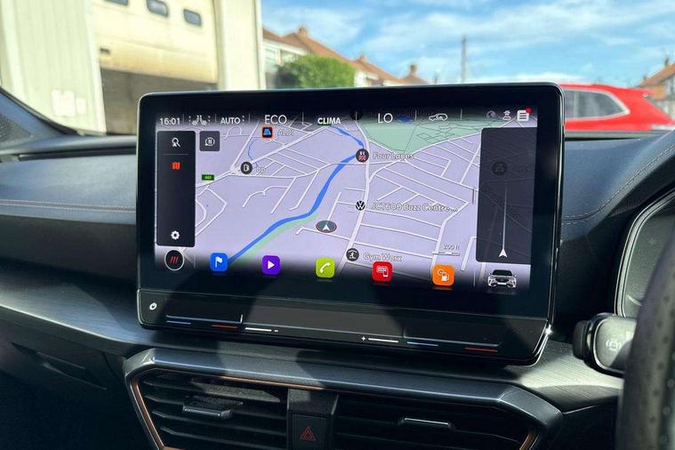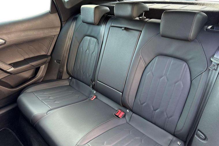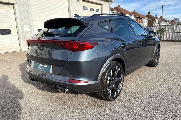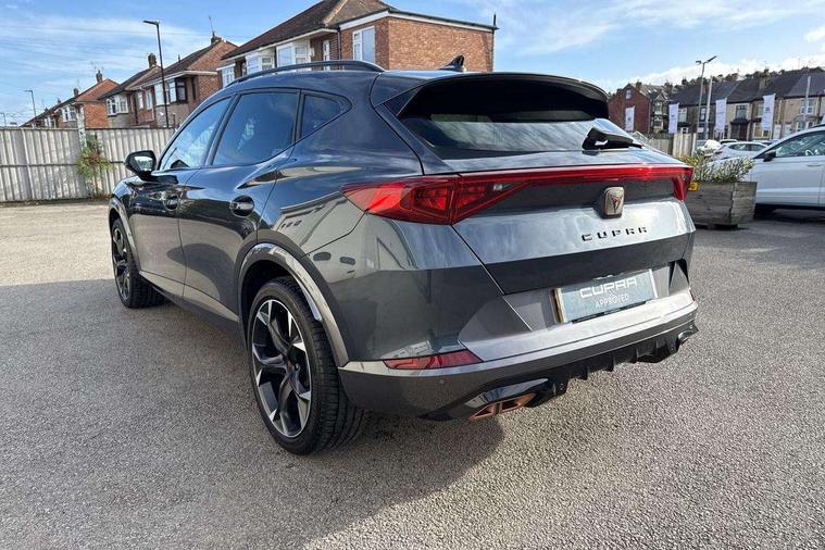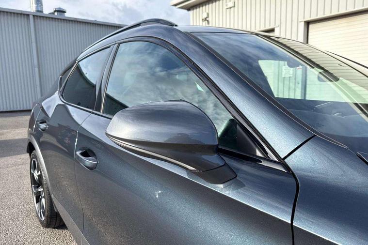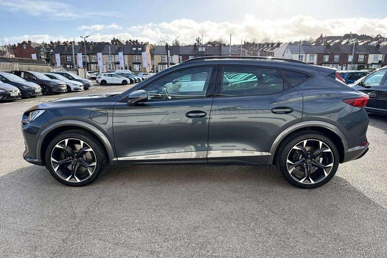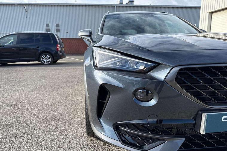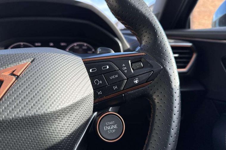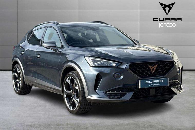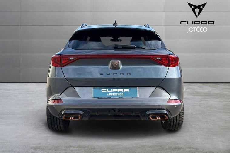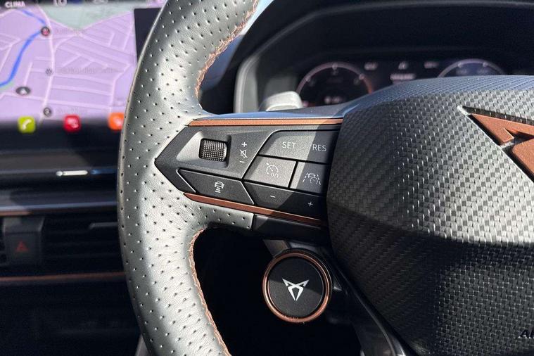 Digital cockpit and configurable dashboard, Driver alert system, Dynamic chassis control with driving profile selection (Comfort, Sport, CUPRA, Individual), Forward collision warning with automatic braking, Lane assist, Navigation system with 12'' Touchscreen Display, Park assist (inc front/rear parking sensors), Predictive adaptive cruise control with speed limiter, RPM, trip computer, outside temp gauge, instrument light brightness, low fuel warning light, lights on reminder, gearshift indicator, Service interval indicator, Speed sensitive power steering, Start/stop system with regenerative braking, Virtual pedal and electric tailgate, Voice control system, Wired Android Auto, Wireless apple carplay, Wireless phone charger, 10 amp mode 2 charging cable, 16 amp mode 3 charging cable, 3.6 kw On-board charger, Electronic locking differential and dynamic traction support, Sports suspension with front shock absoption, 2 front and 2 rear USB type C sockets, Auxiliary input socket, DAB radio, Auto dimming rear view mirror, Body colour door handles, Body coloured bumpers, Dark grey wing mirror, Daytime running light with automatic headlight control and coming home feature, Dynamic headlight range control, Electric front/rear windows, Electrically adjustable heated and folding door mirrors with memory function, Front fog lamps with cornering function, Gloss black roof rails and window surrounds, LED Headlights, LED Taillights with dynamic indicator, Rain sensing wipers, Rear diffuser with twin exhaust pipe on each side with simulated exhausts, Rear side wing doors, Rear wash/wipe, Sports bumpers, Third brake light, Tinted rear windows, Welcome lights, 12v power supply in centre console, 12V socket, 12v socket in loadspace, 2 front and 2 rear reading lights, 230V socket, 3 seat bench in 2nd row, 60/40 split rear bench seat with armrest and mechanical seat release, Black headlining, Cupra sports pedals, Dust/pollen filter, Front and rear head restraints, Front centre armrest, Height/reach adjust steering wheel, Illuminated interior front door sills, Illuminated sunvisor with mirror, Isofix, Leather heated multi-function sports steering wheel with start stop, CUPRA mode button and gear shift paddles, Luggage tie-down hooks, Single front passenger seat, Three zone climate control with control panel in rear, Wraparound lighting, Genuine Nappa leather Pack - Cupra, Safety and driving pack (XL) - Formentor, 3 point seatbelts on all rear seats, ABS, Brake control system - ESC and brake booster, Child proof door locks, Driver and front passenger airbags with front passenger airbag de-activation, Electronic parking brake, Front and rear disc brakes, Front side curtain airbags, Hill hold control, Public e-call, Seat belt reminder for front and rear seats, Tyre pressure monitoring system, Anti theft alarm system, Keyless entry and start system (KESSY), Locking wheel bolts, Copper and aluminium interior detailing, 19" 'Exclusive' machined sport matte black and silver alloy wheels, Tyre repair kit,