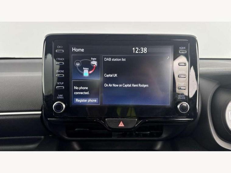 Adaptive cruise control, Adjustable speed limit with speed warning, Bluetooth connectivity, Colour binocular inspired displays with digital speedometer, E-call, Electric power steering, Hybrid energy display, Multi information display switches on steering wheel, Reversing camera, Smartphone integration with Apple CarPlay and Android auto, Tailgate, Voice recognition, Vehicle Stability Control (VSC), 4 speakers, 8" Multimedia display touch screen, USB connection, Acoustic windscreen glass, Auto windscreen wipers, Automatic headlights, Body coloured door mirrors, Electric adjustable heated door mirrors, Follow me home headlights, Front auto power windows with anti jam protection, Full LED rear lights, LED daytime running lights, LED front fog lights, LED front light guide, LED Headlights, LED High mounted stop lamp, LED Indicators, LED rear light guide, Manual headlight levelling, Painted chequered front grille, Rain sensor, Rear auto power windows with anti jam protection, Rear privacy glass, Rear side wing doors, Rear spoiler, Rear wiper, Shark fin antenna, Turning signal integrated indicators in door mirrors, Variable front intermittent wipers, 3 adjustable rear headrests, 3 spoke leather steering wheel, 60/40 split folding rear seat, Active headrests, Adjustable boot height, Auto air conditioning, Coat hooks in rear grab handles, Cup holders (2 front & door), Data Communication Module (DCM) connected services, Fabric upholstery, Front armrest, Glovebox, Grey roof lining, Height adjustable driver's seat, Isofix seat fixing, Leather gearshift, Pollen filter, Shopping bag hooks, Single front passenger seat, Tilt/telescopic steering column, 3 point seatbelts on all rear seats, ABS+EBD+Brake assist, Electronic parking brake, Emergency brake light system (EBS), Front passenger airbag on/off switch, Front seatbelt reminder, Hill start assist control (HAC), Rear child proof door locks, Rear seat belt reminder, Supplemental Restraint System (SRS) 8 airbags: Driver & passenger's airbags, dual side curtain airbags, side impact airbags, front centre airbag, Toyota Safety Sense 2, Precollison + Night time Pedestrian & Cyclist Detection, Lane Trace Assist, Auto High Beam, Intelligent ACC & Road Sign Assist, Tyre pressure warning system, 2x Master key, Alarm/immobiliser, Remote powered central double locking doors, Soft touch instrument panel, Space saver spare wheel,