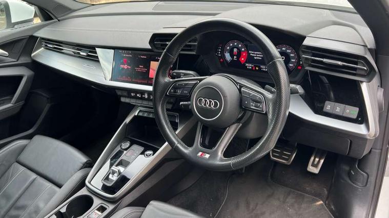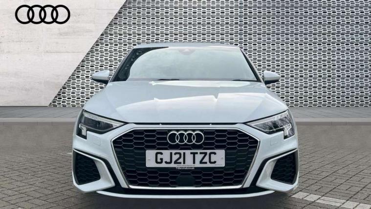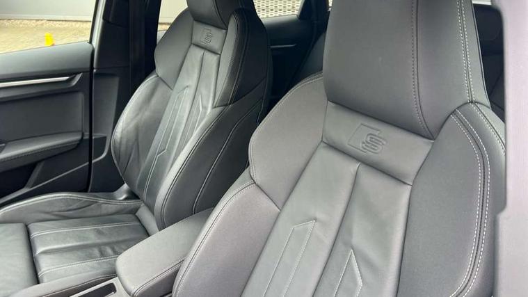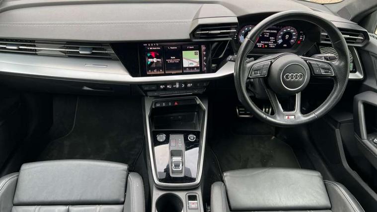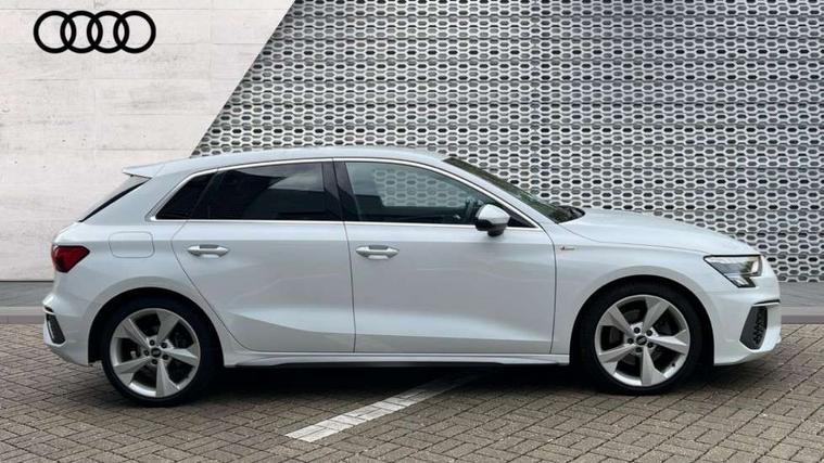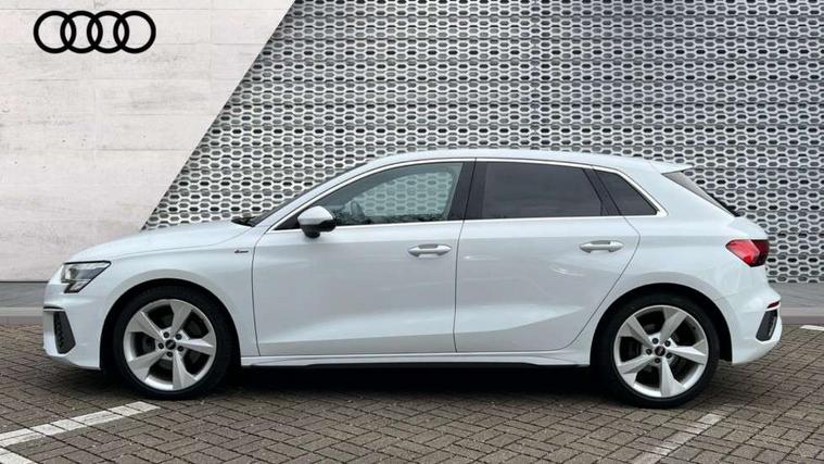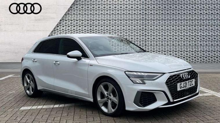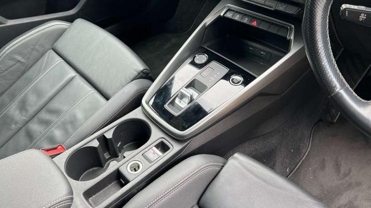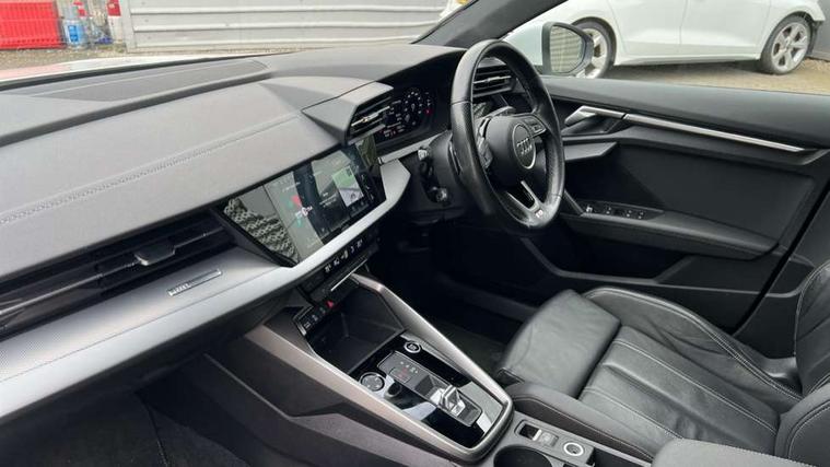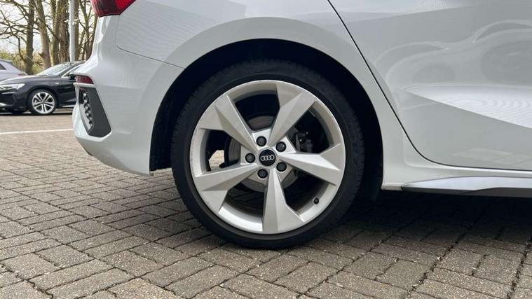 Accent surfaces in the dashboard and centre console in platinum grey silk effect paint finish, Dark spectrum aluminium inlays, Aluminium interior elements pack - A3 Sportback, S line styling pack - A3 Sportback, Anti theft alarm, Anti-theft wheel bolts, Electronically operated child lock, Immobiliser, Remote control central locking, 2xUSB-C connection with data and charging functions, 6 passive loudspeakers, DAB Digital radio, 3x3 point rear seat belts, Driver and front passenger airbag with passenger airbag deactivation, Electronic Stabilisation Control (ESC) including ABS, ASR and EDL, First aid kit with warning triangle and 2 safety vests, Front side airbags with head airbags and interaction airbag, Hill hold assist, Pre-sense front with pedestrian and cyclist detection, Seatbelt monitoring, Tyre pressure loss indicator, Acoustic glass windscreen, Aluminium window trim, Auto dimming frameless rear view mirror, Electrically adjustable/heated/folding/dimming door mirrors with kerb view includes integrated LED indications + kerb view function for passenger side, Front electric windows, Illuminated aluminium inserts front door sills with S logo, LED daytime running lights, Light and rain sensors, Privacy glass - dark tinted rear window, rear door and side windows, Rear electric windows, Rear side air outlets in grained matt black, Rear wiper, S line bumpers, S roof spoiler, 12V socket and storage compartment in front centre console, 40/20/40 split folding rear seat bench with cupholder, Black cloth headlining, Dual zone electronic climate control, Front and rear centre armrest in leather, Front and rear headrests, Front/rear floor mats, Height and reach adjustable steering wheel, Interior lighting - glove compartment light and right hand side, Luggage compartment floor covering, Manual boot compartment lid, Manually adjustable front seats, Seat side bolsters, Stainless steel pedals and front footrest, Twin leather upholstery with front sports seats S embossed logo, Audi connect emergency call and service, Audi drive select (Auto, Comfort, Dynamic, Efficiency and Individual), Audi smartphone interface, Audi Virtual Cockpit - 10.25" digital and colour instrument cluster, Automatic start/stop system with recuperation, Bluetooth interface, Collision avoidance assistant, Electromechanical power speed sensitive steering, Lane departure warning system, MMI Navigation Plus with high resolution 10.1" colour touch screen display, Service indicator, Trip computer, Voice control system with natural language interaction,