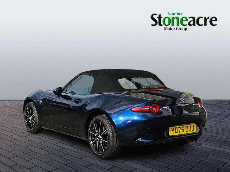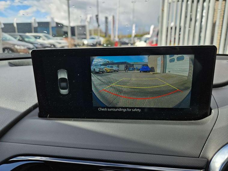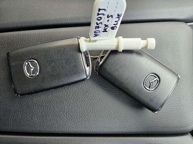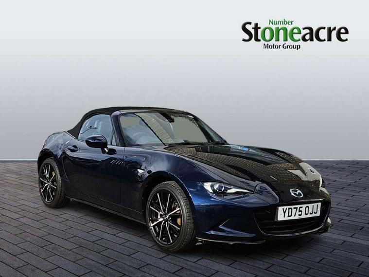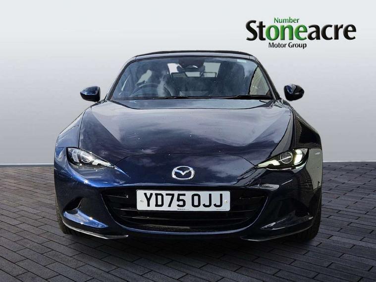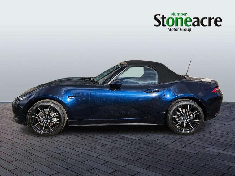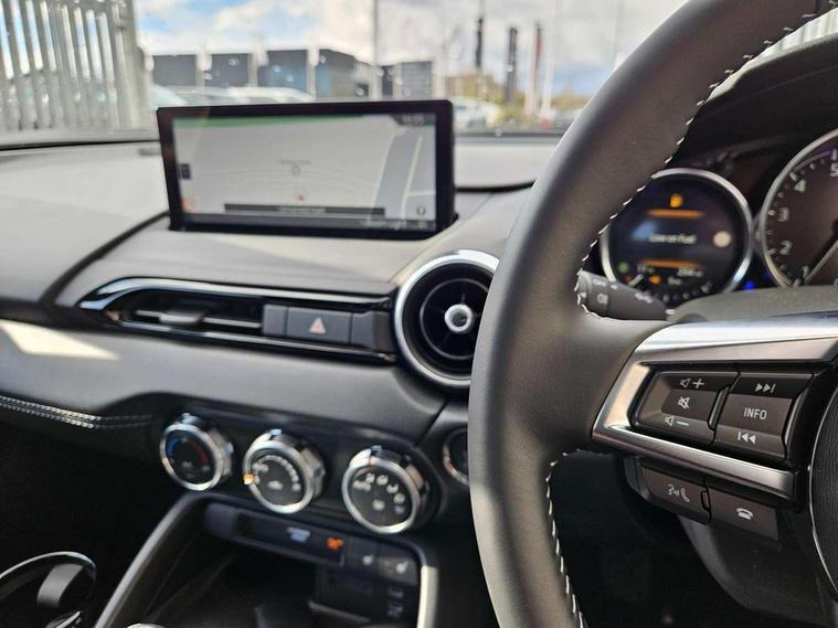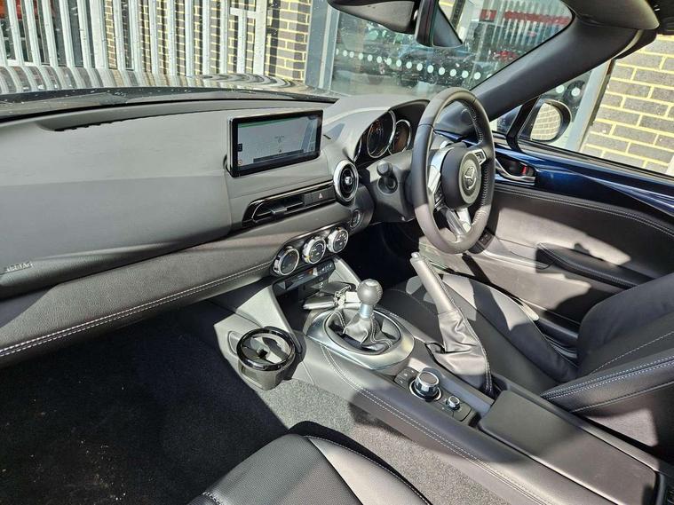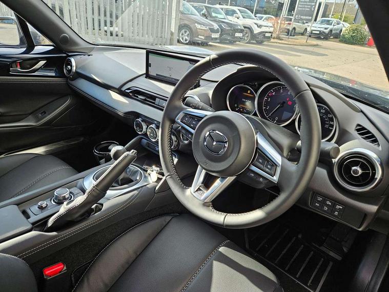8.8" Colour centre touch screen display with Mazda Connect infotainment, Aha and stitcher app, Analogue speedometer, Apple car play/Android Auto, Blind spot monitoring with rear cross traffic alert, Cruise control with Intelligent speed assist, Driver alert system, eCall emergency call system, Emergency stop signalling system, Engine start/stop button, Hands free phone preparation, Integrated bluetooth with hands-free calling, bluetooth audio and easy access to phone contacts, Integrated navigation system, Kinematic posture control, Lane departure warning system, Lane keep assist, Multi dot display tachometer and electric odometer, PAS, Rear parking sensor, Reversing camera, Service indicator, Traffic sign recognition, Trip computer, Water temperature gauge, Asymmetric limited slip differential, I-ELOOP, i-stop, Sports suspension featuring Bilstein dampers, 2 x USB Type-C inputs, Multimedia Commander including separate volume dial, Premium Bose sound system with 9 speakers with 2 in each front headrest, AM/FM/DAB radio and MP3, Steering wheel mounted audio/bluetooth controls, Adaptive LED Headlights, Automatic headlamp levelling, Black scuff plates with stainless steel insert, Body colour bumpers, Body colour co ordinated interior upper door trim, Body coloured electric/heated door mirrors, Coming/leaving home lighting function, Dual exhaust pipes, Dusk sensitive headlamps, Electric front windows/one touch facility, Exterior body colour co ordinated upper door panel trim with black vinyl and silver stitching, Frameless auto dimming rear view mirror, Front intermittent wipers, LED 3rd brake light, LED daytime running lights, LED indicator lights, LED rear lights, Manually operated black premium cloth soft top with heated rear glass window, Piano Black fashion bars, Rain sensing front wipers, Rear boot, 12V socket, Centre console storage box, Chrome Air conditioning dials, Climate control air conditioning, Coin Box, Driver and front passenger sunvisors with covered vanity mirror and driver ticket holder, Driver seat manual slide, recline and tilt adjustment, Front centre armrest, Front head restraints, Gear shift indicator, Heated front seats, in 3 heat levels, Interior courtesy light, ISOFIX front passenger seat child seat compliance, Leather gear knob, Leather handbrake lever, Leather steering wheel, Lockable rear centre box with lid, Passenger seat + manual slide/recline adjust, Perforated leather upholstery, Single front passenger seat, Strut brace, Tilt/telescopic steering column, Two cupholders, Windblocker, 3 point ELR front seatbelts with pretensioners, ABS+Electronic Brake force Distribution, Deployable Hood System (DHS), Driver and passenger seatbelt reminder audible warning, Dynamic stability control with track mode, Exit warning, Front dual stage driver and single stage front passenger airbags, Front smart city brake support with autonomous emergency braking (SCBS), Hill hold assist, Passenger airbag deactivate switch, Side airbags, Smart city brake support - Rear (SCBS-R), Traction control, Tyre pressure monitor, Remote central locking with deadlocking and remote boot release, Smart keyless entry, Superlocking, Thatcham category 1 alarm + immobiliser, Centre Console - Vinyl leather, Chrome air vent surrounds, Dashboard panel - Black Vinyl, 17" Black machined alloy wheels, Tyre puncture repair kit,
