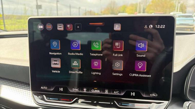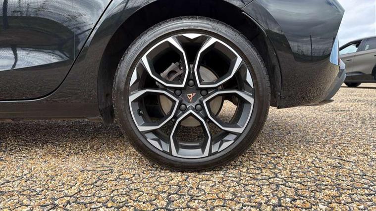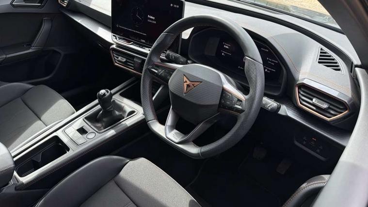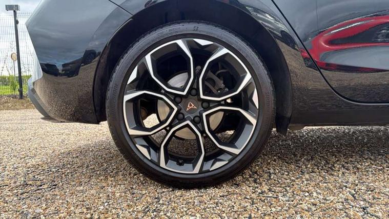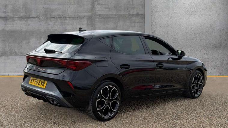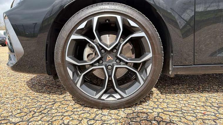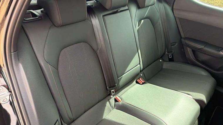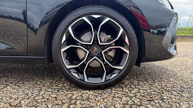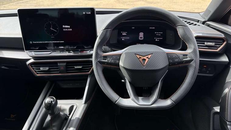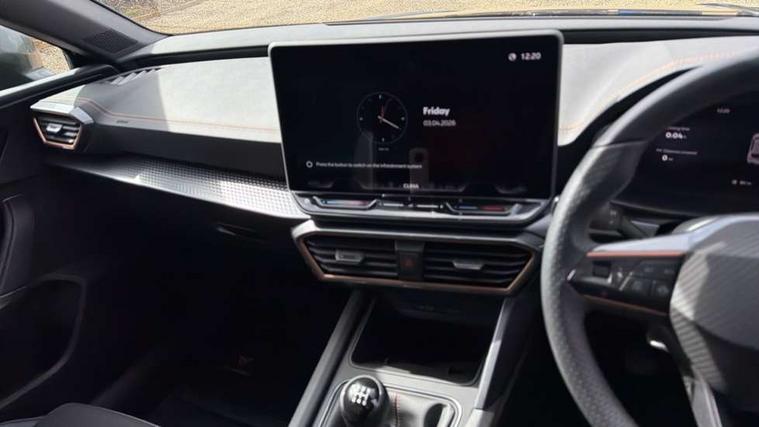 Adaptive cruise control with follow-to-stop and speed limiter, CUPRA drive profile selection with (Comfort/Performance/Individual), throttle response and gearshift mode, Digital cockpit, Driver alert system, Dynamic road sign display, E-call, Front and rear parking sensors, Front assist with forward collision warning braking reaction to vehicles, pedestrians and cyclists, Front cross traffic assist, Full link smartphone integration with Mirror Link, wireless Apple CarPlay and wired Google Android Auto, Lane assist, Lockable tailgate, PAS, RPM, trip computer, outside temp gauge, instrument light brightness, low fuel warning light, lights on reminder, gearshift indicator, Service interval indicator, Start/stop system with regenerative braking, Wireless phone charger, 7 speakers, Auxiliary input socket, Auto dimming rear view mirror, Body colour door handles, Body coloured bumpers, Cupra sports bumpers, Dark tinted rear windows, Electric front/rear windows, Electrically adjustable, heated and folding door mirrors, High beam assist, LED front fog lamps with cornering function, LED headlights with dynamic turn signals, tail lights, rear fog lights with rear coast to coast lighting, LED rear fog lamp, Rain sensing wipers, Rear diffuser with black simulated exhaust pipes, Rear side wing doors, Rear wash/wipe, Separate daytime running light with automatic headlight control and coming home feature, Third brake light, Welcome light with logo projector in door mirrors, 12v power supply in centre console, 3 seat bench in 2nd row, 5 headrests, 60/40 split rear bench seat with armrest, Ambient lighting with glovebox, footwell and single monocolour, Black headlining, Cloth/PVC upholstery, CUPRA Leather flat bottomed, heated, perforated steering wheel, Driver and passenger seat with manual height and lumbar adjustment, Folding boot cover, Four x USB Type C ports (2 in front and 2 in rear), Front and rear reading lights X 4, Front centre armrest, Height/reach adjust steering wheel, Illuminated interior front door sills, ISOFIX points in outer rear seats with top tether anchorage points, Single front passenger seat, Storage pockets on rear of front seats, Sunvisors with illuminated mirror, Three zone climate control, Media system plus with 12.9" display + navigation pack - Leon Cupra, 3 point seatbelts on all rear seats, ABS, Brake control system - ESC and brake booster, Child proof door locks, Cupra black brake calipers, Disc brakes in front, Driver and front passenger airbags with front passenger airbag de-activation, front side and curtain airbags, Electronic parking brake, Hill hold control, Rear disc brakes, Seat belt reminder for front and rear seats, Tiredness recognition system, Tyre pressure monitoring system, Anti theft alarm system with interior monitoring in cab, backup horn and towing protection, Central locking system Keyless Go, Locking wheel bolts, Chrome and copper interior detailing, 18" Garbi machined sport black matt and silver alloy wheel with 92Y XL tyres, Tool kit,