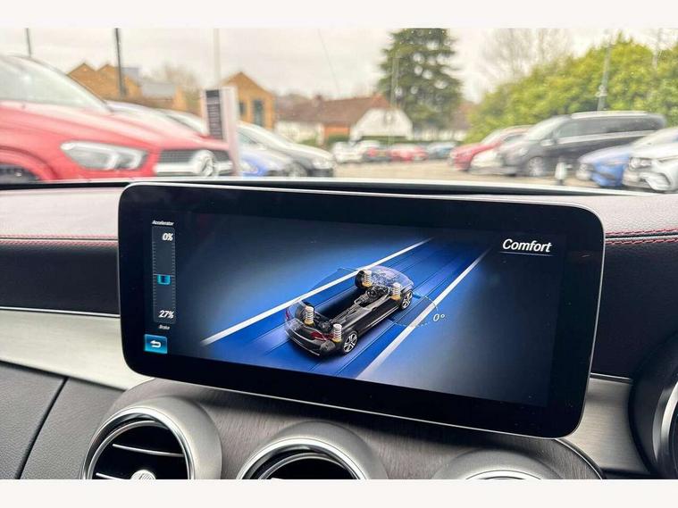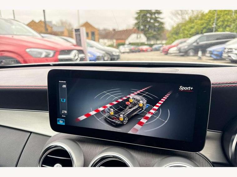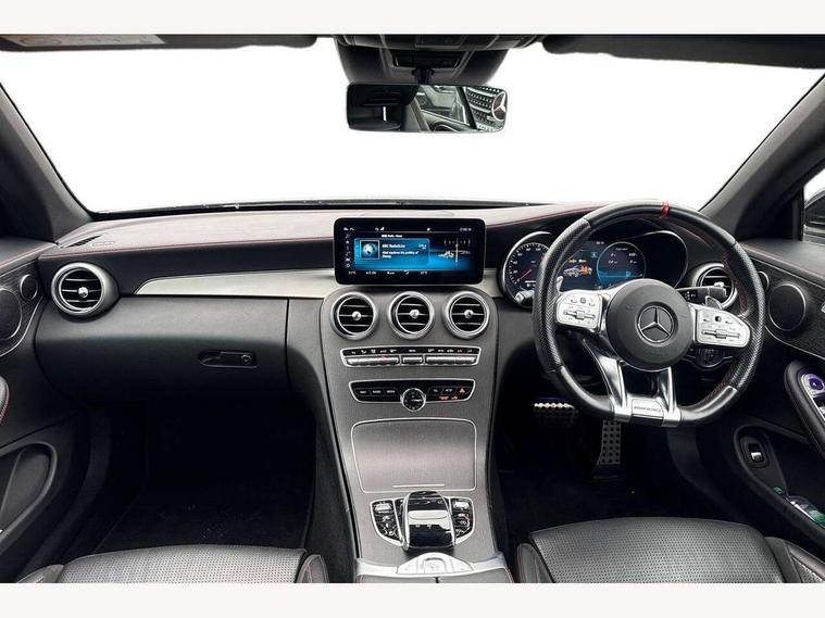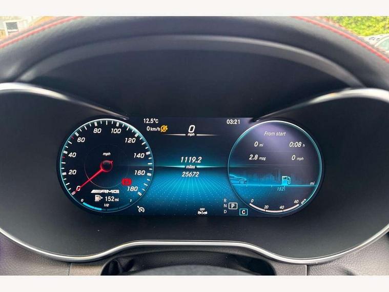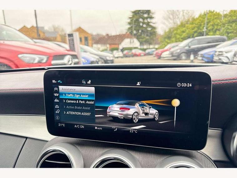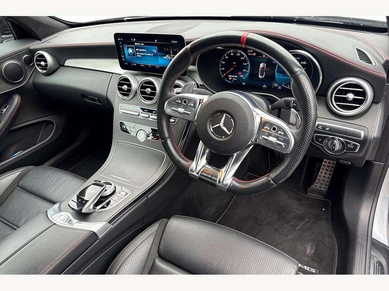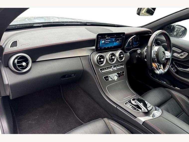 12.3" digital instrument cluster display, 2 stage speed sensitive sport steering, 360 degree camera, Active park assist with parktronic system, AMG boot logo in central screen, Attention assist, Bluetooth interface for hands free telephone, Collision prevention assist plus, Comand Online HDD Nav with media interface, radio/CD/DVD/MP3, 10.25 screen, linguatronic voice control, Cruise control with speedtronic variable speed limiter, DYNAMIC SELECT with a choice of driving modes (ECO, Comfort, Sport, Sport+ and Individual), ECO start/stop function, High resolution 10.25" multimedia colour display, Instrument cluster two tube design round dials and 5.5-inch TFT multi-function display, Mercedes me connect including emergency call system, accident recovery, breakdown and maintenance management, Multi function trip computer, Outside temperature display, Pre-wiring for SD navigation system, Remote boot release, Reversing camera, Service indicator (ASSYST), Status display for rear seat belts in instrument cluster, 66l fuel tank with increased capacity, 9G Tronic plus 9 speed automatic, AMG performance 4MATIC with torque control distribution, AMG Ride Control sports suspension, Petrol Particulate Filter, DAB digital radio tuner, Frontbass loudspeakers, Midline sound system, Two USB ports and one SD Card slot in centre console, Acoustic soft-top with enhanced climate and noise comfort, Adaptive brake lights, AIRCAP wind deflector and draught stop, AMG bodystyling - front apron with distinctive air intakes and AMG rear apron with diffuser look, AMG boot lid spoiler in body colour, AMG design radiator grille with double louvre in matt iridium silver with AMG lettering, AMG performance exhaust system, Automatic headlights, Black door mirror housings, Body coloured bumpers, Electric windows with one touch opening/closing and obstruction sensors, Exterior mirrors heated and electronically adjustable, Front door sill panels with AMG lettering, Full LED tail lamps, Green tinted glass, LED daytime running lights, LED Indicators, LED third brake light, Multi beam LED headlights, Radio aerial integrated into rear window, Rain sensor windscreen wipers, Rear boot, Semi-automatic boot separator, Side windows surround in polished aluminium, V8 Bi-Turbo 4Matic badge on front wings, 2 cupholders in front centre console, 2 rear head restraints, 2 seat bench in 2nd row, 3 spoke AMG performance flat bottom leather steering wheel in black, heavily embossed central grip area silver chrome and contrast topstitching in red, 40:20:40 split folding rear seats, Airscarf - neck level heating, Auto Mercedes-Benz child seat recognition sensor, Electric height/reach adjustable steering column, Floor mats with black leather edging, red piping and AMG logo, Front centre armrest with storage compartment, Front head restraints, Front LED reading lights, Heated front seats, Illuminated glove compartment stowage, Interior lighting - 64 colour Ambient lighting, Leather upholstery, Single front passenger seat, Sports pedals with stainless steel surfaces and rubber studs, Sports seats with integrated head restraints, Steering wheel gearshift paddles, Steering wheel touch control buttons for audio and onboard settings, Sunvisors with illuminated vanity mirrors, THERMATIC 2 zone automatic climate control, Interior lighting package - C Class, Memory pack with steering column memory - C Class, Mirror package - C Class, Seat comfort pack - C Class, Stowage space pack - C Class, 2 rear seatbelts, 3 point automatic seatbelts, Active bonnet, Adaptive brake system with hold function and brake drying function, Anti-lock braking system (ABS), Automatic seatbelt pretensioner for driver and front passenger, Brake calipers with AMG lettering + perforated brake discs, Dual stage airbags - driver and front passenger, front sidebags, driver kneebag, pelvis bag and windowbags for driver, front and rear passengers, Electronic parking brake, Electronic Stability Programme (ESP), ISOFIX child seat attachment points with top tether in rear, Red seat belts, Sports braking system with larger brake discs, Tyre pressure monitoring system, Warning triangle and first aid kit, Anti-theft alarm system/interior protection with tow-away protection and interior monitoring systems, Central locking with interior switch, automatic locking and crash sensor with emergency opening function, Chrome surround electric key, Immobiliser, Anthracite open pore oak wood trim, Artico man-made leather dashboard with red contrast stitching, 18" AMG 5-spoke light-alloy wheels aerodynamically-optimised, painted in tremolitegrey with a high-sheen finish, TIREFIT with tyre inflation compressor,