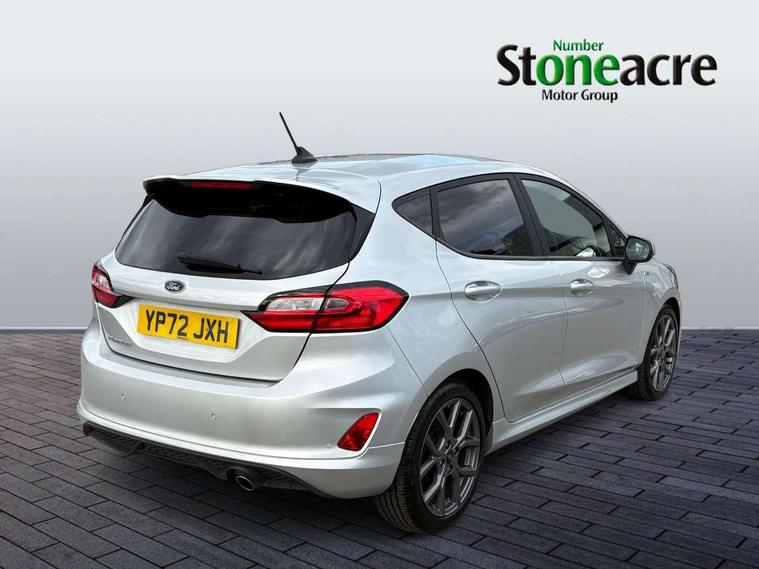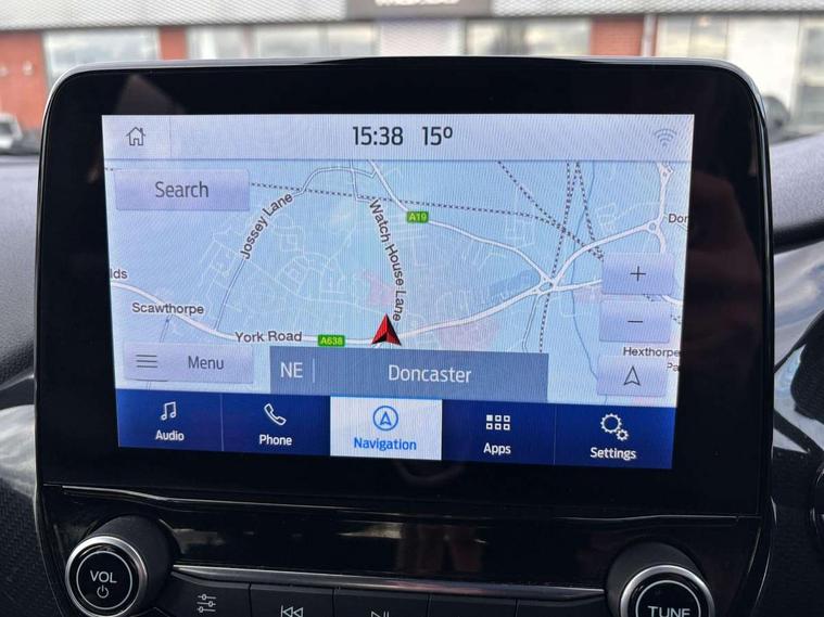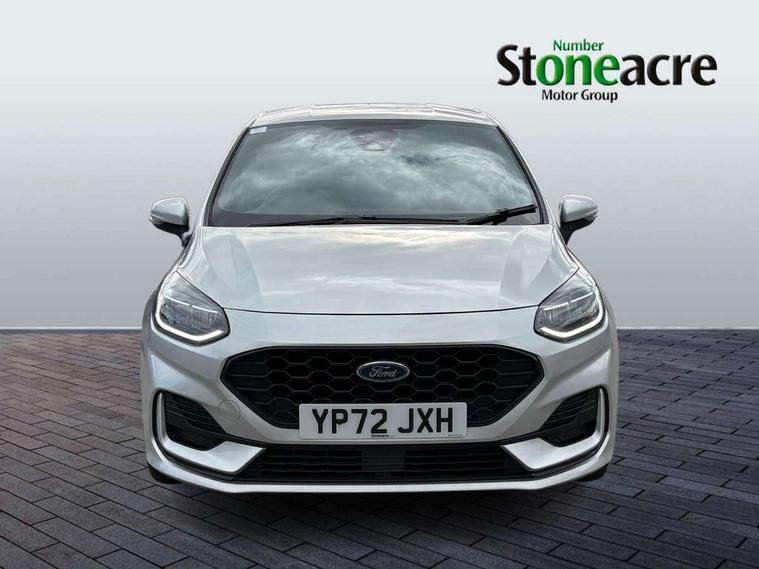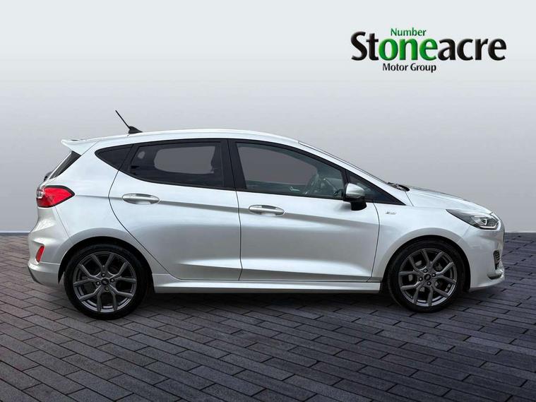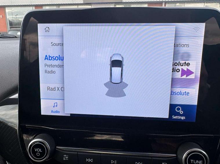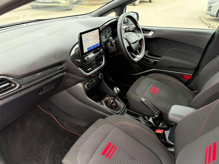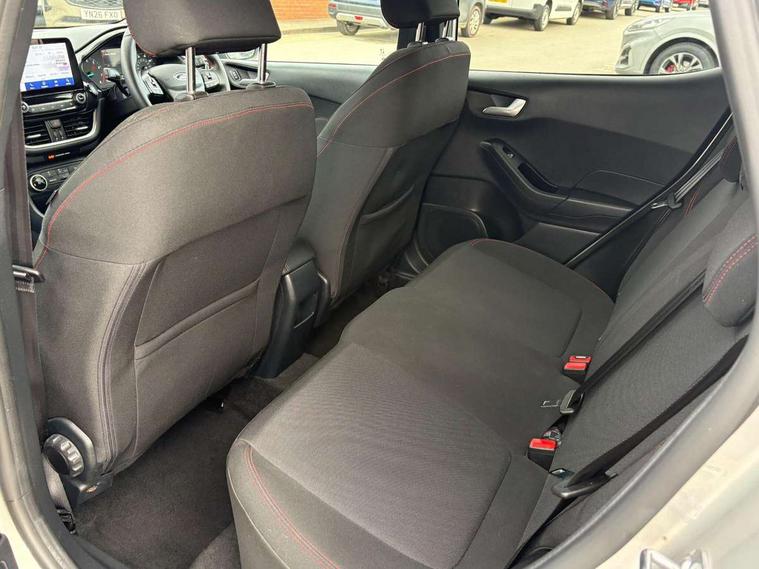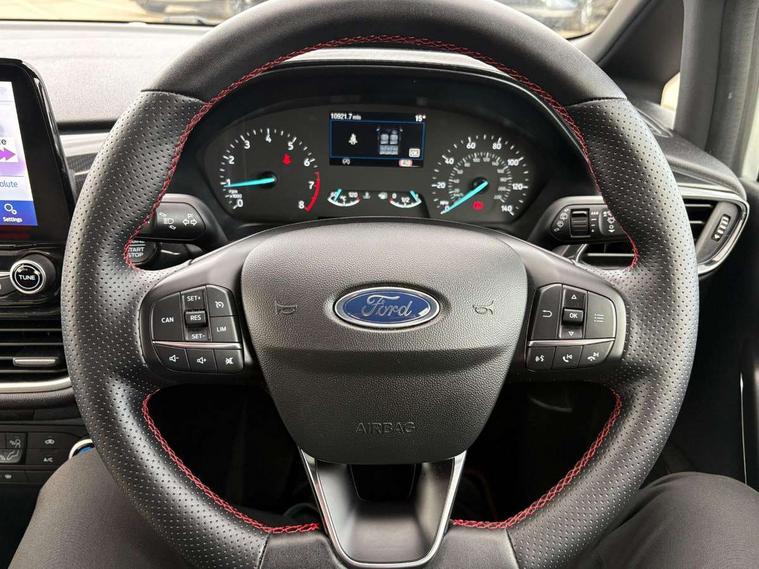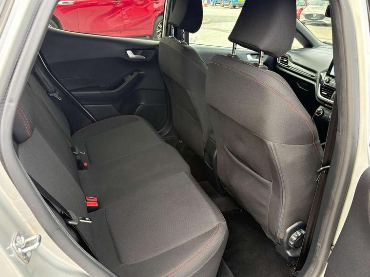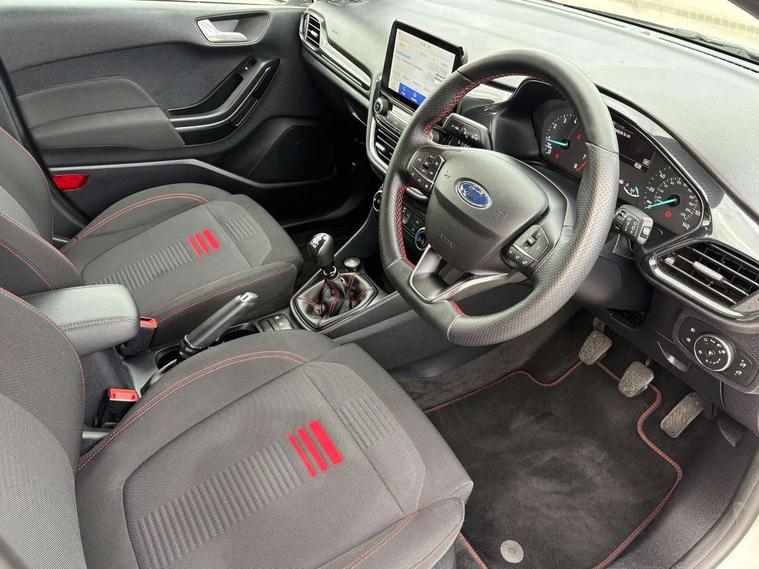 4.2" Colour TFT Ice blue illumination analogue cluster, Driver alert system, Electric power steering, Ford easy fuel, Lane keep assist, Lane keeping aid, Rear parking distance sensors, Selectable drive modes (Normal, Sport, Track), Trip computer, Sports suspension, 3rd brake light, Auto high beam, Automatic headlights, Body colour bumpers, Body colour large rear spoiler, Body coloured electrically operated with side indicators, Electric front windows/one touch facility, Electric rear windows, Quickclear heated windscreen, Rain sensing wipers and auto dimming rear view mirror, Rear privacy glass, Rear side wing doors, Rear wiper, Unique ST-Line grille, full bodystyling kit and large body coloured rear spoiler, 3 rear headrests, 3 seat bench in 2nd row, Adjustable head restraints, Black headlining, Centre console with opening armrest, 2x cupholders, 12v and USB, Cloth upholstery with red stitching, Leather gear knob, Manual 2 way passenger seat adjust, Manual 4-way driver seat adjust, Manual air conditioning, Premium floor mats, Sensico wrapped steering wheel, Single front passenger seat, 3 point seatbelts on all rear seats, Electronic stability control with hill start assist, Front and rear seat belt warning, Manual child lock in rear doors, Tyre pressure monitoring system, Keyless start with 'Ford Power' starter button, MyKey system, Remote central locking, Thatcham alarm with power door dead locks, 17" 5x2 spoke alloy wheels with rock metallic finish,