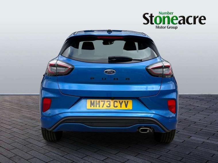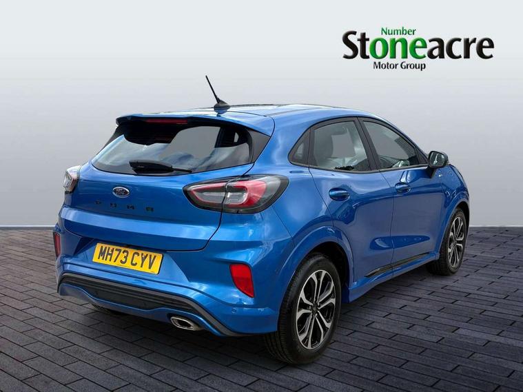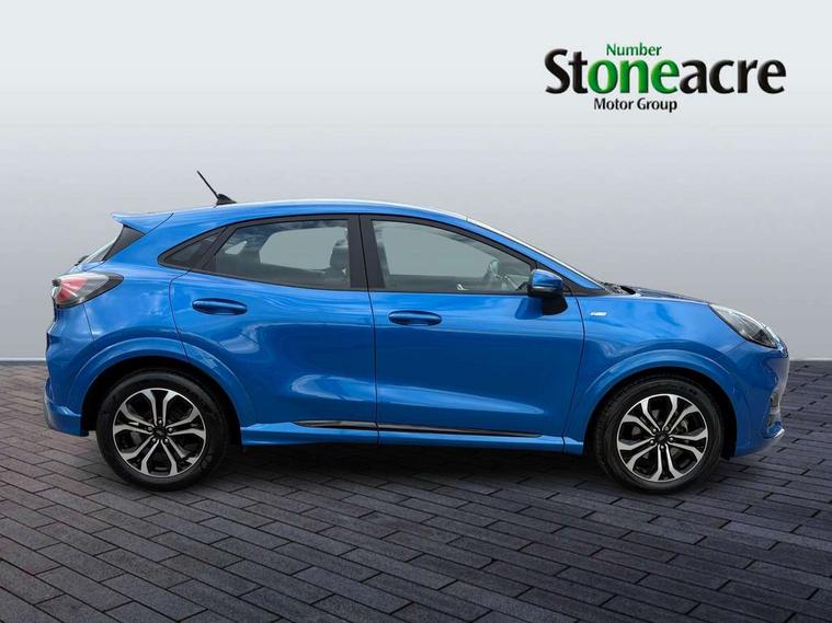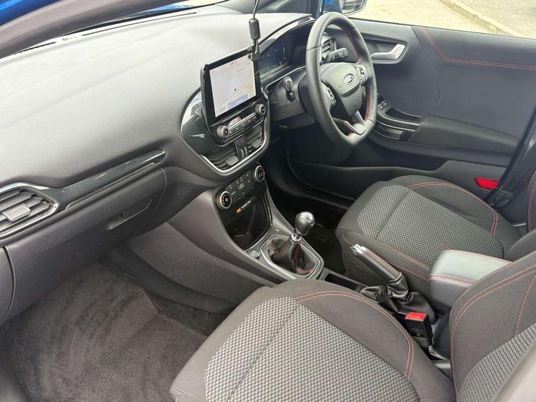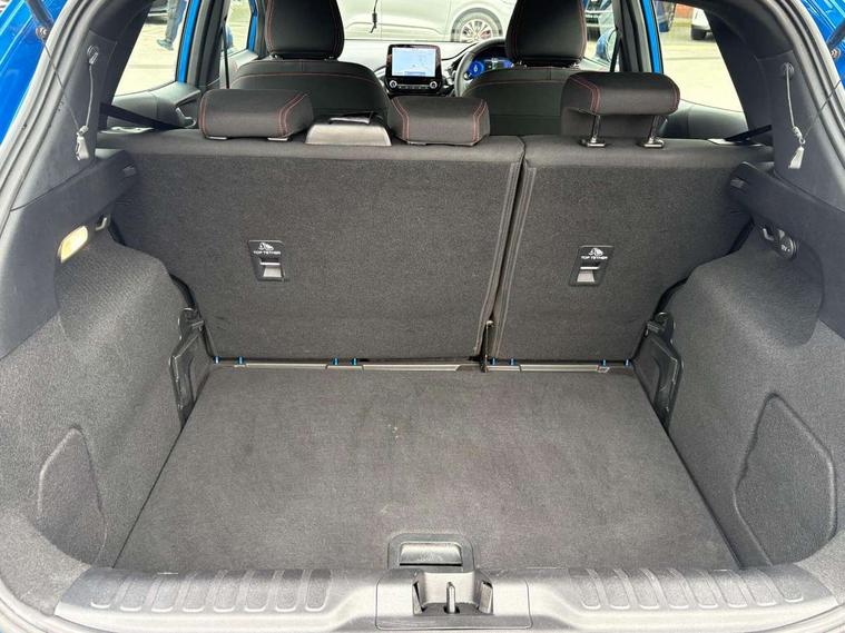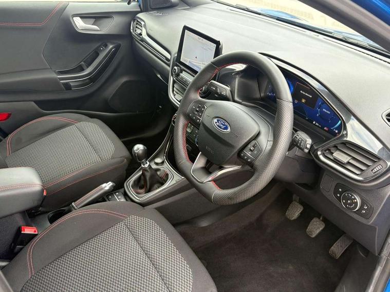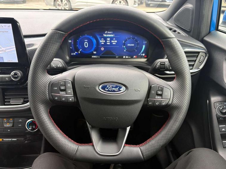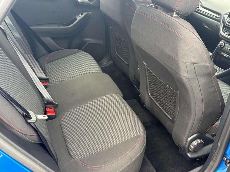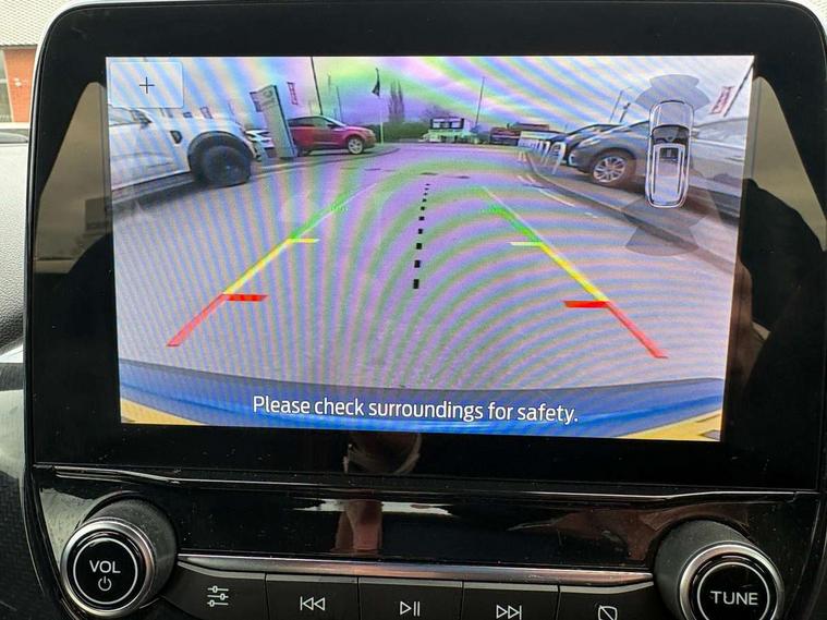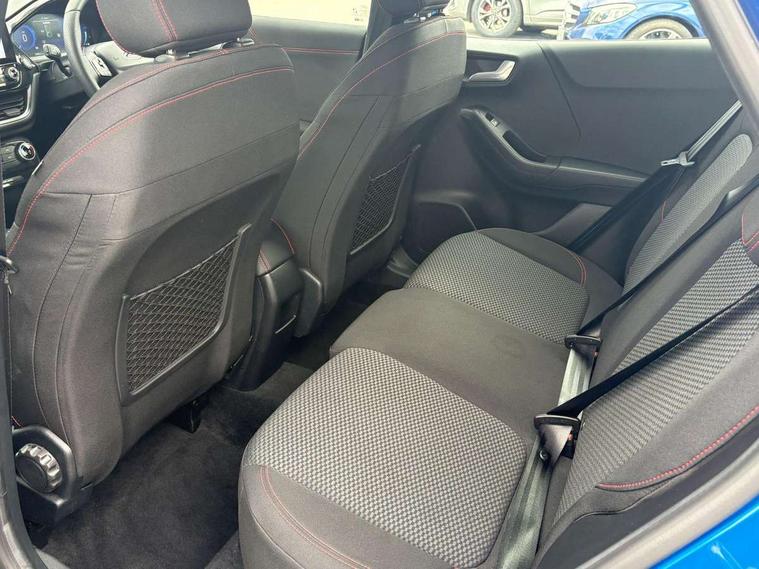 Driver impairment monitor, Emergency call service, Ford easy fuel, Full digital 12.3" instrument cluster, Lane keeping aid with lane departure warning, Power assist steering, Power start button, Rear parking sensor, Selectable drive modes(Normal, sport, Eco, trail, slippery), Speed sign recognition, Sport suspension, Automatic headlights with auto high beam, Automatic rain sensing wipers, LED rear lamps, Power foldable heated door mirrors with puddle lamps, Projector headlamps with LED day time running lights and front fog lamps, Quickclear heated windscreen, Rear side wing doors, Rear wiper, ST-Line body styling kit with unique grille, Third brake light, 3 seat bench in 2nd row, Centre console with armrest and stowage, Ford megabox extended bootspace, Front and rear head restraints, Front floor mats, Manual 2 way passenger seat adjustment, Manual 4 way driver seat adjust with lumbar adjustment, Single front passenger seat, ST- Line cloth trim with red stitching, ST-Line flat bottomed sensico leather steering wheel with leather handbrake and aluminium gear knob, Ford SYNC 3 navigation pack - Puma, 3 rear seatbelts, Child safety lock, Electronic stability control (ESC) and hill start assist, Pedestrian/cyclist detection & post-collision braking, Pre collision assist system, Tyre pressure monitoring system (TPMS), Thatcham alarm,