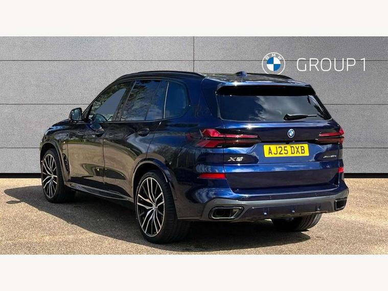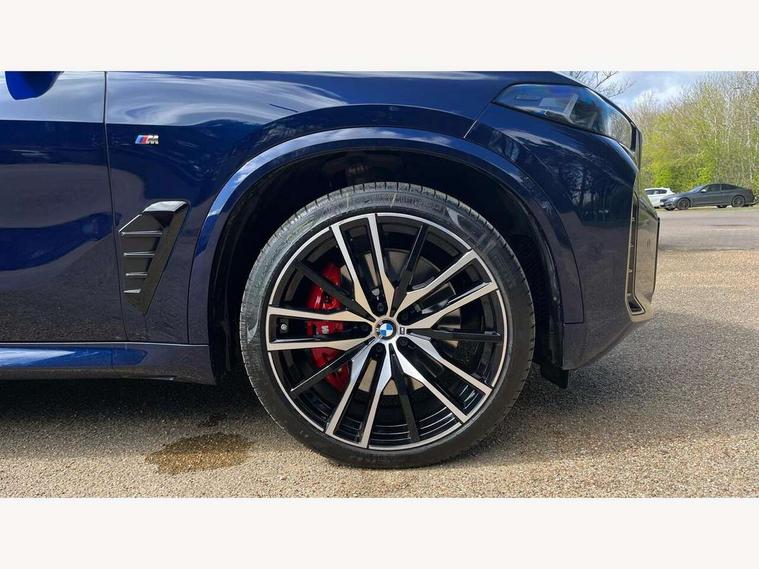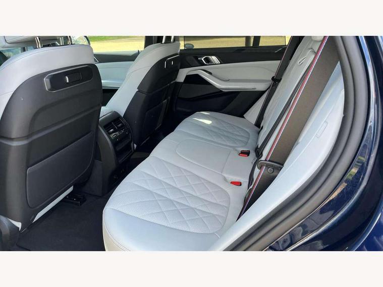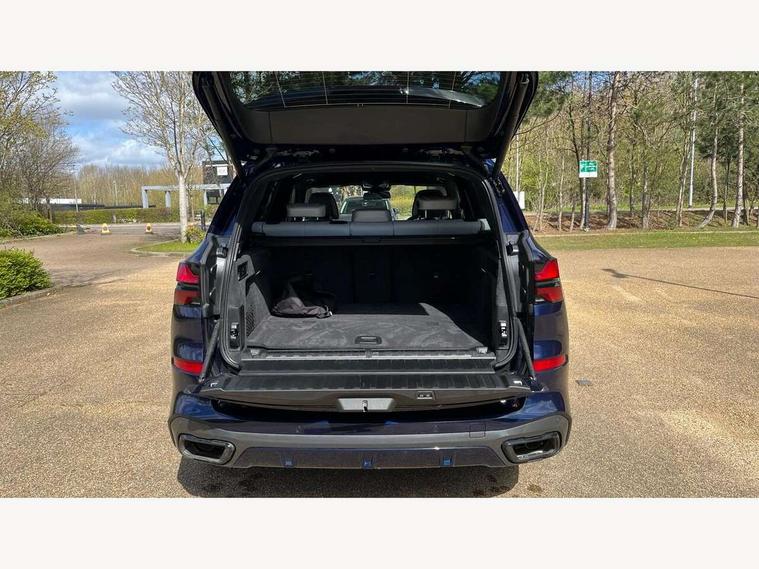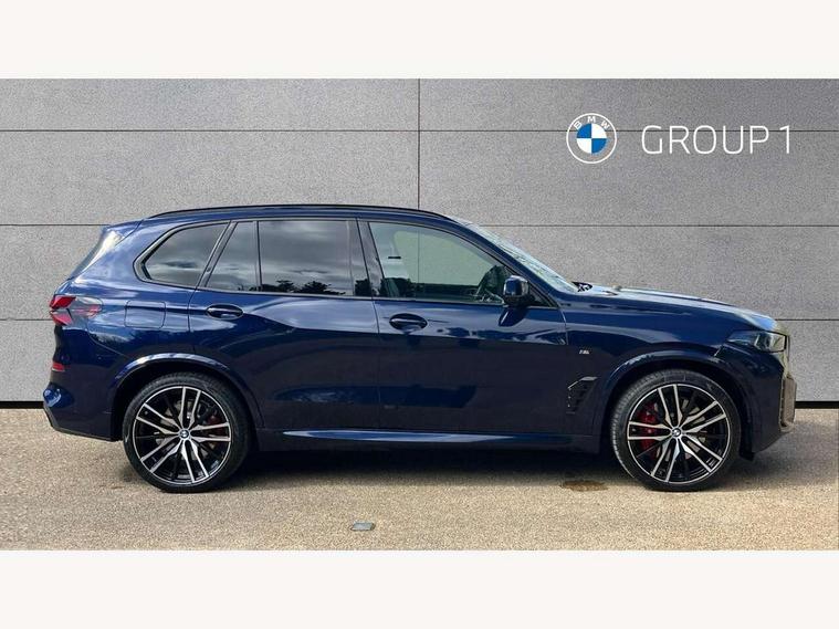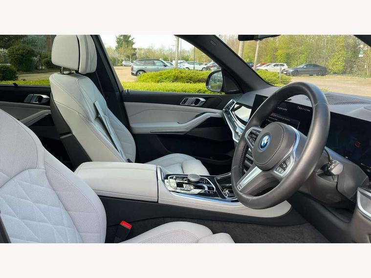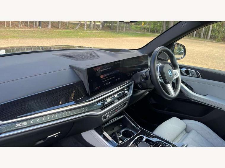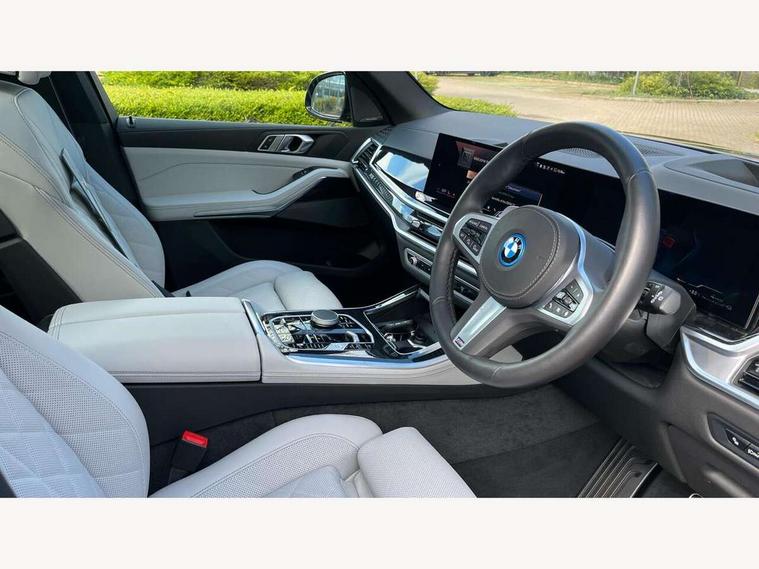 Attentiveness assist, Automatic tailgate operation, BMW ConnectedDrive online services, BMW live cockpit + with curved 12.3 instrument cluster/14.9 central display, nav/Tuner with diversity reception, RDS/4GLTE/remote software upgrade, BMW Teleservices, Condition based service, Cruise control with brake assist, eCall emergency call system, Enhanced bluetooth with wireless charging, Integrated owner's handbook, PAS, Speed limiter, Wi-Fi hotspot, AC Fast charging preparation (Maximum charging power 11kW), Adaptive 2-axle Front and rear air suspension, Drive performance control with ECO PRO comfort + sport mode, Eight speed steptronic sport automatic transmission and gearshift paddles on the steering wheel, Adaptive LED Headlights, Front and rear electric windows, High beam assistant, High gloss black shadow line roof rails, LED daytime running lights, Rain sensor, Rear side wing doors, Third brake light in rear spoiler, Variable intermittent rear wash/wipe, 12V - Power sockets with 2x centre console and 1x luggage compartment, 3 seat bench in 2nd row, Foldable rear centre armrest with 2 cupholders and storage compartment, Front and rear side armrest integrated into door trim, Headrests for all seats, Luggage compartment separating net, Lumbar support with height and depth adjustment in backrest, Single front passenger seat, Three spoke sport M leather steering wheel, Velour floormats, Ambient light interior pack - X5, Driving assistant pack with radar based driver assistance system - X5, Expanded exterior mirror pack - X5/X5 M, M aerodynamics pack - X5, Parking assistant pack - X5, 3 rear seatbelts, Acoustic protection for pedestrians, Active protection, Airbags - driver/front passenger, rear and side, first and second row seats head airbags, front passenger seat airbag deactivation + knee airbag, Anti-lock braking system (ABS), Automatic Stability Control (ASC), Brake energy regeneration, Cornering brake control (CBC), Crash sensor activating central locking release, hazard warning lights, fuel cut off, interior lighting + activation of safety battery terminal clamp, DSC - Dynamic Stability Control, Dynamic Traction Control - DTC, Electromechanical parking brake with automatic drive away release and auto hold function, Electronic brake force distribution, Hill start assistant, M Sport blue painted brake calipers with 'M' designation, Mechanical child proof lock on rear doors, Tyre pressure monitoring system, Tyre pressure sensors, Ventilated front and rear disc brakes, Warning triangle and first aid kit, Alarm system, Closing system with central locking, Comfort access system, Locking wheel bolts,