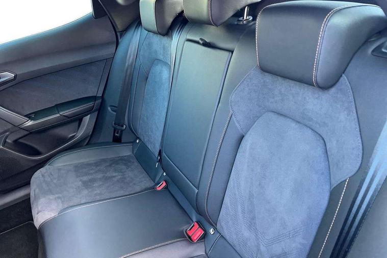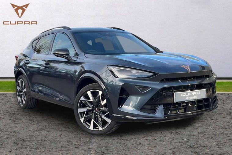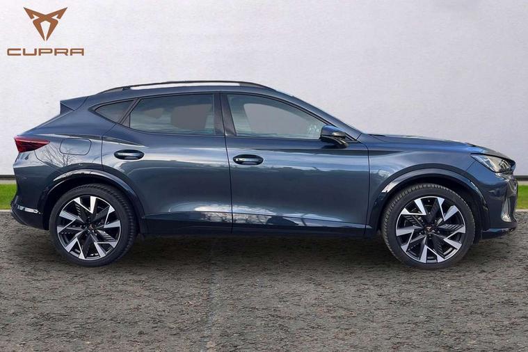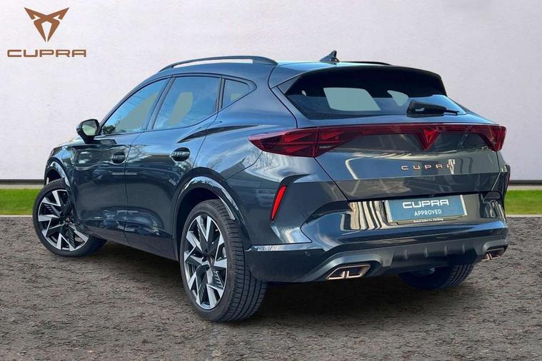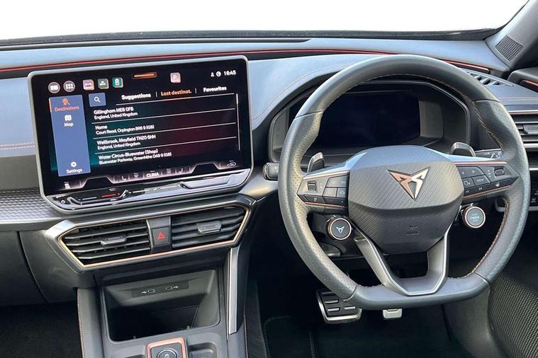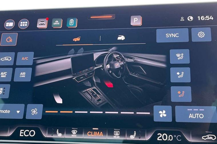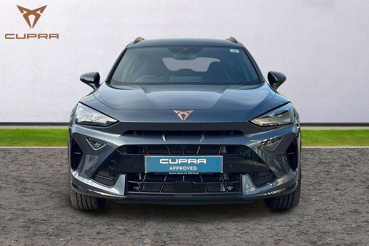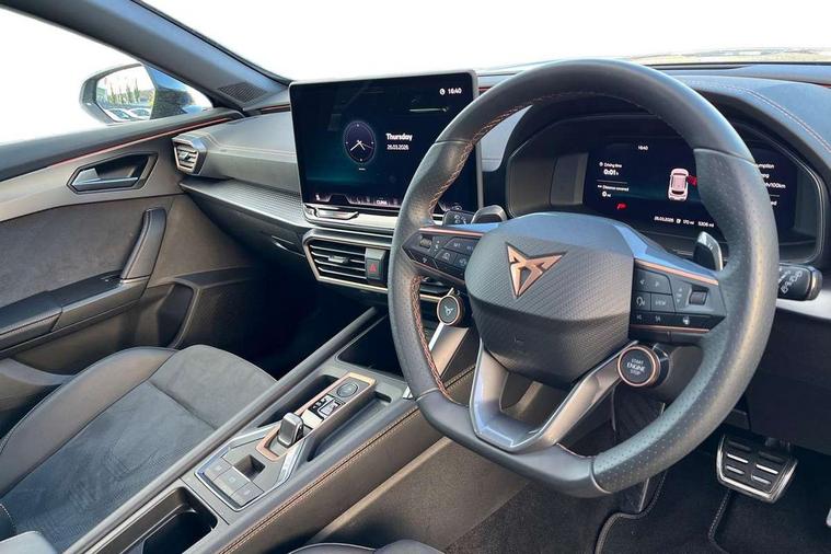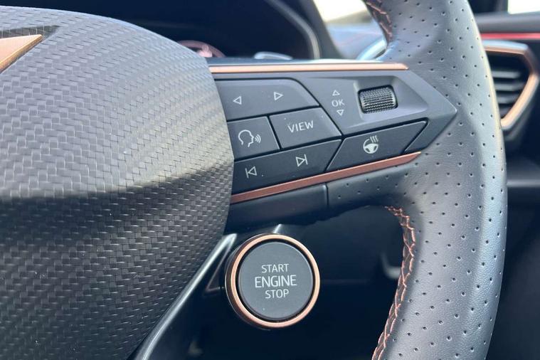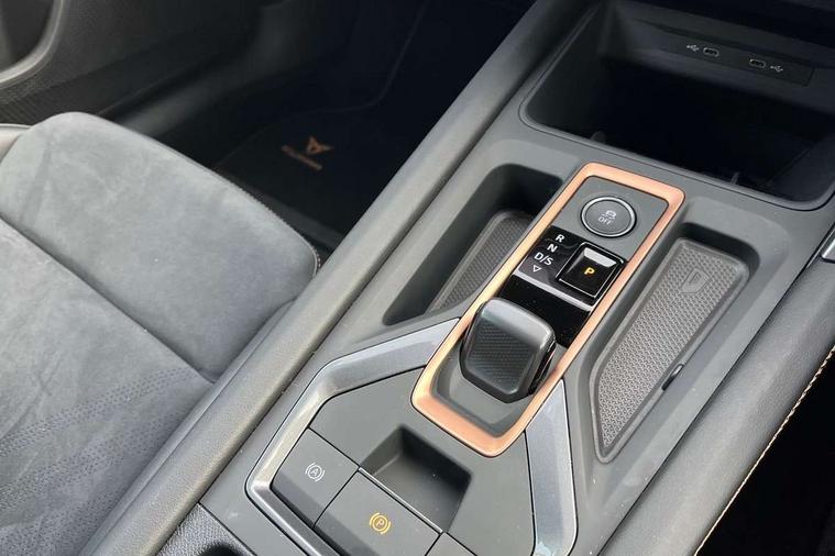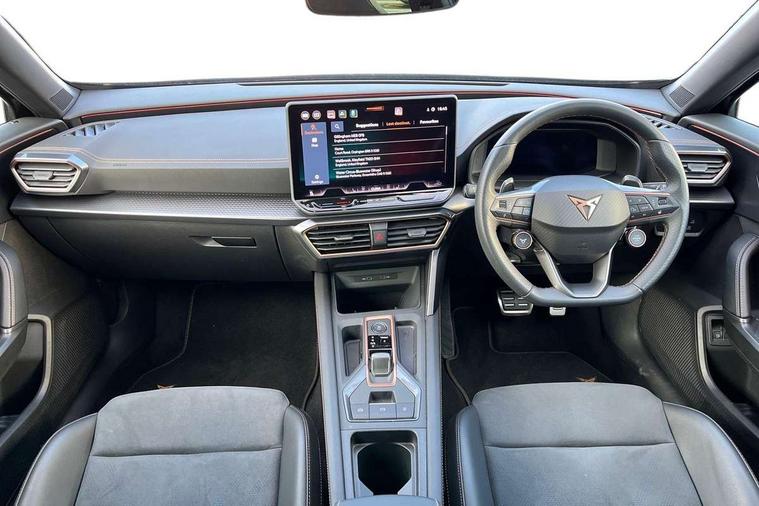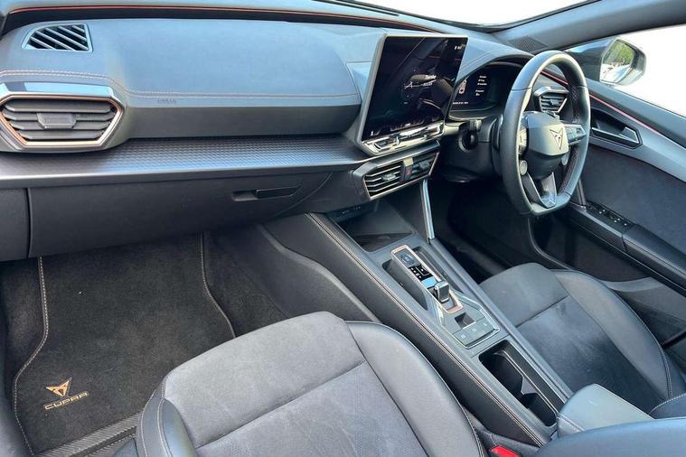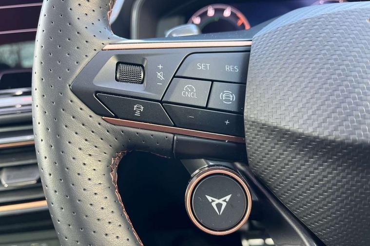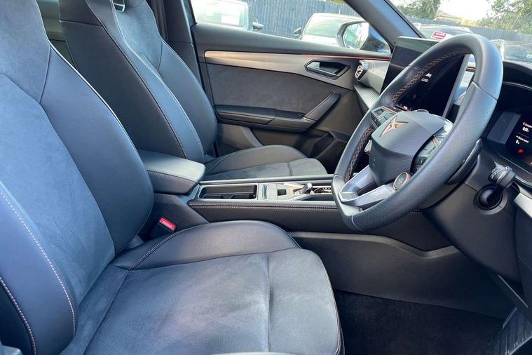 10.25" digital cockpit and configurable dashboard, Adaptive cruise control with follow-to-stop and speed limiter, Advanced driver alert system, Dynamic chassis control with driving profile selection (Comfort, Sport, CUPRA, Individual), Dynamic road sign display, Emergency steering support with turn assist, Forward collision warning with automatic braking, Front and rear parking sensors, Full link phone integration, Lane assist, Rear view camera, RPM, trip computer, outside temp gauge, instrument light brightness, low fuel warning light, lights on reminder, gearshift indicator, Service interval indicator, Speed sensitive power steering, Start/stop system with regenerative braking, Virtual pedal and electric tailgate, Voice control system, Wired Android Auto, Wireless apple carplay, Wireless phone charger, 10 amp mode 2 charging cable, 32 amp mode 3 charging cable, Adaptive chassis control with continuous operation, CUPRA sport suspension, Electronic locking differential and dynamic traction support, 2 front and 2 rear USB type C sockets, Media system with navigation, 12.9" touchscreen display, voice control, DAB, steering wheel mounted controls, Auto dimming rear view mirror, Body colour door handles, Body coloured bumpers, Dark grey wing mirror, Daytime running light with automatic headlight control and coming home feature, Door panel ambient lighting, Dynamic headlight range control, Electric front/rear windows, Electrically adjustable heated and folding door mirrors with memory function, Gloss black roof rails and window surrounds, High beam assist, LED 3rd brake light, LED front fog lamps with cornering function, LED Taillights with dynamic indicator, Matrix LED headlights with multifunction camera, Rain sensing wipers, Rear diffuser with copper simulated exhaust pipes, Rear fog lights, Rear side wing doors, Rear wash/wipe, Tinted rear windows, Welcome lights (within exterior mirror housing), 12V socket, 2 front and 2 rear reading lights, 3 seat bench in 2nd row, 60/40 split rear bench seat with armrest and mechanical seat release, Black headlining, Black interior roof lining, Cupra sports pedals, Dust/pollen filter, Electrically adjustable front seats with lumbar support and memory function, Front and rear head restraints, Front centre armrest, Heated front seats, Heated supersports multifunction leather steering wheel with satellite buttons and gear shift paddles, Height/reach adjust steering wheel, Illuminated aluminium doorsteps, Illuminated interior front door sills, Illuminated sunvisor with mirror, Isofix, Leather dashboard, door insert and side trim panel, LED smart wraparound lighting, PVC/Dinamica microfiber upholstery + bucket seats, Satellite steering wheel, Single front passenger seat, Storage pockets on rear of front seats, Three zone climate control with control panel in rear, 3 point seatbelts on all rear seats, ABS, Brake control system - ESC and brake booster, Child proof door locks, Driver and front passenger airbags with front passenger airbag de-activation, Electronic parking brake, Front and rear disc brakes, Front side curtain airbags, Hill hold control, Public e-call, Seat belt reminder for front and rear seats, Tyre pressure monitoring system, Anti theft alarm system, KESSY Advanced - Keyless start, keyless entry with SAFELOCK, Locking wheel bolts, Copper and aluminium interior detailing, 19" Sandstorm machined sport black and silver alloy wheels, Breakdown and tool kit,