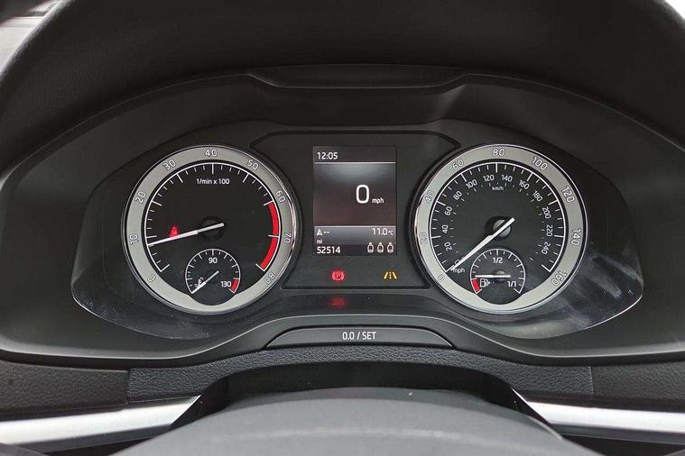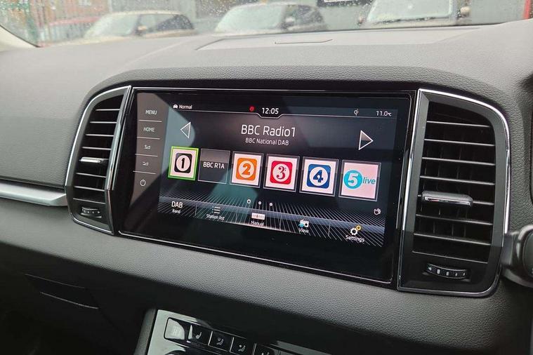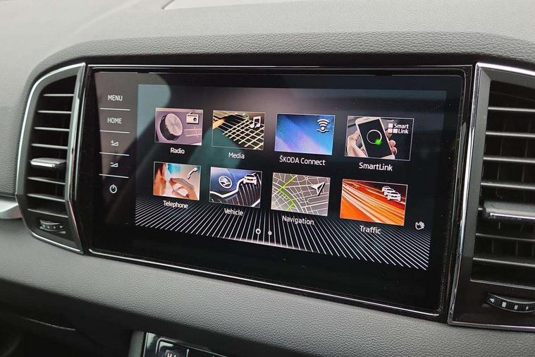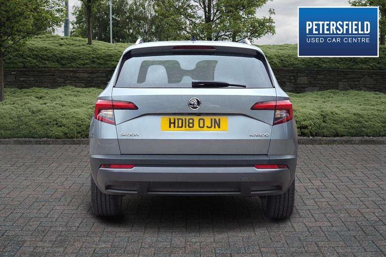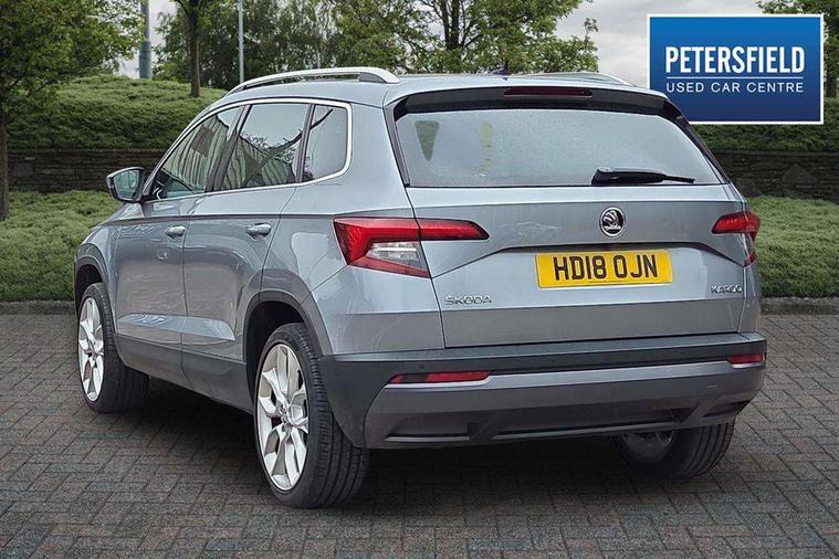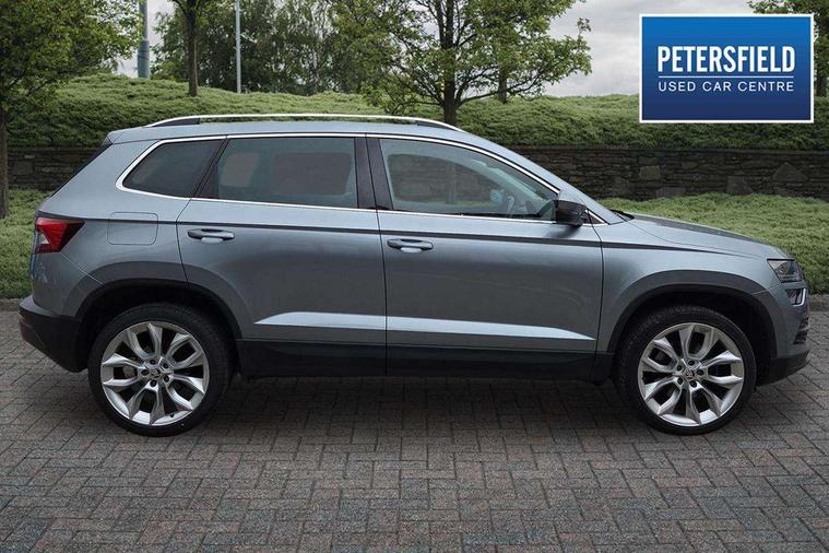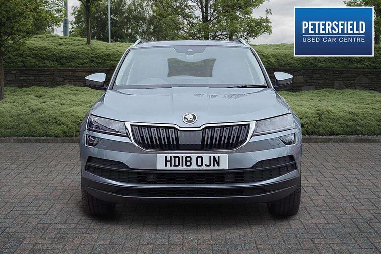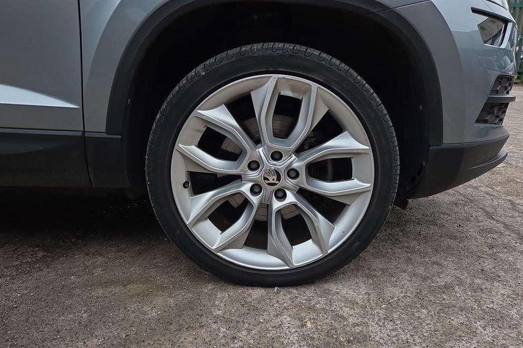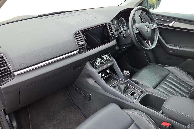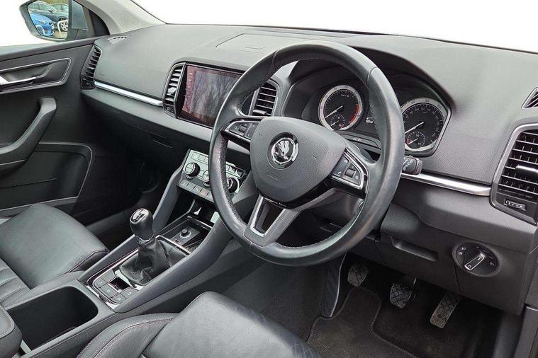 Columbus satellite navigation with 9.2" touch screen and integrated Wi-Fi, Drive mode selector, Driver alert system, Driver profile selection, Electro-mechanical PAS, Fatigue detection system, Front and rear parking sensors, Lane change assist and blind spot monitor, Multifunction colour trip computer, Outside temperature gauge, Power boot opening and closing, Rear view camera, Service interval indicator, Speed limiter, Travel assist with traffic sign recognition, Voice control system, Bolero Radio, DAB Digital radio, SD card slot, USB connection, Acoustic glass, Aero wiper + intermittent function, Aluminium window surround, Automatic headlight control system, Body colour door handles, Body colour door mirrors, Body coloured bumpers, Chrome roof rails, Electric adjustable heated door mirrors with boarding spots and memory function, Electric folding door mirrors, Electric front windows, Electric rear windows with child safety lock, Front doors reflectors, Full LED headlights + adaptive front light system + LED daytime running lights and front cornering fog lights, Headlight washers, Heated rear window, Light assistant (coming home/tunnel light), Panoramic sunroof, Privacy glass, 12V Accessory socket in centre console, 12V power point in luggage area, 3 rear height adjustable headrests, 4 lashing points on luggage floor, 60/40 split fold rear seat back, Bottle holders, Chrome inner door handles, Driver's lumbar support, Dual zone automatic air conditioning with humidity sensor and control, Electrically adjustable front seats + drivers door mirror with memory, Floor mats, Folding tables on the front seat backrests, Front centre armrest with storage compartment, Front seat and rear pockets, Front/rear reading lights, Height adjustable front head restraints, Height/reach adjust steering wheel, Illuminated air conditioned glovebox, Illuminated luggage compartment, Isofix system on outer rear seats, Leather upholstery, Luggage compartment cover, Parcel shelf - retractable, Passenger lumbar support, Passenger side net compartment on centre console, Pollen filter, Removable LED light in boot, Storage box in dash, Storage under front passenger seat, Sunglasses storage, Sunvisors with illuminated vanity mirrors, Umbrella under front passenger seat, Varioflex individually removeable/folding rear seats, LED Interior lighting pack - Karoq, 3 point front/outer rear seatbelts+pre-tensioners, 3x3 point rear seatbelts, ABS, Automatic unlocking of doors in case of impact, Curtain airbags, Driver and passenger airbags, Driver and passenger side airbags, Drivers knee airbag, Electronic parking brake, ESP including MBA, MSR, ASR, EDL, HBA, Front assist including city emergency braking, Fuel supply cut off, Head airbags, Hill hold control, Passenger airbag deactivate switch, Seatbelt warning lamp, Two tone horn, Tyre pressure monitor, Alarm with interior monitoring and tilt sensor, Anti-theft wheel bolts, Electronic immobiliser, Keyless entry and keyless start, Remote central locking, Chrome air vent surrounds, 19" Crater silver alloy wheels,