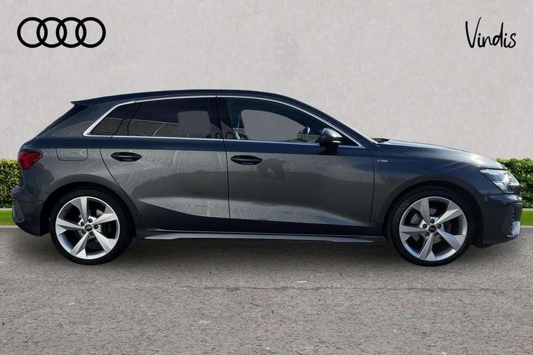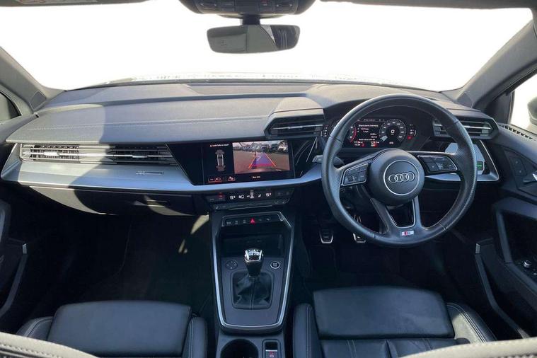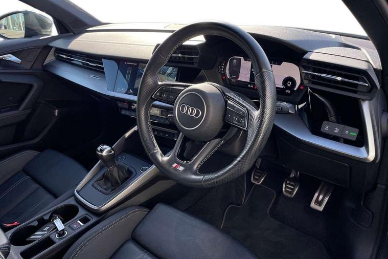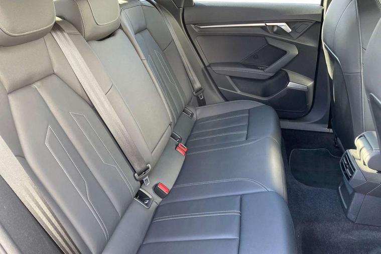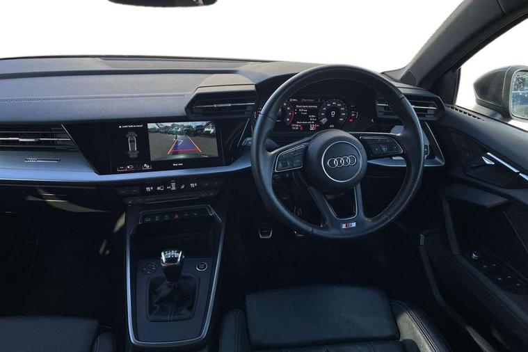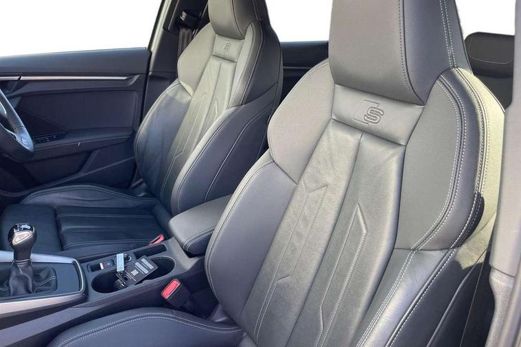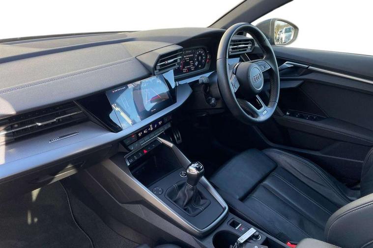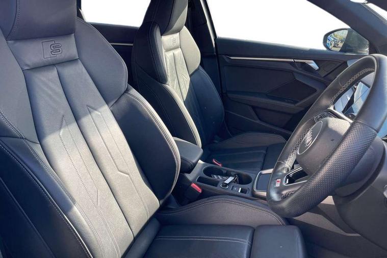 Audi drive select (Auto, Comfort, Dynamic, Efficiency and Individual), Audi smartphone interface, Audi Virtual Cockpit - 10.25" digital and colour instrument cluster, Automatic start/stop system with recuperation, Bluetooth interface, Collision avoidance assistant, Cruise control, e-Call (emergency call), Electromechanical power speed sensitive steering, Lane departure warning system, MMI Navigation Plus with high resolution 10.1" colour touch screen display, Rear parking sensors, Service indicator, Trip computer, Voice control system with natural language interaction, 2xUSB-C connection with data and charging functions, 6 passive loudspeakers, DAB Digital radio, 3rd brake light, Acoustic glass windscreen, Aluminium window trim, Auto dimming frameless rear view mirror, Electrically adjustable/heated/folding/auto dimming door mirrors with integrated LED indications + kerb view function for passenger side, Front electric windows, Illuminated aluminium inserts front door sills with S logo, LED daytime running lights, LED headlights with LED rear lights and dynamic rear indicators, Light and rain sensors, Privacy glass - dark tinted rear window, rear door and side windows, Rear electric windows, Rear side air outlets in grained matt black, Rear side wing doors, Rear wiper, S line bumpers, S roof spoiler, 12V socket and storage compartment in front centre console, 3 seat bench in 2nd row, 40/20/40 split folding rear seat bench with cupholder, Black cloth headlining, Dual zone electronic climate control, Front and rear centre armrest in leather, Front and rear headrests, Front/rear floor mats, Height and reach adjustable steering wheel, Illuminated vanity mirror, Interior lighting - glove compartment light and right hand side, Luggage compartment floor covering, Manual boot compartment lid, Manually adjustable front seats, Seat side bolsters, Single front passenger seat, Stainless steel pedals and front footrest in black, Twin leather upholstery with front sports seats S embossed logo, Aluminium interior elements pack - A3 Sportback, LED interior lighting pack - A3 Sportback, S line styling pack - A3 Sportback, 3x3 point rear seat belts, Audi pre sense front, Driver and front passenger airbag with passenger airbag deactivation, Electronic Stabilisation Control (ESC) including ABS, ASR and EDL, First aid kit with warning triangle and 2 safety vests, Front side airbags with head airbags and interaction airbag, Pre-sense front with pedestrian and cyclist detection, Seatbelt monitoring, Tyre pressure loss indicator, Anti theft alarm, Anti-theft wheel bolts, Electronically operated child lock, Immobiliser, Remote control central locking, Accent surfaces in the dashboard and centre console in platinum grey silk effect paint finish, Dark spectrum aluminium inlays,