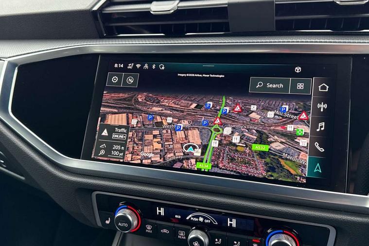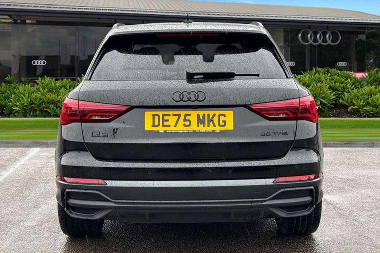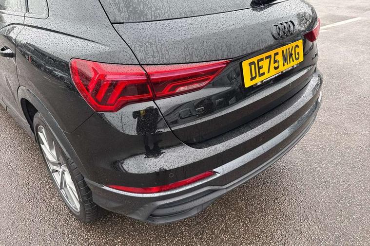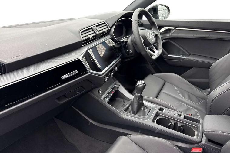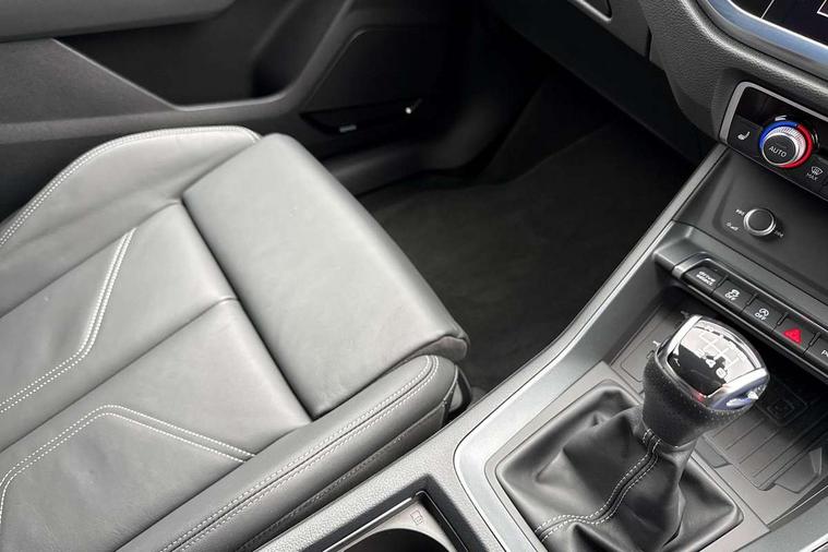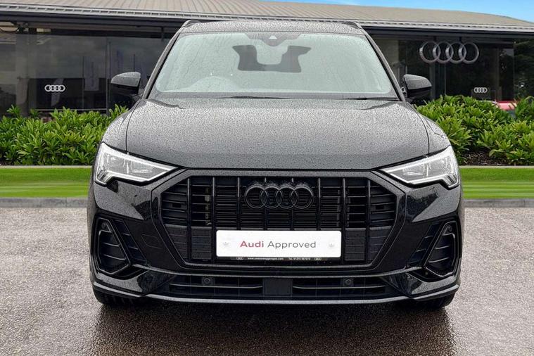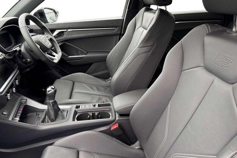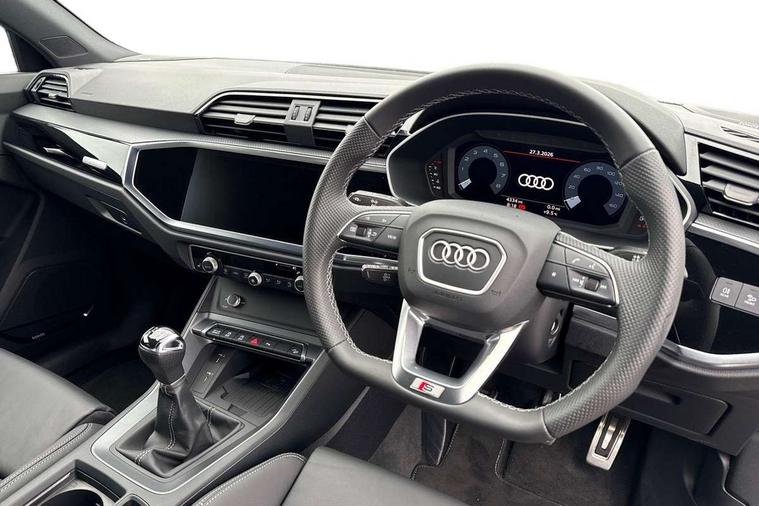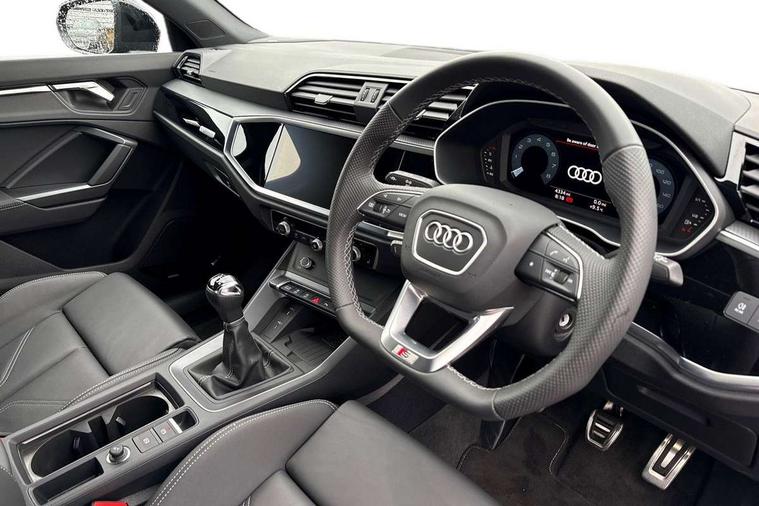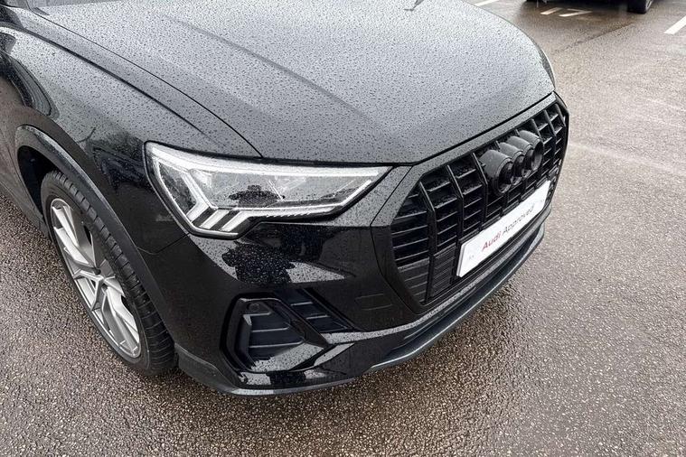Amazon alexa Integration, Audi connect safety and service, Audi drive select, Audi lane departure warning, Audi Virtual Cockpit - 10.25" display, Bluetooth interface, Camera based traffic sign recognition, Cruise control + speed limiter, Distraction and Fatigue warning, Legal emergency call, MMI Navigation Plus with high resolution 10.1 inch touchscreen colour display, Power operated tailgate, Progressive steering, Rear parking sensors, Service interval indicator, Smartphone interface includes wireless Apple carplay/Android Auto, Start stop system with recuperation, Voice control system with natural language interaction, Sports suspension, 2 USB-C ports with charge and data functions, 6 passive loudspeakers, DAB digital radio module, Acoustic windscreen, Anthracite black radiator grille, Audi Beam uses LEDs to project the Audi logo onto the ground as you exit your Q3, Auto dimming door mirrors, Auto dimming frameless rear view mirror, Black roof rails, Electrically folding, adjustable and heated door mirrors with integrated LED side indicators and kerb view function for passenger side, Front and rear electric windows, Front fog lights, Grille vertical bars in aluminium silver/Matt, High gloss black finish B and C pillars, LED Dynamic rear indicators, LED headlights with LED daytime running lights, LED rear lights, LED third brake light, Privacy glass dark tinted rear and rear-side windows (from B-pillar backwards), Rain and light sensors, Rear diffuser grille in grained matt black, Rear diffuser strip in matt anthracite black, Rear side wing doors, Rear wiper, S line bumpers in contrasting Manhattan grey, Variable front intermittent wipers, 12V socket in rear centre console, 3 seat bench in 2nd row, 3 spoke flat bottomed multi-function leather sport steering wheel, 40:20:40 folding with manual adjustment for 60:40 forwards/backwards position and backrest angle, Adjustable rear seat bench/backrest with centre armrest and cupholder, Black carpet mats, Black cloth headlining, Dual zone electronic climate control, Electric lumbar support, Front and rear black floor mats with contrast stitching in rock grey, Front and rear headrests, Front centre armrest, Height and reach adjustable steering wheel, Illuminated door sill trims with S logo, ISOFIX child seat mounting for front passenger with airbag deactivation and outer rear seat including top tether attachment point for outer rear seats, Luggage compartment sill protection in stainless steel, Manual front seats with height adjustment, Perforated leather gearknob, Single front passenger seat, Stainless steel pedals, Twin leather upholstery with front sport seats + S embossing, Black styling pack - Q3, Non smoking pack - Q3, 3x3 point rear seatbelts, 6 airbags - Driver, front passenger, curtain and side windows, Audi pre-sense front with pedestrain and cyclist recognition, Electrically operated child locks on rear doors, Electromechanical parking brake, Electronic stabilisation control including ABS, ASR and EDL, Front seatbelt reminder, Hill descent control, Hill hold assist, Pre sense basic, Seatbelt monitoring, Tyre pressure warning, Warning triangle and first aid kit, Anti theft wheel bolts, Immobiliser, Remote central locking, Thatcham approved category 1 anti theft alarm, Aluminium look interior elements, Detail dashboard around MMI touch colour display in glass look, black with surround in aluminium look, Leatherette door armrest, Piano black inlay,