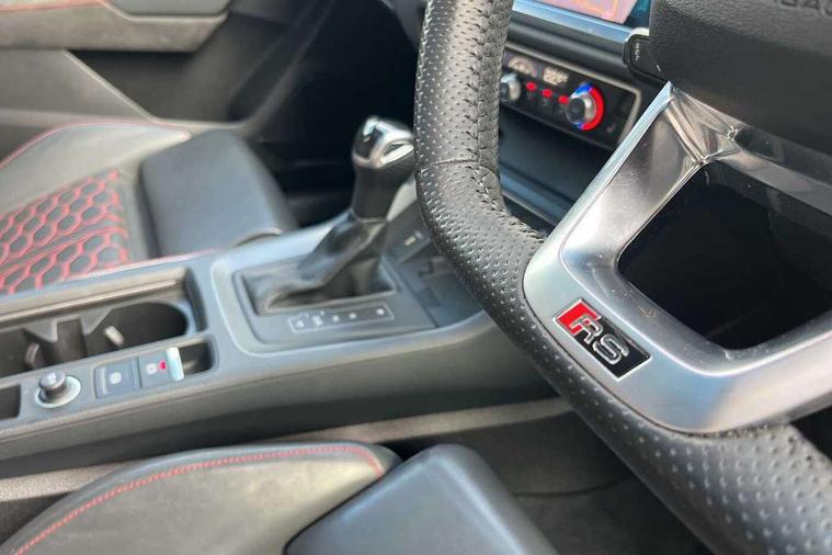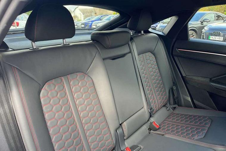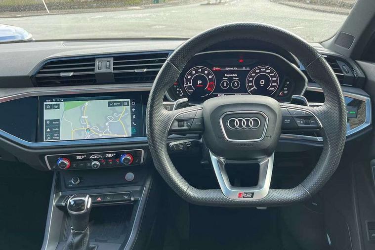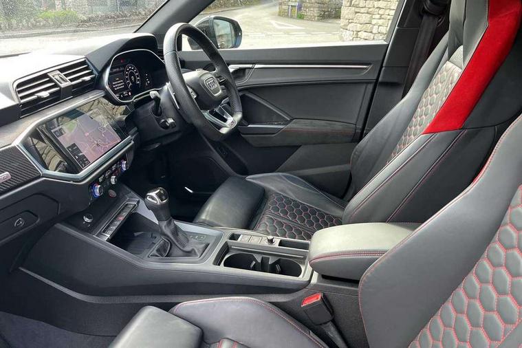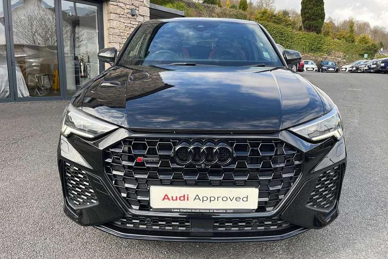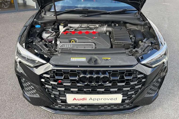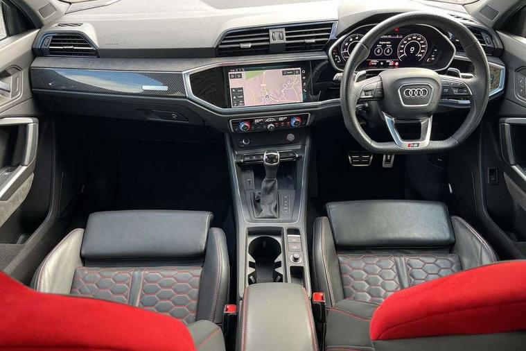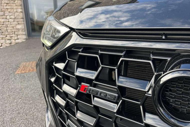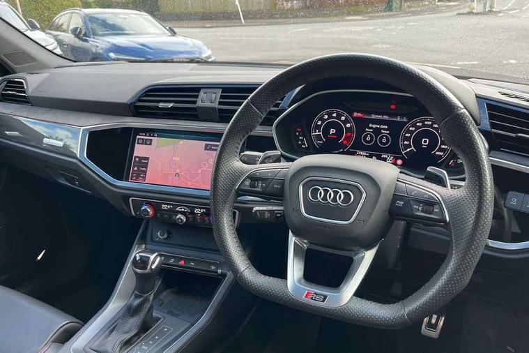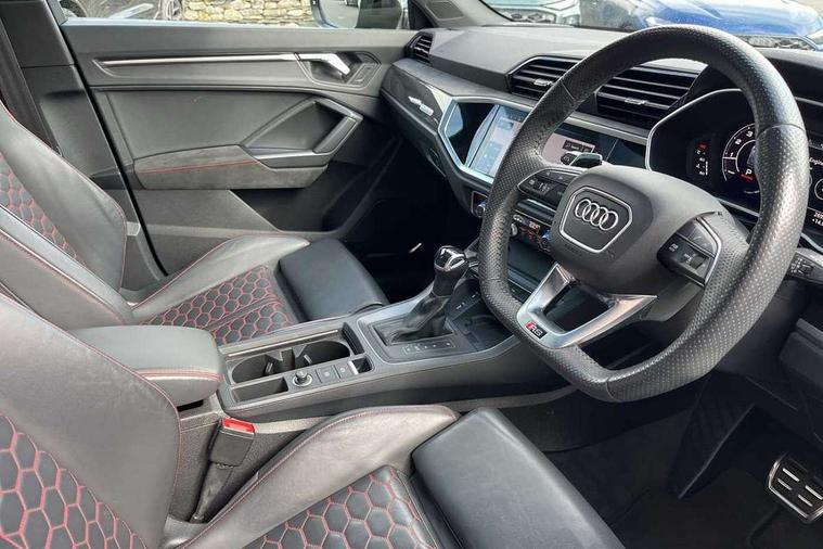 360 degree parking camera, Audi connect safety and service (e-call), Audi drive select with new RS modes, Audi lane departure warning, Audi parking system plus with front and rear sensors, Audi phone box with wireless charging, Audi side assist, Audi virtual cockpit plus - 12.3 inch display, Bluetooth interface, Camera based traffic sign recognition, MMI Navigation Plus with high resolution 10.1 inch touchscreen colour display, Power operated tailgate, Progressive steering, Rear cross traffic alert, Smartphone interface includes wireless Apple carplay/Android Auto, Start stop system with recuperation, Voice control system with natural language interaction, Quattro all wheel drive, RS sports suspension plus, 1 x USB type C and 1 USB type A charging points, Bang + Olufsen 3D sound system, DAB digital radio module, Acoustic windscreen, Audi Beam uses LEDs to project the Audi Sport logo, Auto dimming door mirrors, Auto dimming frameless rear view mirror, Body colour rear spoiler with lip in gloss black, Carbon door mirror housings, Dark tinted Matrix LED headlights with dynamic front and rear indicators, Electrically folding, adjustable and heated door mirrors with integrated LED side indicators and kerb view function for passenger side, Flared wheel arches, Flat slits on single frame grille, Headlight washers, High gloss black finish B and C pillars, Honeycomb radiator grille in gloss black, Illuminated door sill trims with RS logo, LED rear lights, Panoramic glass sunroof, Privacy glass dark tinted rear and rear-side windows (from B-pillar backwards), Rain and light sensors, RS specific bumpers with large front air inlets in black, RS Sport exhaust system, dual branch with exhaust flap control and gloss black oval tailpipe trims, 3 zone electronic climate control, 4 way electric lumbar support for driver and front passenger, Adjustable rear seat bench/backrest with centre armrest and cupholder, Black Alcantara elements - dashboard and the armrests in the front and rear doors, Black cloth headlining, Electrically adjustable front seats, Fine Nappa leather upholstery with front sports seats + honeycomb stitching and RS embossed logo, Flat bottom multifunction leather steering wheel with shift paddles in gloss black with aluminium trim + mode button, contrast stitching and RS emblem, Front and rear floor mats, Front and rear head restraints, Front centre armrest, Heated front seats, ISOFIX child seat mounting for front passenger with airbag deactivation and outer rear seat including top tether attachment point for outer rear seats, Stainless steel luggage compartment sill finisher, Stainless steel pedals, Black styling pack - RS Q3, Driver assistance pack - RS Q3, Multi-coloured extended ambient lighting pack - RS Q3, Non smoking pack - RS Q3, 3x3 point rear seatbelts, 6 airbags - Driver, front passenger, curtain and side windows, Audi pre-sense front with pedestrain and cyclist recognition, Electrically operated child locks on rear doors, Electromechanical parking brake, Electronic stabilisation control including ABS, ASR and EDL, Hill descent control, Hill hold assist, Pre sense basic, RS brake system, Seatbelt monitoring, Tyre pressure warning, Warning triangle and first aid kit, Advanced key, Anti theft alarm, Anti theft wheel bolts, Aluminium look interior elements, Carbon twill inlays, Detail dashboard around MMI touch colour display in glass look, black with surround in aluminium look, Tool kit, Tyre repair kit,