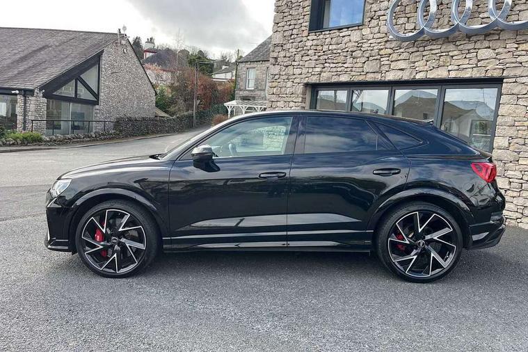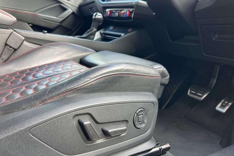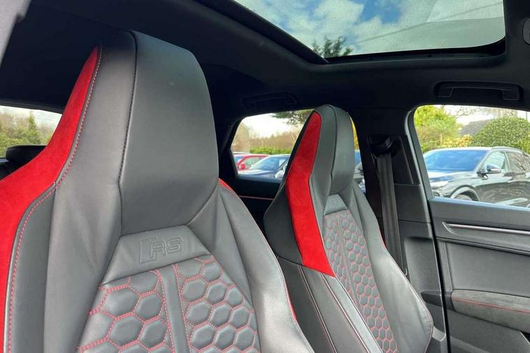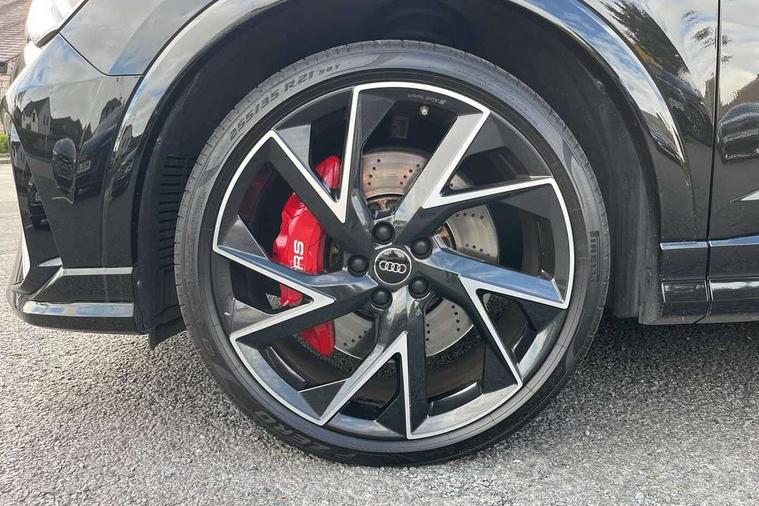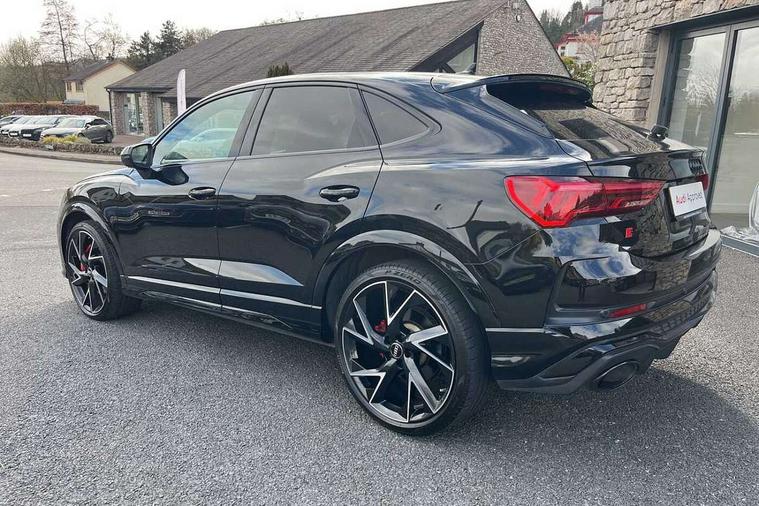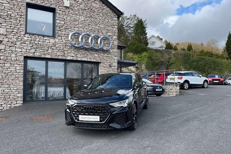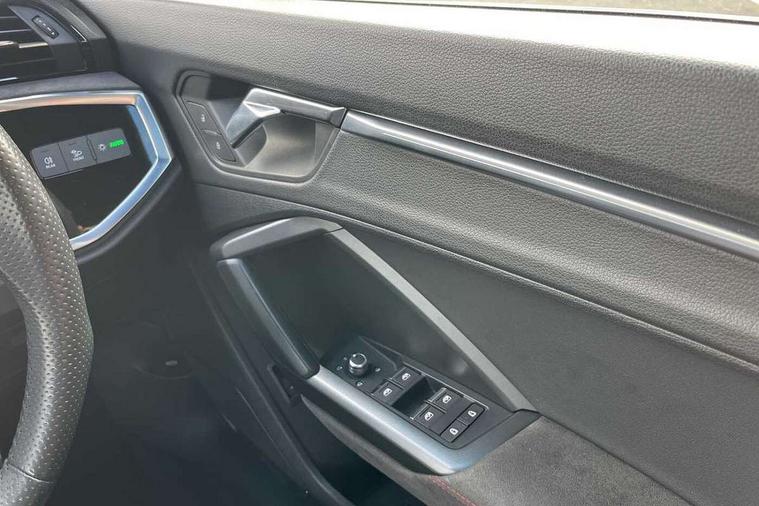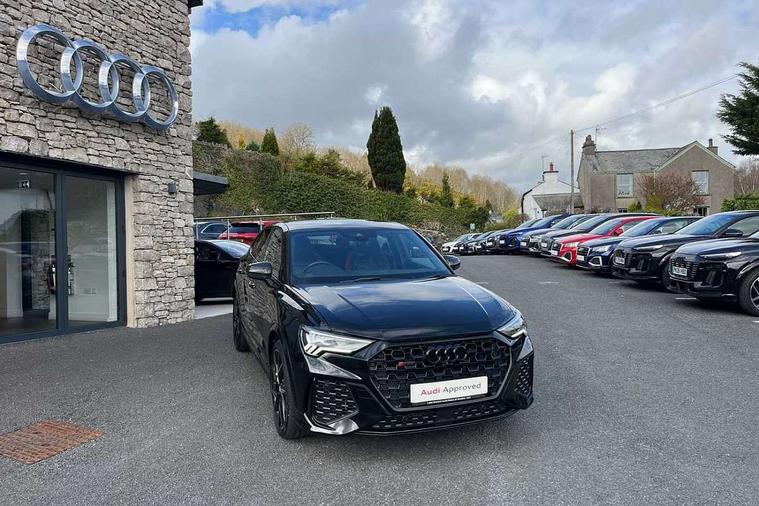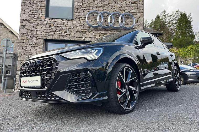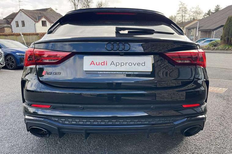 360 degree parking camera, Audi connect safety and service (e-call), Audi drive select with new RS modes, Audi lane departure warning, Audi parking system plus with front and rear sensors, Audi phone box with wireless charging, Audi side assist, Audi virtual cockpit plus - 12.3 inch display, Bluetooth interface, Camera based traffic sign recognition, MMI Navigation Plus with high resolution 10.1 inch touchscreen colour display, Power operated tailgate, Progressive steering, Rear cross traffic alert, Smartphone interface includes wireless Apple carplay/Android Auto, Start stop system with recuperation, Voice control system with natural language interaction, Quattro all wheel drive, RS sports suspension plus, 1 x USB type C and 1 USB type A charging points, Bang + Olufsen 3D sound system, DAB digital radio module, Acoustic windscreen, Audi Beam uses LEDs to project the Audi Sport logo, Auto dimming door mirrors, Auto dimming frameless rear view mirror, Body colour rear spoiler with lip in gloss black, Carbon door mirror housings, Dark tinted Matrix LED headlights with dynamic front and rear indicators, Electrically folding, adjustable and heated door mirrors with integrated LED side indicators and kerb view function for passenger side, Flared wheel arches, Flat slits on single frame grille, Headlight washers, High gloss black finish B and C pillars, Honeycomb radiator grille in gloss black, Illuminated door sill trims with RS logo, LED rear lights, Panoramic glass sunroof, Privacy glass dark tinted rear and rear-side windows (from B-pillar backwards), Rain and light sensors, RS specific bumpers with large front air inlets in black, RS Sport exhaust system, dual branch with exhaust flap control and gloss black oval tailpipe trims, 3 zone electronic climate control, 4 way electric lumbar support for driver and front passenger, Adjustable rear seat bench/backrest with centre armrest and cupholder, Black Alcantara elements - dashboard and the armrests in the front and rear doors, Black cloth headlining, Electrically adjustable front seats, Fine Nappa leather upholstery with front sports seats + honeycomb stitching and RS embossed logo, Flat bottom multifunction leather steering wheel with shift paddles in gloss black with aluminium trim + mode button, contrast stitching and RS emblem, Front and rear floor mats, Front and rear head restraints, Front centre armrest, Heated front seats, ISOFIX child seat mounting for front passenger with airbag deactivation and outer rear seat including top tether attachment point for outer rear seats, Stainless steel luggage compartment sill finisher, Stainless steel pedals, Black styling pack - RS Q3, Driver assistance pack - RS Q3, Multi-coloured extended ambient lighting pack - RS Q3, Non smoking pack - RS Q3, 3x3 point rear seatbelts, 6 airbags - Driver, front passenger, curtain and side windows, Audi pre-sense front with pedestrain and cyclist recognition, Electrically operated child locks on rear doors, Electromechanical parking brake, Electronic stabilisation control including ABS, ASR and EDL, Hill descent control, Hill hold assist, Pre sense basic, RS brake system, Seatbelt monitoring, Tyre pressure warning, Warning triangle and first aid kit, Advanced key, Anti theft alarm, Anti theft wheel bolts, Aluminium look interior elements, Carbon twill inlays, Detail dashboard around MMI touch colour display in glass look, black with surround in aluminium look, Tool kit, Tyre repair kit,