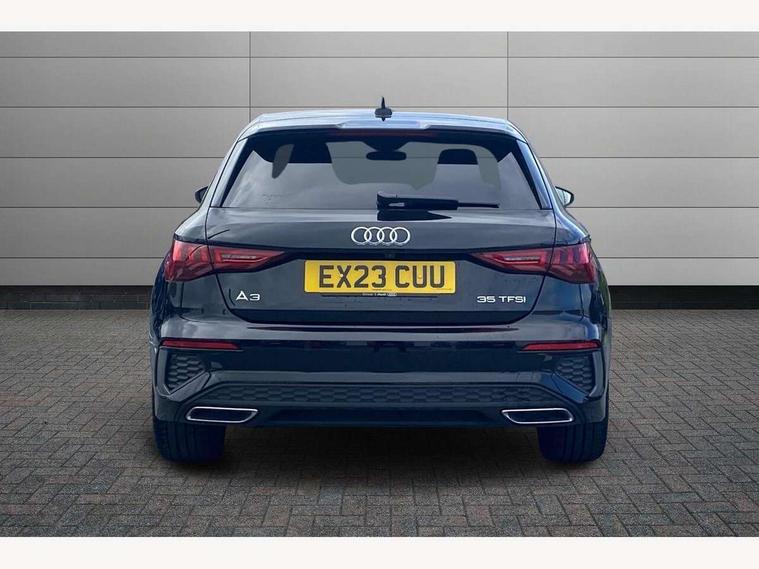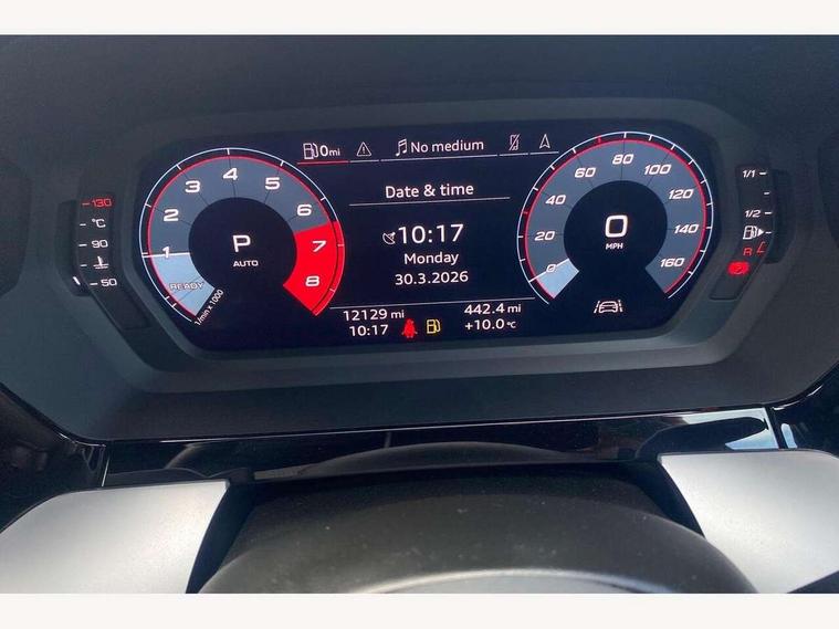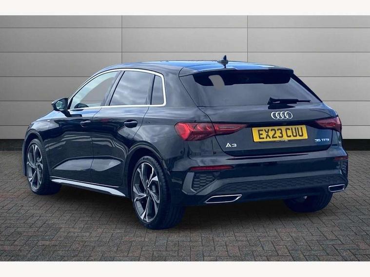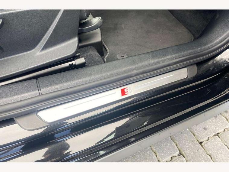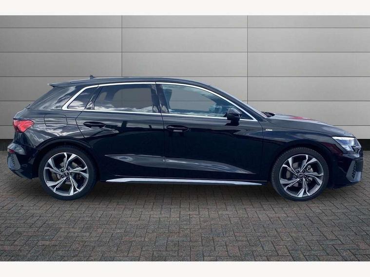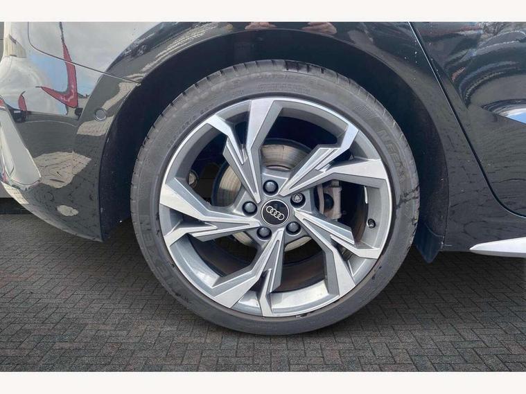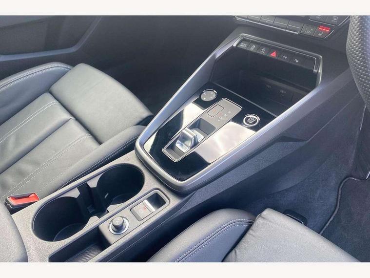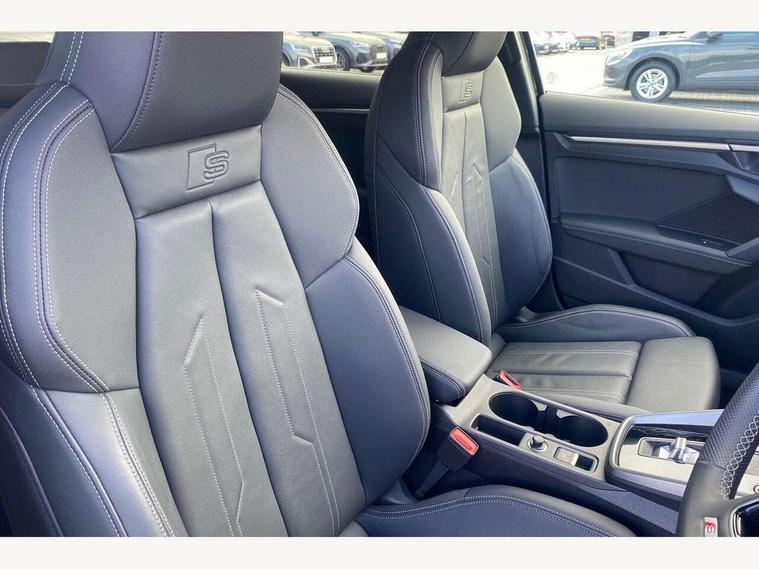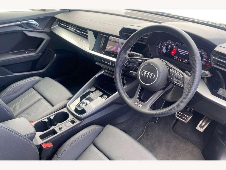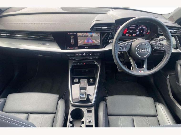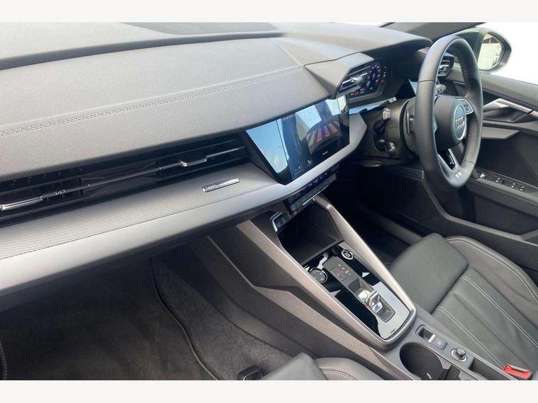 Audi drive select (Auto, Comfort, Dynamic, Efficiency and Individual), Audi smartphone interface, Audi Virtual Cockpit - 10.25" digital and colour instrument cluster, Automatic start/stop system with recuperation, Bluetooth interface, Collision avoidance assistant, e-Call (emergency call), Electromechanical power speed sensitive steering, Lane departure warning system, MMI Navigation Plus with high resolution 10.1" colour touch screen display, Service indicator, Trip computer, Voice control system with natural language interaction, Sports suspension, 2xUSB-C connection with data and charging functions, 6 passive loudspeakers, DAB Digital radio, 3rd brake light, Acoustic glass windscreen, Aluminium window trim, Auto dimming frameless rear view mirror, Body colour exterior mirrors, Electrically adjustable/heated/folding/auto dimming door mirrors with integrated LED indications + kerb view function for passenger side, Front electric windows, Illuminated aluminium inserts front door sills with S logo, LED daytime running lights, LED headlights with LED rear lights and dynamic rear indicators, Light and rain sensors, Privacy glass - dark tinted rear window, rear door and side windows, Rear electric windows, Rear side air outlets in grained matt black, Rear side wing doors, Rear wiper, S line bumpers, S roof spoiler, 12V socket and storage compartment in front centre console, 3 seat bench in 2nd row, 3 spoke leather multifunction steering wheel with paddle shift, 4 way electrically adjustable lumbar support for driver and front passenger, 60/40 split folding rear seat bench, Black cloth headlining, Dual zone electronic climate control, Front and rear centre armrest in leather, Front and rear headrests, Front/rear floor mats, Height and reach adjustable steering wheel, Interior lighting - glove compartment light and right hand side, Luggage compartment floor covering, Manual boot compartment lid, Manually adjustable front seats, Seat side bolsters, Single front passenger seat, Stainless steel pedals and front footrest in black, Twin leather upholstery with front sports seats S embossed logo, Aluminium interior elements pack - A3 Sportback, LED interior lighting pack - A3 Sportback, S line styling pack - A3 Sportback, 3x3 point rear seat belts, Driver and front passenger airbag with passenger airbag deactivation, Electronic Stabilisation Control (ESC) including ABS, ASR and EDL, First aid kit with warning triangle and 2 safety vests, Front side airbags with head airbags and interaction airbag, Pre-sense front with pedestrian and cyclist detection, Seatbelt monitoring, Tyre pressure loss indicator, Anti theft alarm, Anti-theft wheel bolts, Electronically operated child lock, Immobiliser, Remote control central locking, Dark spectrum aluminium inlays, accent surfaces in the dashboard and centre console in platinum grey silk effect paint finish,