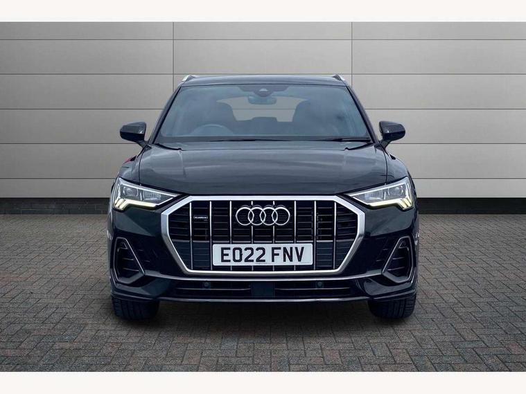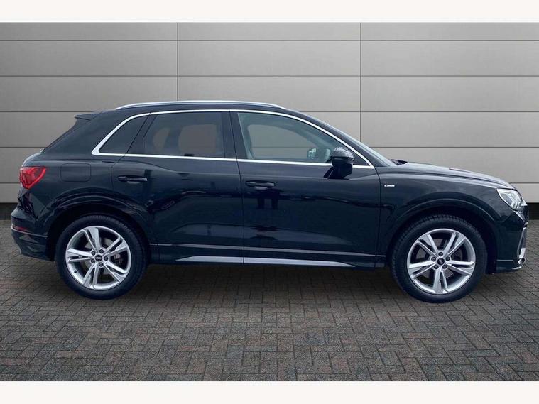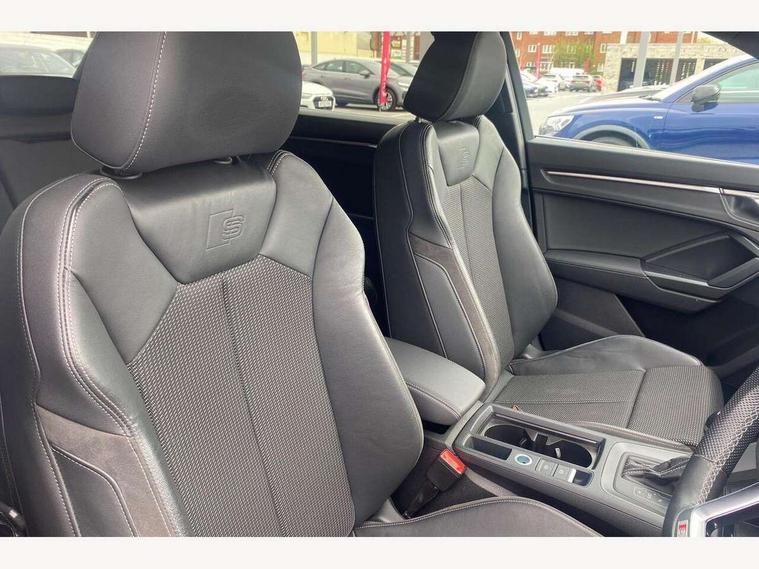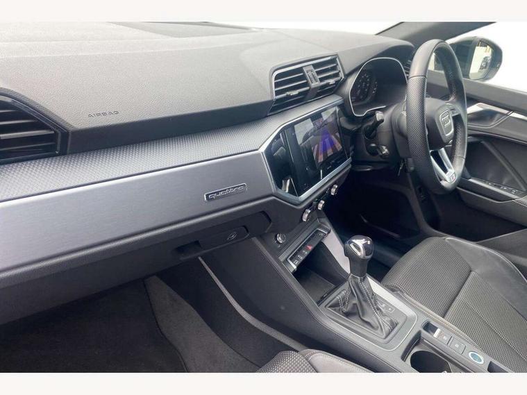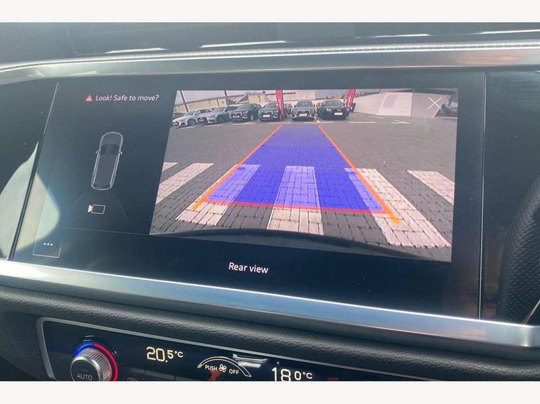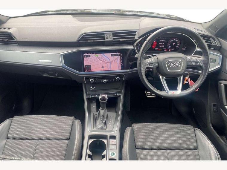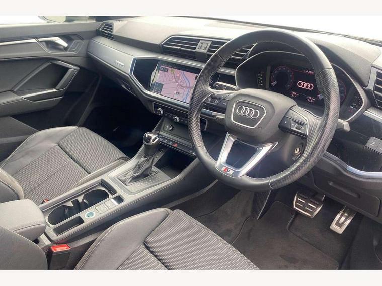 Amazon alexa Integration, Audi connect safety and service (e-call), Audi drive select, Audi lane departure warning, Audi Virtual Cockpit - 10.25" display, Bluetooth interface, Camera based traffic sign recognition, MMI Navigation Plus with high resolution 10.1 inch touchscreen colour display, Power operated tailgate, Progressive steering, Service interval indicator, Smartphone interface includes wireless Apple carplay/Android Auto, Start stop system with recuperation, Voice control system with natural language interaction, Sports suspension, 2 USB-C ports with charge and data functions, 6 passive loudspeakers, DAB digital radio module, Acoustic windscreen, Aluminium roof rails, Aluminium window trim, Auto dimming frameless rear view mirror, Body coloured bumpers, Electrically folding, adjustable and heated door mirrors with integrated LED side indicators and kerb view function for passenger side, Front and rear electric windows, Front fog lights, Front side air inlets in matt platinum grey, Front spoiler blade in matt platinum grey, Grille vertical bars in aluminium silver/Matt, High gloss black finish B and C pillars, LED headlights with LED daytime running lights, LED rear lights, LED third brake light, Privacy glass dark tinted rear and rear-side windows (from B-pillar backwards), Rain and light sensors, Rear diffuser strip in matt titanium black, Rear side wing doors, Rear wiper, S line badges on front wings, S Line front and rear bumpers, Side skirt insert in matt Platinium grey, Silver chrome grille surround, Tinted rear windows, Titanium black radiator grille, Variable front intermittent wipers, 12V socket in rear centre console, 3 seat bench in 2nd row, 40:20:40 folding with manual adjustment for 60:40 forwards/backwards position and backrest angle, Adjustable rear seat bench/backrest with centre armrest and cupholder, Black cloth headlining, Dual zone electronic climate control, Front and rear black floor mats with contrast stitching in rock grey, Front and rear headrests, Front and rear roof module including reading lights, Front centre armrest, Glove compartment lighting, Height and reach adjustable steering wheel, Illuminated door sill trims with S logo, ISOFIX child seat mounting for front passenger with airbag deactivation and outer rear seat including top tether attachment point for outer rear seats, Luggage compartment light, Manual front seats with height adjustment, Perforated leather gearknob, Single front passenger seat, Stainless steel luggage compartment sill finisher, Stainless steel pedals, Non smoking pack - Q3, 3x3 point rear seatbelts, 6 airbags - Driver, front passenger, curtain and side windows, Audi pre-sense front with pedestrain and cyclist recognition, Electrically operated child locks on rear doors, Electromechanical parking brake, Electronic stabilisation control including ABS, ASR and EDL, Front seatbelt reminder, Hill descent control, Hill hold assist, Pre sense basic, Seatbelt monitoring, Tyre pressure warning, Warning triangle and first aid kit, Anti theft alarm, Anti theft wheel bolts, Immobiliser, Remote central locking, Dark matt brushed aluminium inlay, Detail dashboard around MMI touch colour display in glass look, black with surround in aluminium look, Leatherette door armrest,