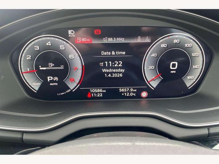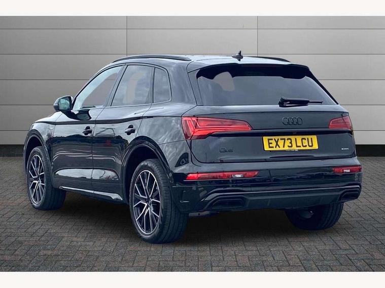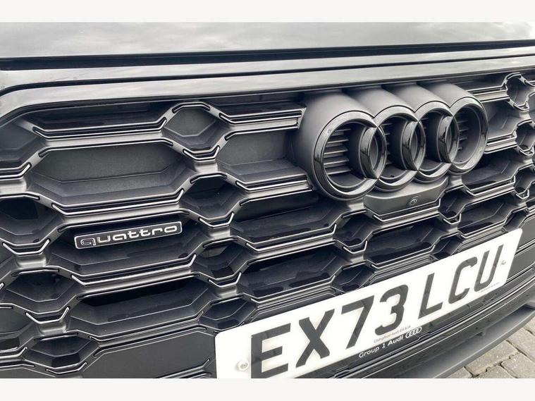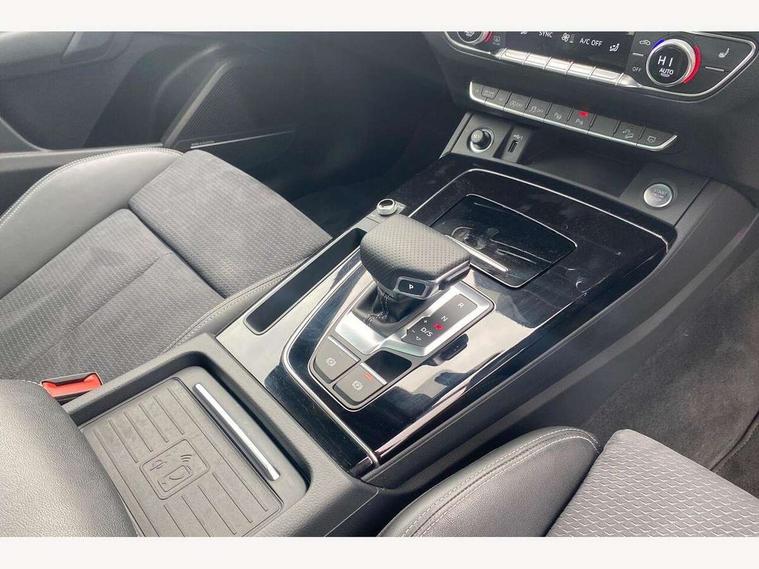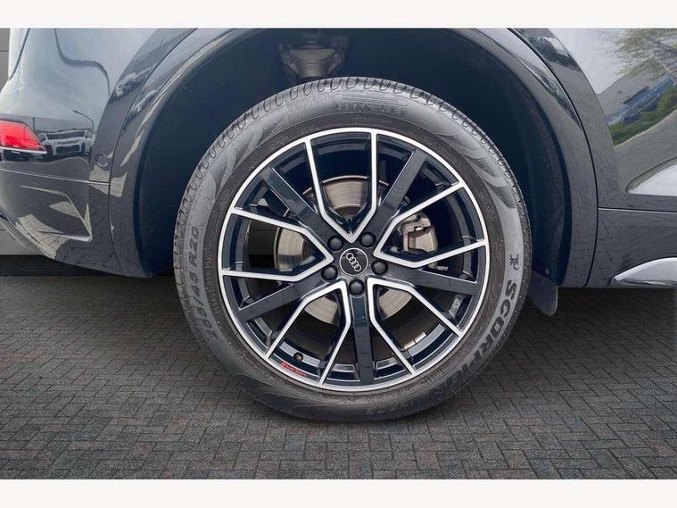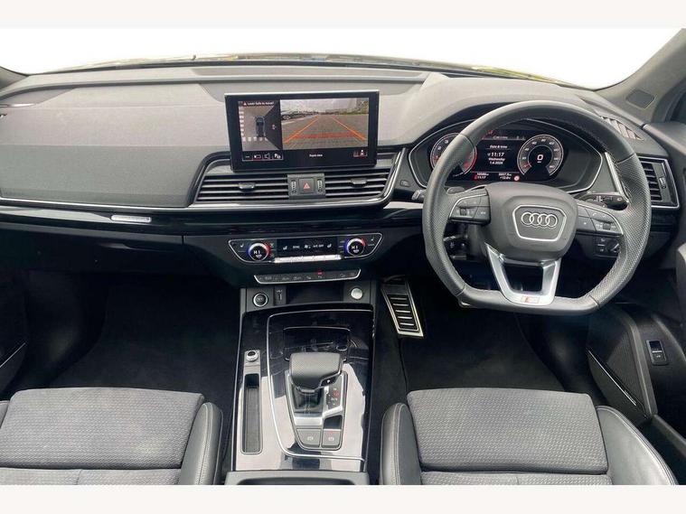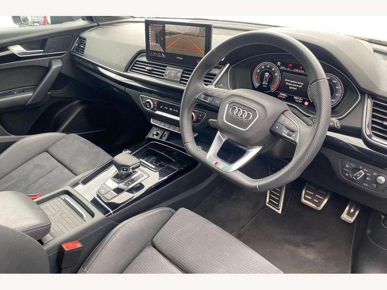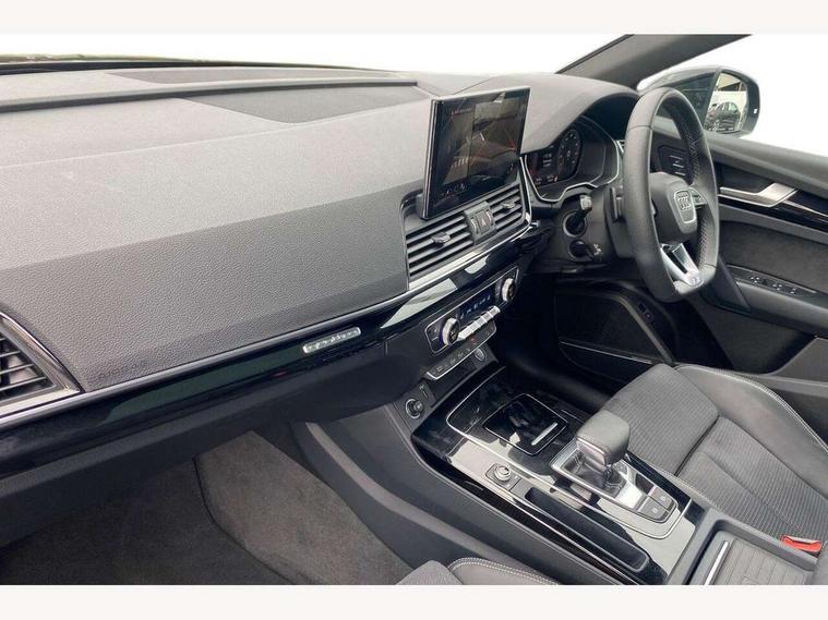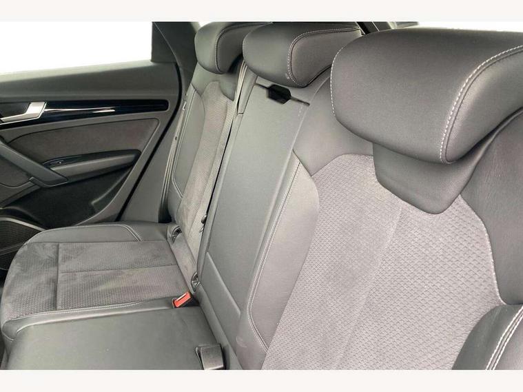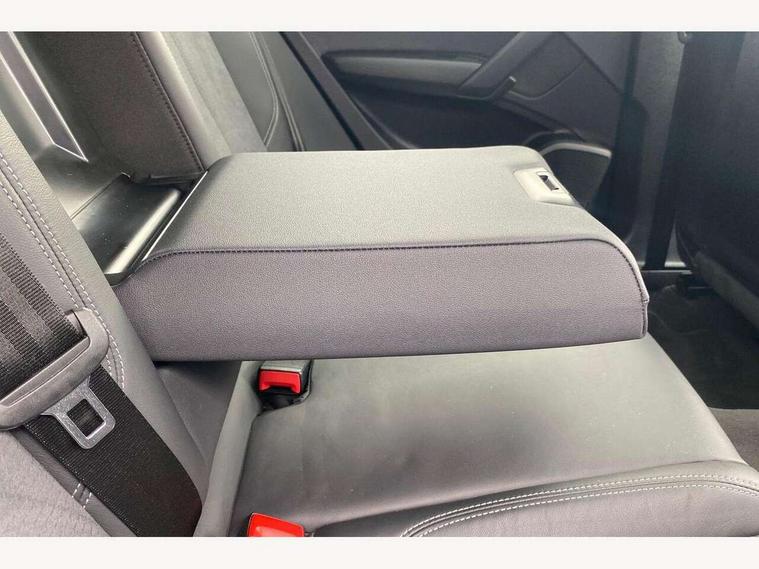 Acoustic front and rear parking sensor, Audi connect safety and service (e-call), Audi drive select, Audi virtual cockpit plus with 12.3" screen and three different layout designs, Audi wireless smartphone interface, Automatic start-stop system with coasting functionality and efficiency programme, Bluetooth interface, Camera based traffic sign recognition, Electro - mechanical power assisted steering, Lane departure warning, MMI navigation plus with 10.1" touch screen, Power tailgate, Reversing camera, Service interval indicator, Voice control system with Audi hotword activation "Hey Audi", Quattro on demand, S line sports suspension, 2 x USB charging port with aux input socket, 8 loudspeakers, DAB Digital radio, Acoustic windscreen, Auto dimming door mirrors, Auto dimming frameless rear view mirror, Automatic headlight adjustment, Automatic headlights and windscreen wipers, Black roof rails, Black styling with black rings, Body colour bumpers, Body colour rear diffuser with matt aluminium silver surrounds, Body colour underbody protection, Chrome plated exhaust trims, Daytime running lights, Door sills in Selenite silver, Electric adjustable/heated/folding door mirrors, Front air inlet surrounds in aluminium, Front and rear electric windows, Front radiator grille in honeycomb design, LED 3rd brake light, LED headlights and LED tail lights, Loading edge protection in stainless steel, Lower bumpers painted in contrast Manhattan grey, Rear chrome trim strip below lights, Rear privacy glass and rear side windows, Rear side wing doors, Rear wiper, Roof bars, S Line badges on the front wing panels, S Line front and rear bumpers, S Line rear spoiler, S Line side skirts, 3 rear headrests, Black cloth headlining, Comfort front centre armrest, Contrast stitching on seats, steering wheel and gear lever gaiter, Deluxe 3 zone electronic climate control, Front head restraints, Front sport seats with S embossed logo, Front/rear floor mats, Gear lever in black leather, Heated front seats, Height/reach adjustable steering column, Illuminated door sill trims with S logo, Luggage compartment cover, Manual seat adjustment with 4-way electric lumbar support, Single front passenger seat, Stainless steel pedals, Sunvisors with vanity mirrors, Top surface of the rear centre armrest in artificial leather, High gloss pack - Q5, LED interior light pack - Q5, 3 point seatbelts on all seats, 6 airbags - Driver, front passenger, curtain and side airbags, Attention and drowsiness assist, Electrically operated child locks on rear doors, Electromechanical parking brake, Electronic stabilisation control including ABS, ASR and EDL, First aid kit with warning triangle and vests, Front passenger airbag deactivation, Hill descent control, Hill hold assist, ISOFIX child seat mounting for front passenger seat and ISOFIX child seat mounting with Top Tether for outer rear seats, Multi collision brake assist, Pop-up bonnet for pedestrian protection, Pre sense city, Seatbelt monitoring, Tyre pressure warning, Anti theft alarm, Anti-theft wheel bolts, Remote central locking, Remote control key with SAFELOCK and keyless go, Air vents inserts and centre console in gloss black, Tool kit, Tyre repair kit,