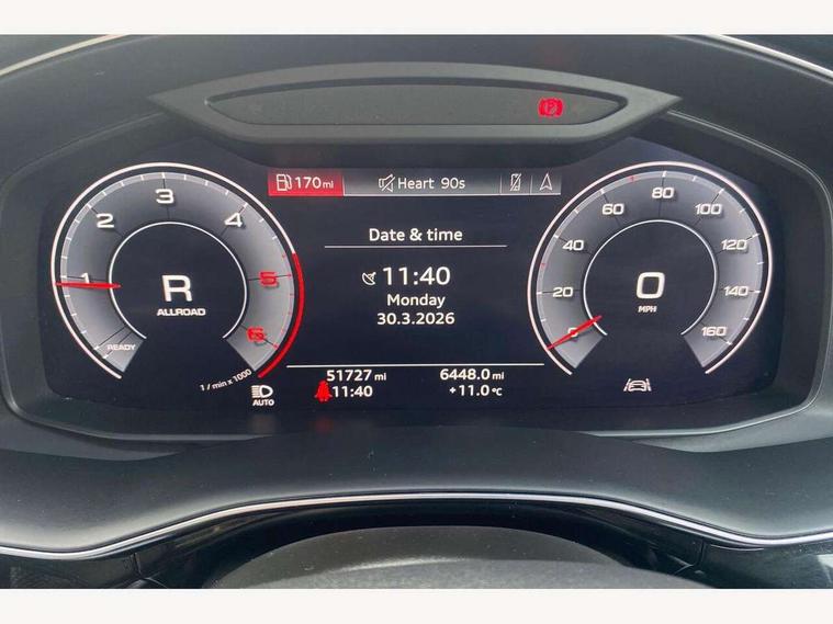 10.1" and 8.6" Dual colour touchscreens, Audi connect safety and service (e-call), Audi drive select, Audi lane departure warning, Audi phone box with wireless charging, Audi smartphone interface, Automatic start/stop system, Electro-mechanical PAS, Low washer fluid indicator, MMI - Multi Media Interface control system, MMI navigation plus with MMI touch, On board computer, Operating buttons in black, glass look with haptic feedback, Power operated tailgate, Rear view camera, Service interval indicator, Virtual cockpit, Voice control system, Adaptive air suspension, Diesel particulate filter, 2 USB ports, Audi music interface, Aux-in socket, DAB Digital radio, Acoustic windscreen, Auto dimming rear view mirror, Coming/leaving home lighting function, Electric front+rear windows, Electric/heated/folding door mirrors with memory, HD Matrix LED headlights with dynamic front and rear indicators, Headlight washers, Heat insulating glass, LED daytime running lights, LED signature DRL, Privacy glass, Rain and light sensors, Rear wiper, S line badges on front wings, S Line body styling, S line front and rear bumpers, air inlets and door trim strips, 4 way electrically adjustable lumbar support for drivers seat, 4 way electrically adjustable lumbar support for front passenger seat, 40:20:40 split folding rear bench seat, Black cloth headlining, Door sill trims with S line logo, Front centre armrest with storage compartment and angle adjustment, Front head restraints, ISOFIX on front passenger and rear outer seats, Luggage compartment sill protection in stainless steel, Rear centre armrest with 2 cupholders, Rear headrests, Self-locking centre differential, Stainless steel pedals, Sunvisors with illuminated vanity mirrors, Tool kit, Top tether anchor plate for isofix child seat, 3 point seatbelts on all seats, ABS, Curtain airbags, Driver and passenger airbags, EDL + ASR, Electromechanical parking brake, Electronic stability control, ESP, Front passenger airbag deactivation, Front side airbags, Hill descent control, Hill hold assist, Pre sense front, Predictive pedestrian protection, Seatbelt warning, Traction control, Tyre pressure monitoring system, Warning triangle and first aid kit, Anti theft alarm, Anti-theft wheel bolts and wheel loosening detection, Immobiliser, Keyless Go access/ignition system, Remote central locking, Tyre repair kit,