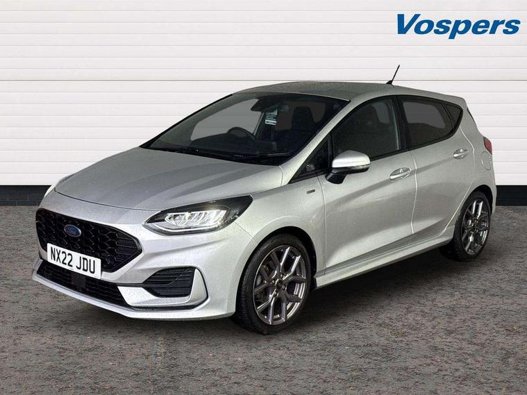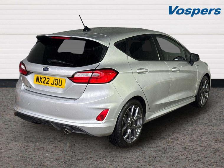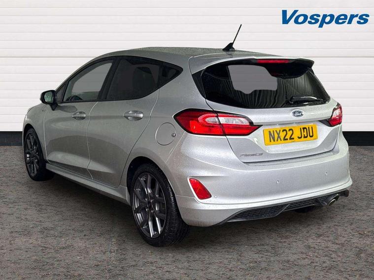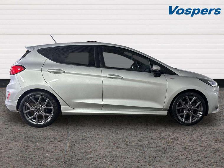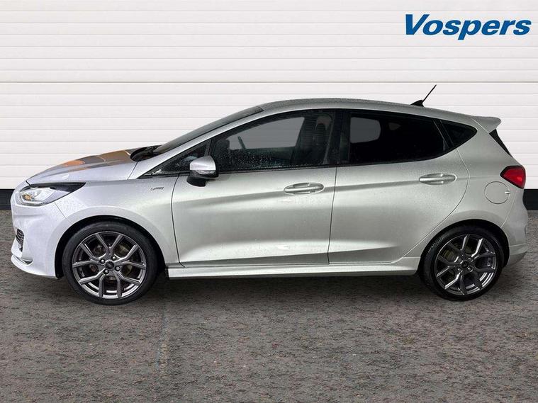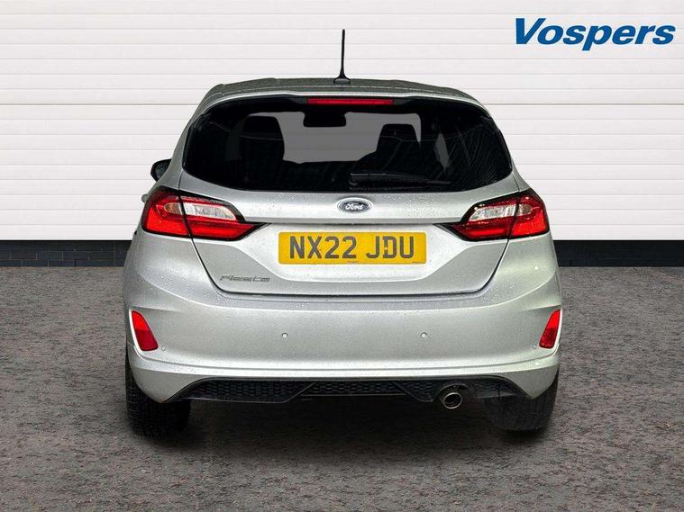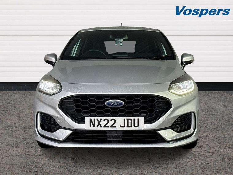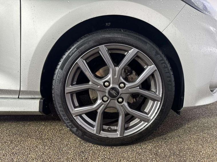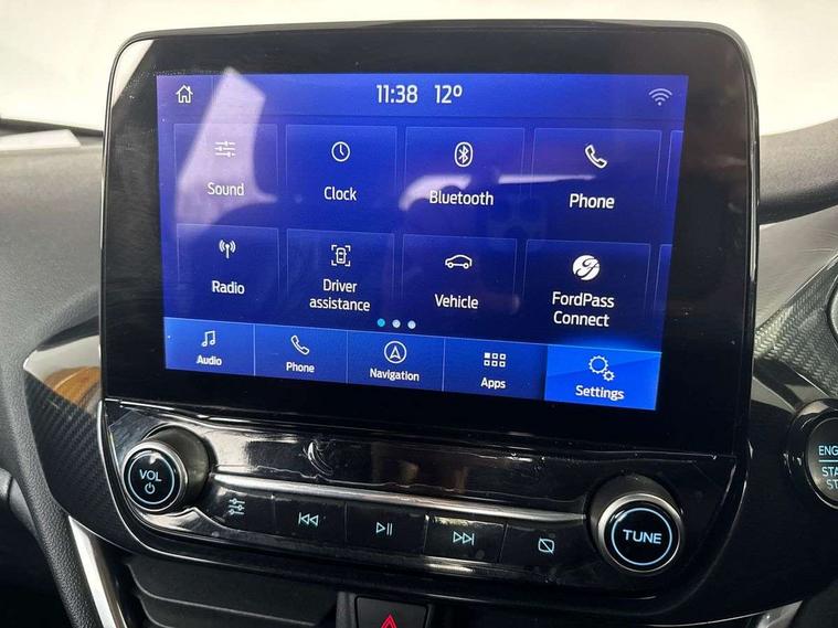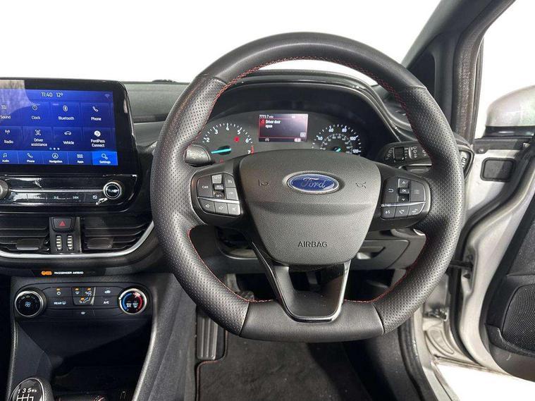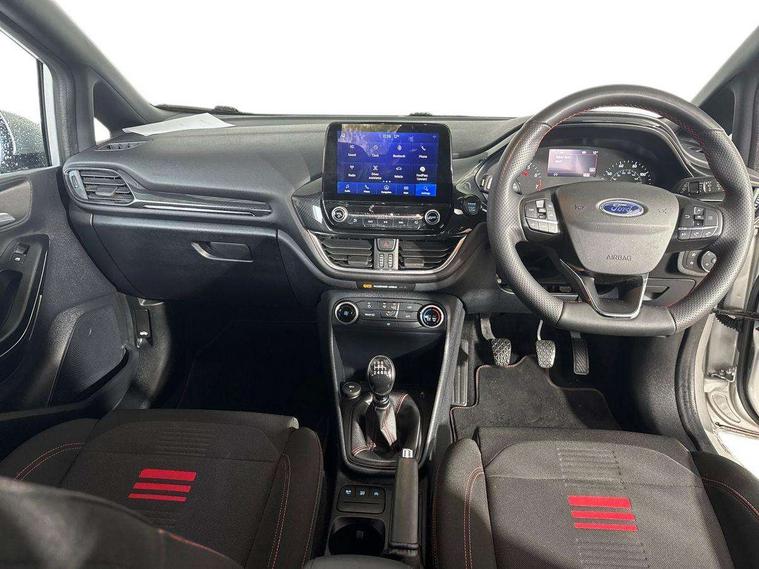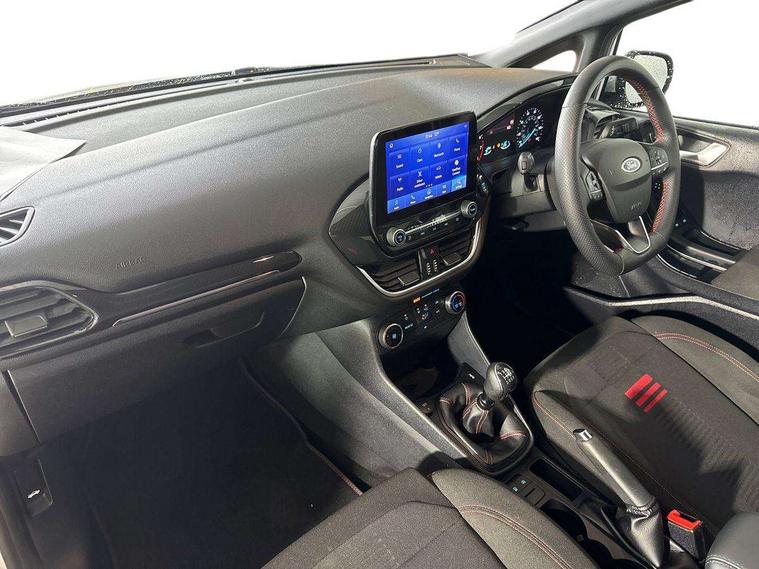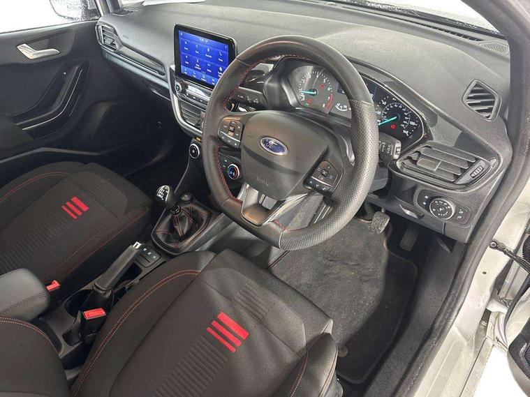 4.2" Colour TFT Ice blue illumination analogue cluster, Driver alert system, Electric power steering, Ford easy fuel, Ford SYNC 3 Nav with DAB radio, 8" touch screen, voice control, emergency assist, Apple CarPlay/Android auto, 2x USB, 6 speaker, Ford pass connect, Rear parking distance sensors, Selectable drive modes (Normal, Sport, Track), Speed sign recognition, Trip computer, Sports suspension, 3rd brake light, Auto high beam, Body colour bumpers, Body colour large rear spoiler, Body coloured electrically operated with side indicators, Electric front windows/one touch facility, Quickclear heated windscreen, Rain sensing wipers and auto dimming rear view mirror, Rear privacy glass, Rear side wing doors, Rear wiper, Red air vent inserts, Unique ST-Line upper grille & full bodystyling kit with ST-Line wing badges, 3 seat bench in 2nd row, Adjustable head restraints, Black headlining, Centre console with opening armrest, 2x cupholders, 12v and USB, Cloth upholstery with red stitching, Drivers and Passenger lumbar support, Front floor mats in velour, Leather gaiter, Manual 2 way passenger seat adjust, Manual 4-way driver seat adjust, Manual air conditioning, Sensico wrapped steering wheel, Single front passenger seat, NCAP Pack - Fiesta, 3 point seatbelts on all rear seats, Electronic stability control with hill start assist, Tyre pressure monitoring system, Keyless start with 'Ford Power' starter button, MyKey system, Remote central locking, Thatcham alarm with power door dead locks, 17" 5x2 spoke alloy wheels with rock metallic finish,