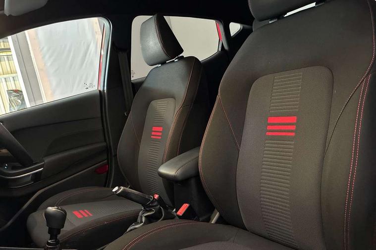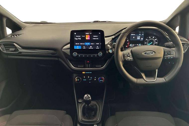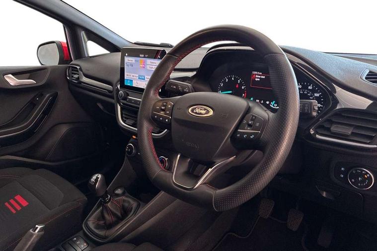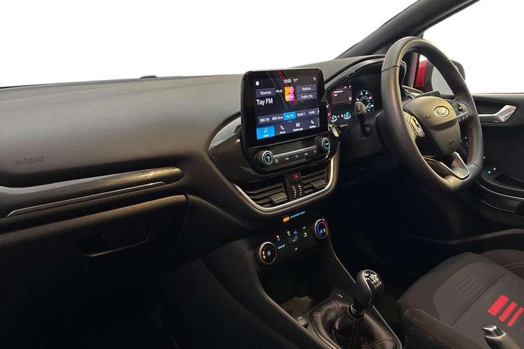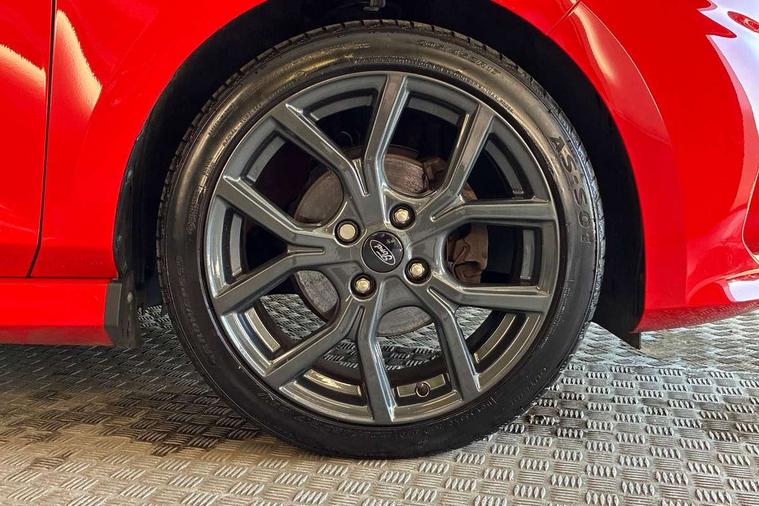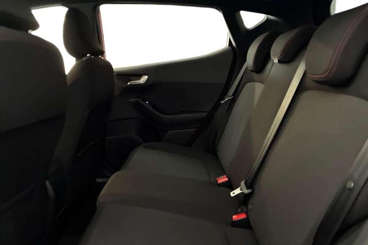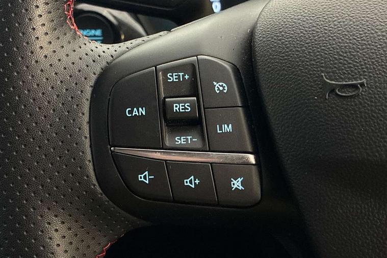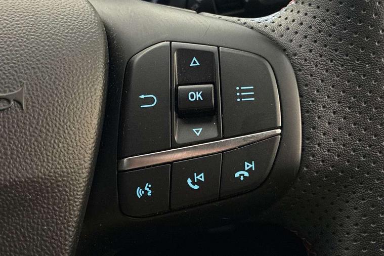 4.2" Colour TFT Ice blue illumination analogue cluster, Driver alert system, Electric power steering, Ford easy fuel, Lane keep assist, Lane keeping aid, Rear parking distance sensors, Selectable drive modes (Normal, Sport, Track), Trip computer, Sports suspension, 3rd brake light, Auto high beam, Automatic headlights, Body colour bumpers, Body colour large rear spoiler, Body coloured electrically operated with side indicators, Electric front windows/one touch facility, Electric rear windows, Quickclear heated windscreen, Rain sensing wipers and auto dimming rear view mirror, Rear privacy glass, Rear side wing doors, Rear wiper, Unique ST-Line grille, full bodystyling kit and large body coloured rear spoiler, 3 rear headrests, 3 seat bench in 2nd row, Adjustable head restraints, Black headlining, Centre console with opening armrest, 2x cupholders, 12v and USB, Cloth upholstery with red stitching, Leather gear knob, Manual 2 way passenger seat adjust, Manual 4-way driver seat adjust, Manual air conditioning, Premium floor mats, Sensico wrapped steering wheel, Single front passenger seat, 3 point seatbelts on all rear seats, Electronic stability control with hill start assist, Front and rear seat belt warning, Manual child lock in rear doors, Tyre pressure monitoring system, Keyless start with 'Ford Power' starter button, MyKey system, Remote central locking, Thatcham alarm with power door dead locks, 17" 5x2 spoke alloy wheels with rock metallic finish,