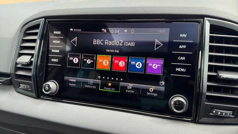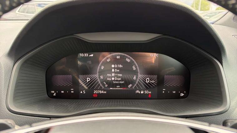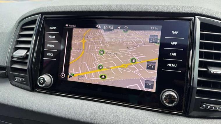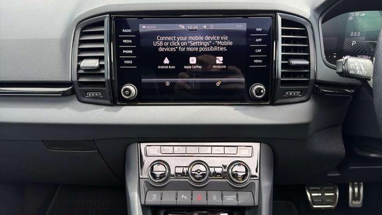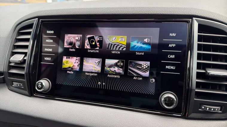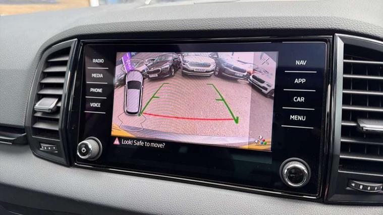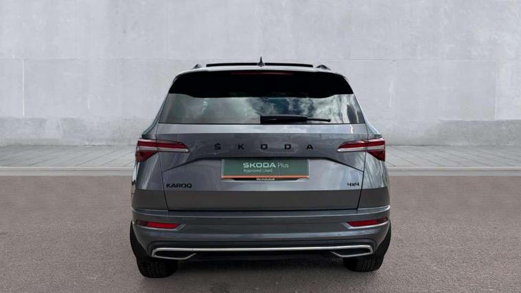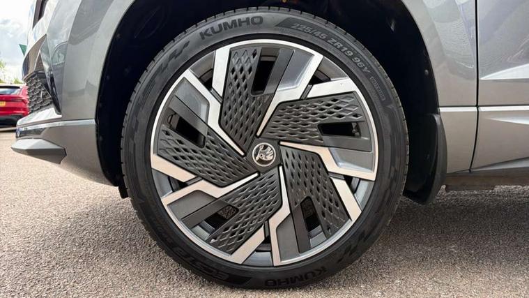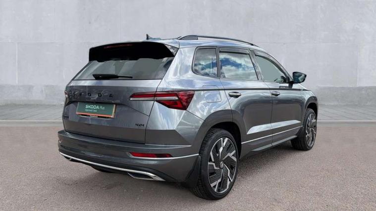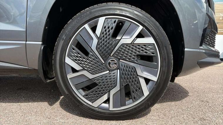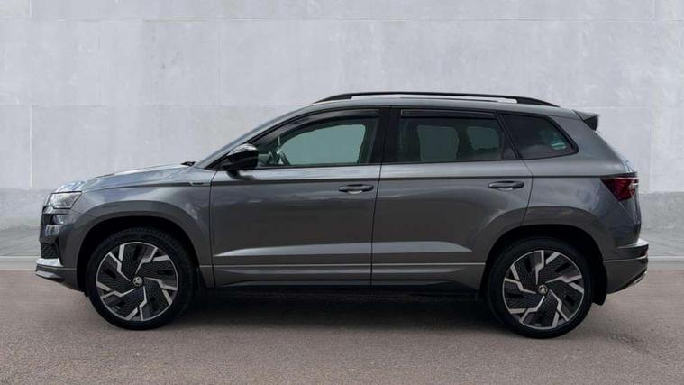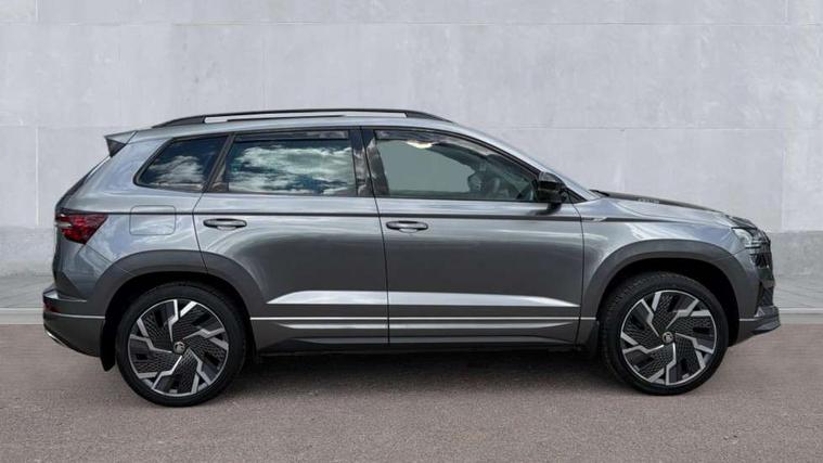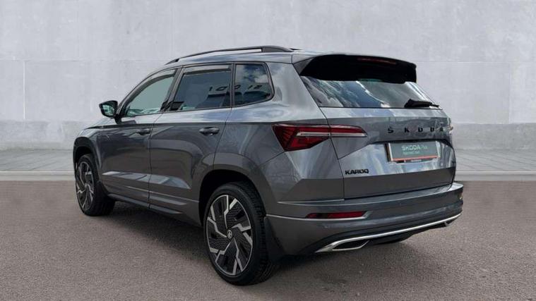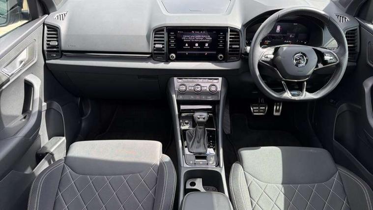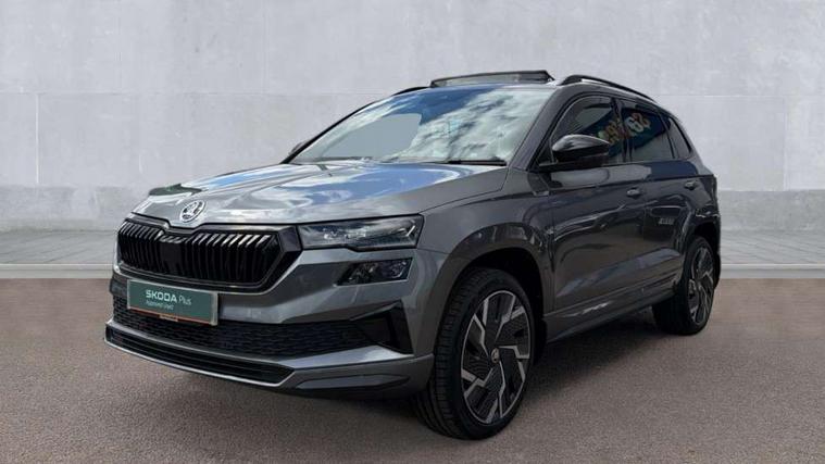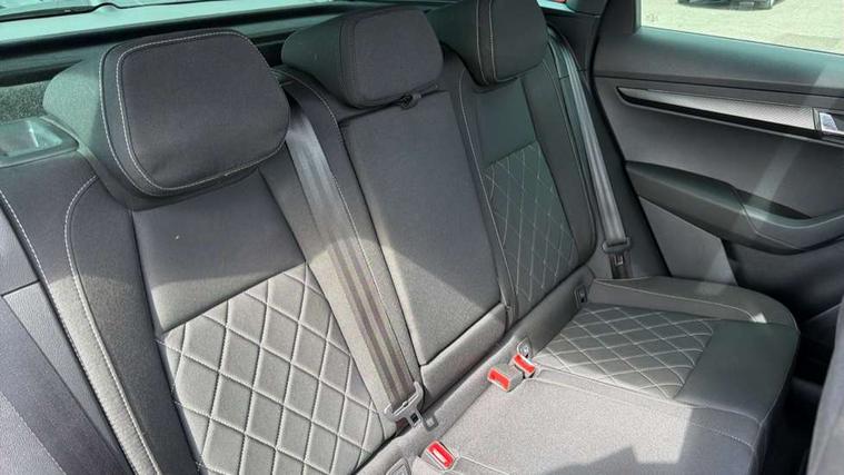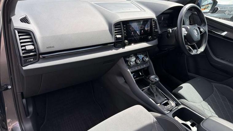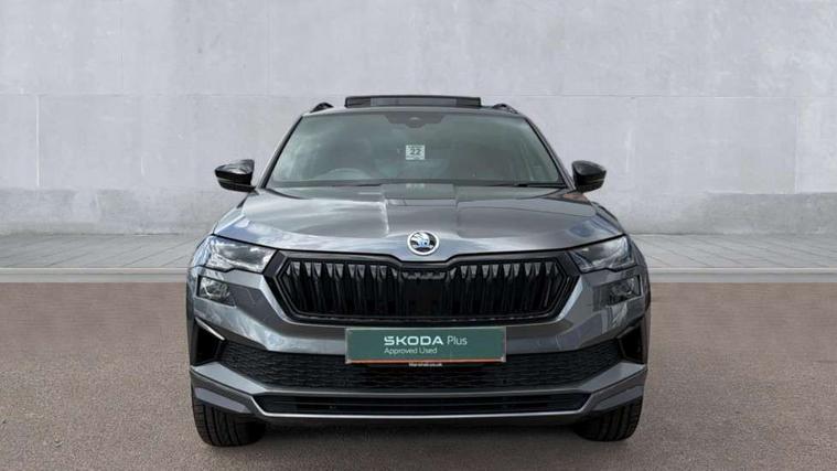 8" Digital display, Care connect, Driver fatigue sensor, Emergency services call system, Outside temperature gauge, Service interval indicator, SmartLink wireless for Apple and wired for Android, Start/stop system with regenerative braking, USB C Port x 2 in front centre console, Virtual pedal with electrically operated boot door, Diesel particulate filter, 8 Speakers, DAB radio with Bluetooth, USB connection, Acoustic glass, Aero front windscreen wipers with intermittent function, Auto dimming rear view mirror with light and rain sensors, Black door mirrors, Black electric window control buttons, Black radiator grille, Black roof rails, Body colour door handles, Dynamic headlight range control with cornering light function, Electric front and rear windows with child proof lock, Front door steps with SportLine logo, Heated rear windscreen, LED daytime running lights, LED rear lights with high functionality welcome effect and dynamic indicators, Light assistant (coming/leaving home/tunnel light), Panoramic sliding sunroof, Plastic scuff plates, Privacy glass, Protective door side sills in body colour, Rear diffuser, Rear side wing doors, Rear spoiler, Rear window wiper with washer system and intermittent control, Safety reflectors on front doors, Skoda lettering on tailgate in black, Sportline badge on front fender, Sportline decorative inserts with badging, Sports front and rear bumpers, Third brake light, 1.5 litre bottle holders in driver and front passenger door panels, 12V socket in boot, 12v socket in front centre armrest with storage compartment and rear air vents, 2 Folding hooks and nets in boot, 3 rear height adjustable headrests, 3 seat bench in 2nd row, 3 spoke leather sports multifunction steering wheel and silver stitching with gear shift paddles, 4 foldable roof handles with rear coat hooks, Black floor carpet, Black roof headlining, Chrome inner door handles, Double sided boot floor, Foldable hooks in the boot, Front head restraints, Height adjustable front three point seats belts with tensioners, Height/reach adjust steering wheel, Ice scraper, Illuminated glovebox, Illuminated luggage compartment, Interior noise suppression, Isofix child seat preparation outer rear, Manual lumbar support for front seats, Pen holder, Pollen filter, Rear boot cover, Rear reading lights, Rear seats fixed folding and divided 60:40, Rubbish bin door, Safety vest holder, Single front passenger seat, Storage box in upper central dashboard closed, Sunvisors with illuminated vanity mirrors, Textile floor mats, Ticket holder, Titan black interior ceiling, Welcome animation with sportline logo, Light Pack - Karoq, Parking pack - Karoq, Automatic door unlocking in case of crash, Automatic fuel cut off in case of crash, Child locks on rear doors, Driver airbag, Electronic parking brake with auto hold function, Emergency rear braking signal, ESC including ABS, MSR, ASR, EDS, HBA, DSR, RBS, MKB and traction control, Front side airbags, Hill hold control, Knee airbags, Passenger airbag with switch-off function, Pedestrian monitor, Seatbelt reminder signalisation and pretensioner for all seats, Three point seatbelts rear, Two tone horn, Tyre pressure display, Tyre pressure monitor, Alarm with interior monitoring, back up horn and tilt sensor with safe function, Electronic engine immobiliser, Keyless entry and start/stop, Remote central locking with 2 remote folding keys, Black air vent surround, Black centre console, Satin black dashboard, Satin black door trim, 19" Sagitarius anthracite alloy wheels with matt black aero inserts, Anti-theft wheel bolts protection, Matt black aero hub caps, Storage on wheel cover, Tool kit,