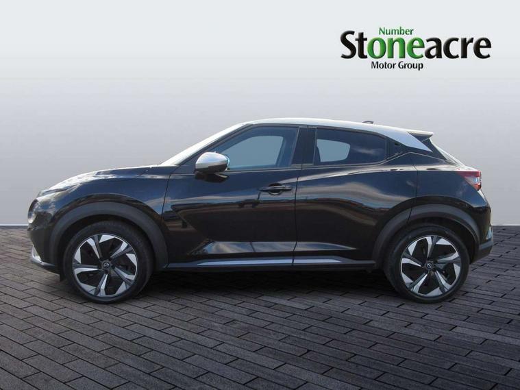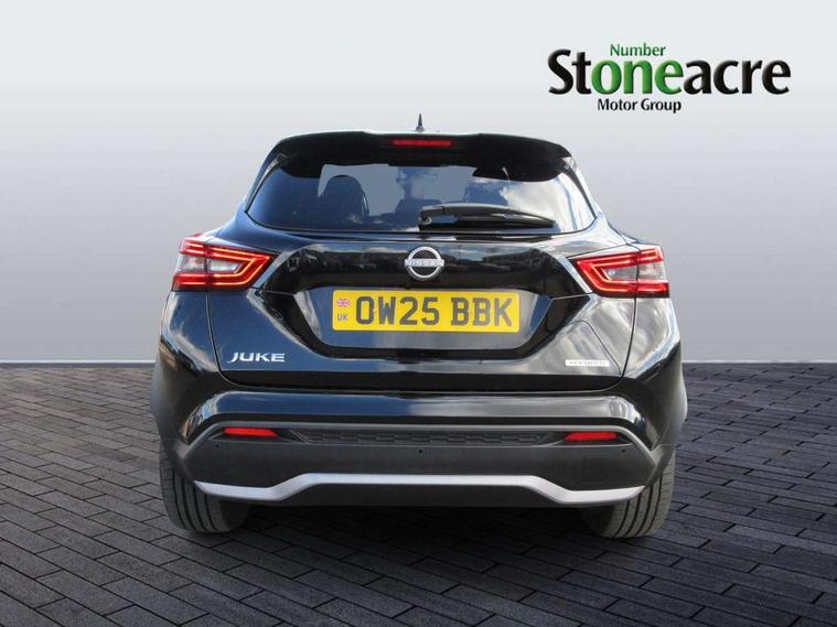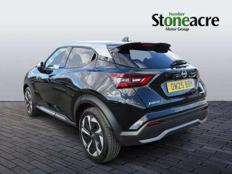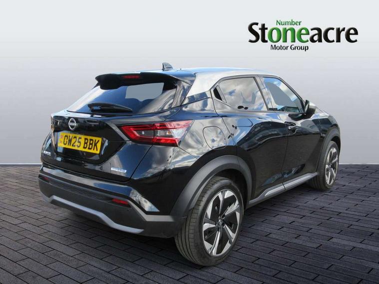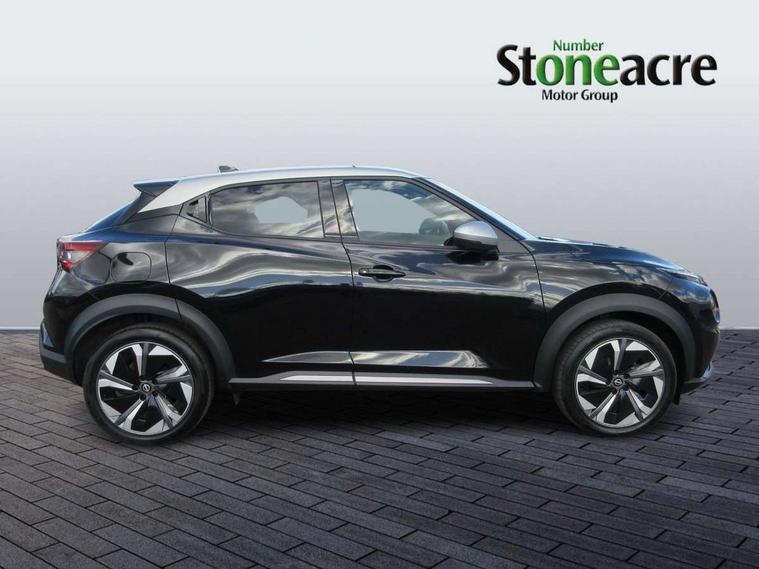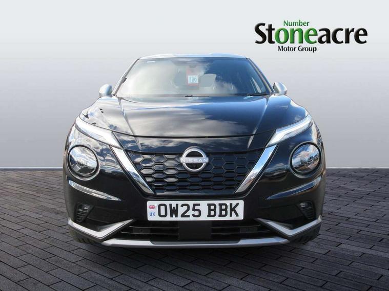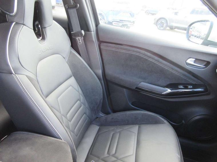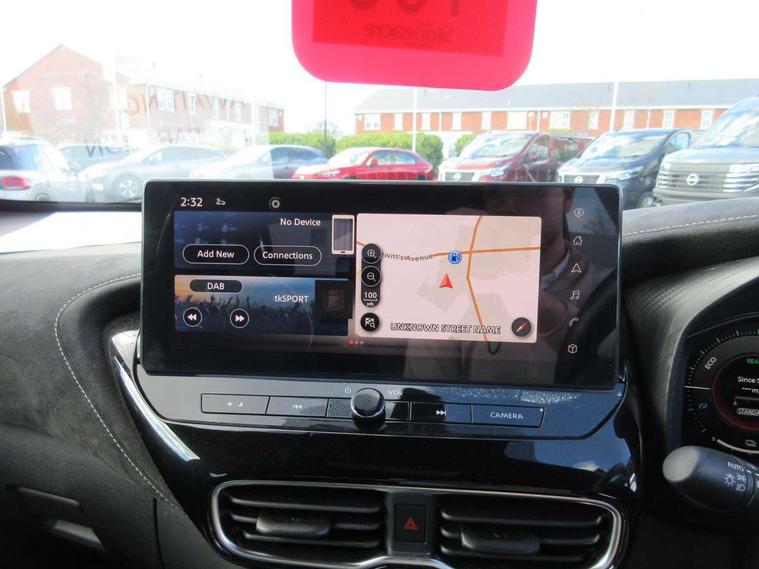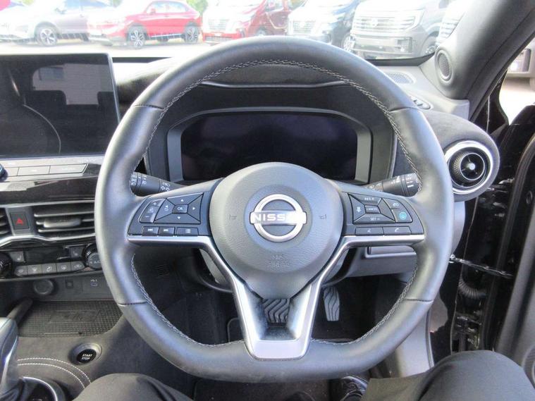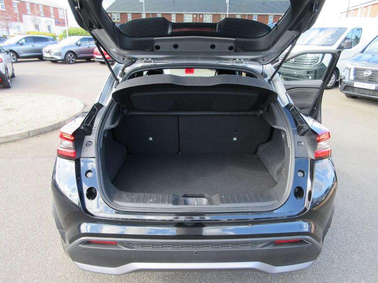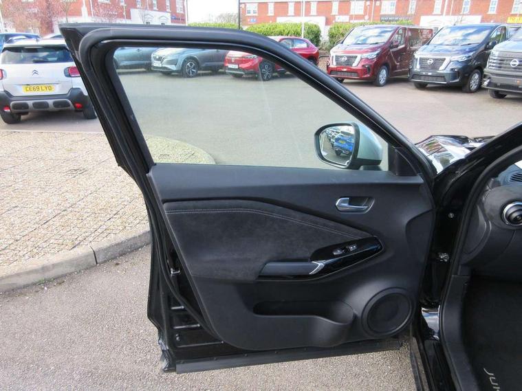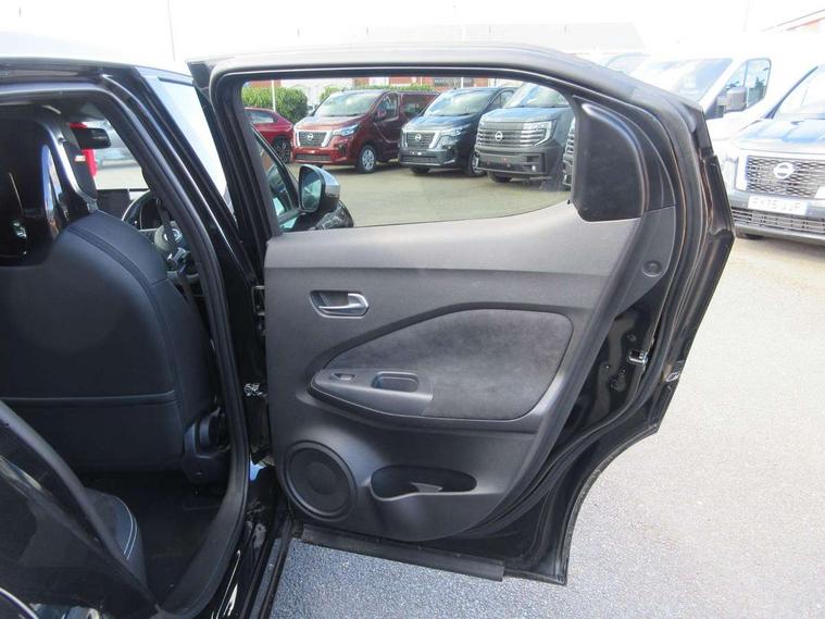 12.3" full colour TFT screen combimeter, Drive modes select (Eco, normal and sport), e-Pedal step, Emergency and breakdown call, EV mode switch, Front parking sensor, Intelligent driver alert system, Intelligent lane intervention, Lane departure warning system, Nissan connect 12.3" touch screen entertainment system, Nissan connect nav with TomTom traffic, Nissan connect services, Outside temperature sensor, Power Steering, Rear parking sensor, Stop/start button, Traffic sign recognition, Trip computer, Voice recognition, WiFi connectivity, Wireless Apple CarPlay and Google Android auto, Wireless Smartphone charger, 10 Bose speakers 6 speakers and 2 headrest speakers for driver/passenger seats, 2 X Rear console USB port, Bluetooth system, USB, Aux-in and 12V socket, Bose personal sound stage control, DAB Digital radio, Auto dimming frameless rear view mirror, Automatic hazard signal with emergency stop signal, Body colour door handles, Electrically adjustable door mirrors with integrated indicators, Follow me home headlights, Front and rear electric window with one touch driver window, Heated and auto folding door mirrors, High beam assist, LED 3rd brake light, LED daytime running lights, LED front fog lights, LED headlamps, LED rear fog lamp, LED rear lamps, One touch passenger window, Rain sensor windscreen wipers, Rear privacy glass, Rear side wing doors, Rear wiper, Roof spoiler, Shark fin roof antenna in solid Black, Three blink turn signal, 3 height adjustable rear headrests, 3 seat bench in 2nd row, 60/40 split folding rear seat, Automatic climate control, Card holder on driver sunvisor, Door ambient lighting, Driver seat back pocket, Driver side rear coat hanger, Driver/passenger sunvisors and vanity mirrors, Front and rear cabin lights, Front armrest, Front door pockets with bottle holders, Front head restraints, Front/rear passenger grab handles, Gear console ambient circle lighting, Height adjustable driver's seat, Internal chrome door handles, Leather gearshift knob, Luggage board, Luggage space lighting, Monoform sporty seats, Multifunction steering wheel, Passenger seat back pocket, Rear door bottle holders, Single front passenger seat, Smooth synthetic leather steering wheel, Synthetic leather kneepad, Telescopic steering wheel adjustment, Two cupholders in front centre console, Two rear isofix child seat anchorage points with top tether, Welcome light and console tray ambient lighting, Heat pack with height adjustable passenger seats - Juke, Interior personalisation pack - Juke, ProPilot pack - Juke Auto, Satin grey exterior personalisation pack - Juke, ABS with EBD and brake assist, Active ride control, Active Trace Control, Driver and passenger airbags, Driver and passenger side airbags, Electric handbrake with auto hold function, Electronic Stability Programme (ESP), Front and rear curtain airbags, Height adjustable seatbelts, Hill start assist, Intelligent emergency braking with pedestrian and cyclist recognition, Rear door child safety locks, Seatbelt reminder for driver/front passenger and rear seats, Three 3 point rear seatbelts, Traction control, Tyre pressure monitoring system, VDC Dynamic Vehicle Control, Alarm, Immobiliser, Intelligent key and start push button with walk away lock and approach unlock functions, Remote central locking, 19" Aero alloy wheels, Tyre puncture repair kit,