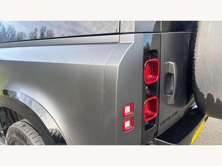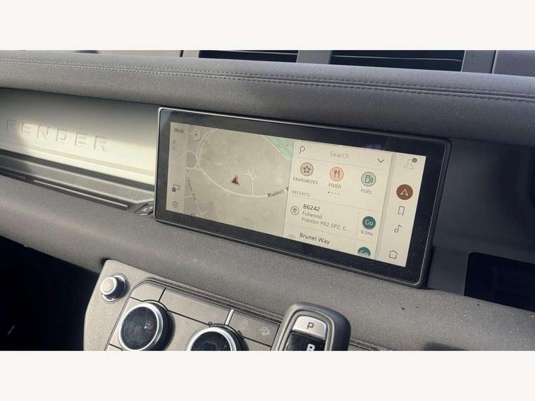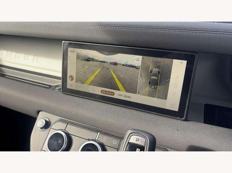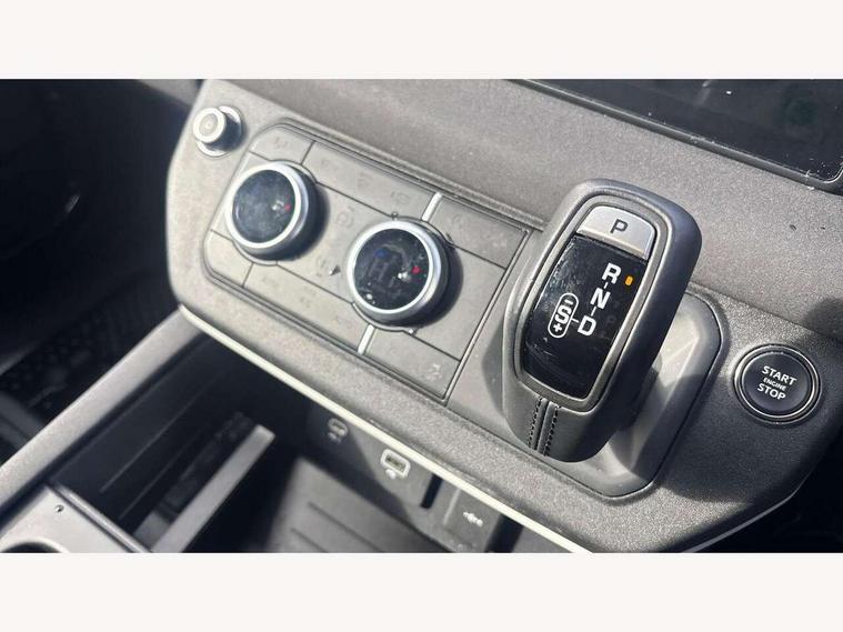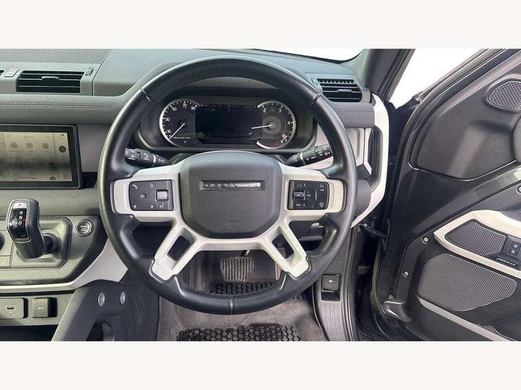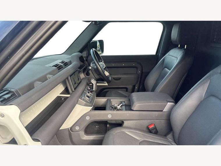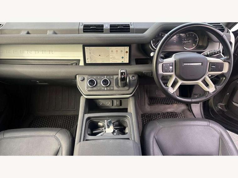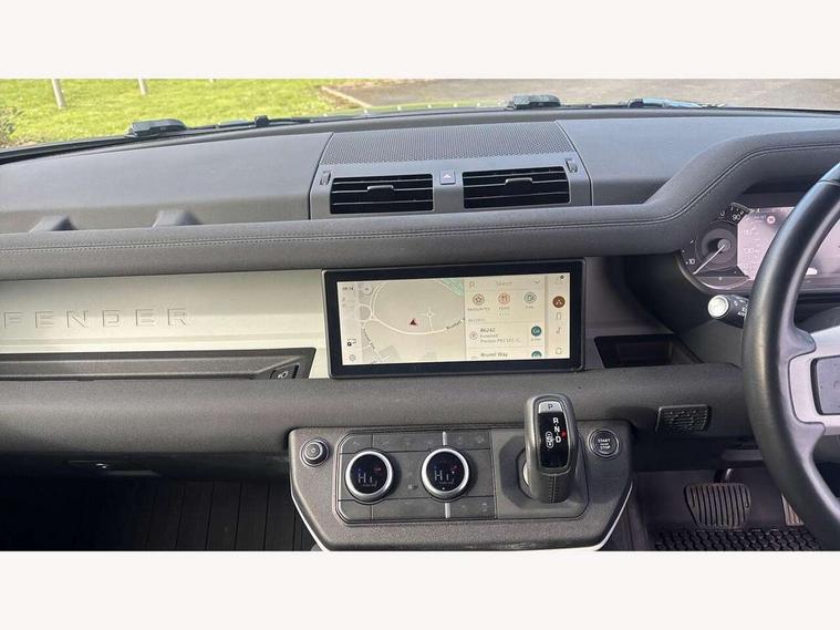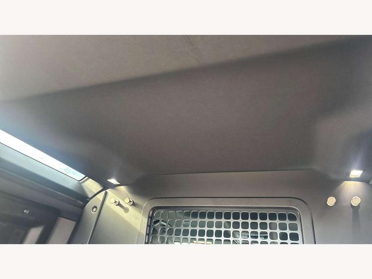 Customer Configurable Autolock, 360 parking aid, 3D Surround Camera with 360 View, 180 Rear View, Front Traffic Detection, Forward Vehicle Guidance, Tow Hitch Assist and clear sight Ground View, Blind spot assist, Brake Hold, Driver condition monitor, Electric power assisted steering (EPAS), Lane keep assist, Low traction launch, Pivi pro connected, Rear traffic monitor, Traffic sign recognition adaptive speed limiter, Trip computer, Tyre pressure monitor, Wade Sensing, Android Auto, Apple CarPlay, DAB Radio (Digital Audio Broadcasting), Meridian 280W sound audio system with 7 speakers with subwoofer, Alpine lights, Assisted tailgate, Auto High Beam Assist, Automatic headlight levelling, Automatic headlights and rain sensitive front wipers, Centre high mounted stop light, Electric heated/power fold door mirrors with approach lights and auto dimming driver side, Electric windows with one touch open/close and anti-trap, Exterior signage panel, Follow me home lighting, Front fog lights, Heated rear window with timer, Heated windscreen, LED tail light, Privacy glass, Puddle lights, Rear fog lights, Rear wash wiper, Side-hinged tailgate, Standard roof, Standard tread plates, Additional lashing points, Dual zone climate control, Durable rubber cabin flooring, Footwell lights, Full height bulkhead behind row 1 seats, Glovebox storage, High sided rubber mats, Loadspace cover, Loadspace hooks, Loadspace rubber mat, Manual adjustable steering column, Overhead stowage for sunglasses, Rear centre headrest, Rear reading light, Standard interior, Standard seating configuration, Sunvisors with illuminated vanity mirrors, Twin front cupholders, Upgraded loadspace LED lighting, Online pack - Defender with data plan, Brake pad wear indicator, Electronic traction control, Emergency braking, Front airbags, with passenger seat occupant detector, Power operated child locks, Remote for (e-Call, Optimised assistance call, InControl app, Climate, beep and flash and door), Seat belt reminder, Intrusion sensor, Keyless entry system, Locking wheel nuts, 8 speed automatic transmission, ABS and EBA, All wheel drive, CBC - (Cornering brake control), Dynamic stability control, Electronic brake force distribution, Electronic park brake, Gradient acceleration control, Hill Descent Control, Hill start assist, Particulate filter (DPF), Push button start, Roll stability control, Trailer stability assist, Twin speed transfer box (high/low range),