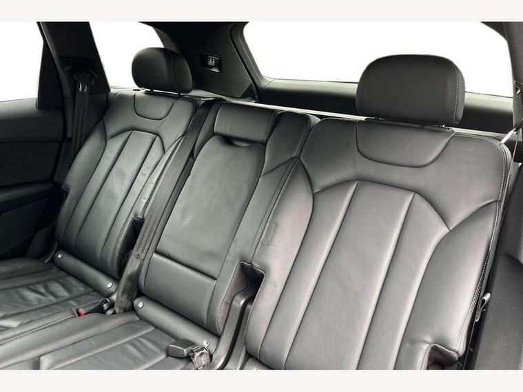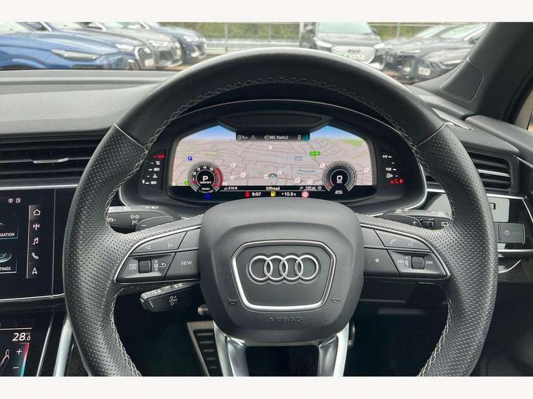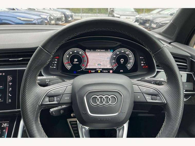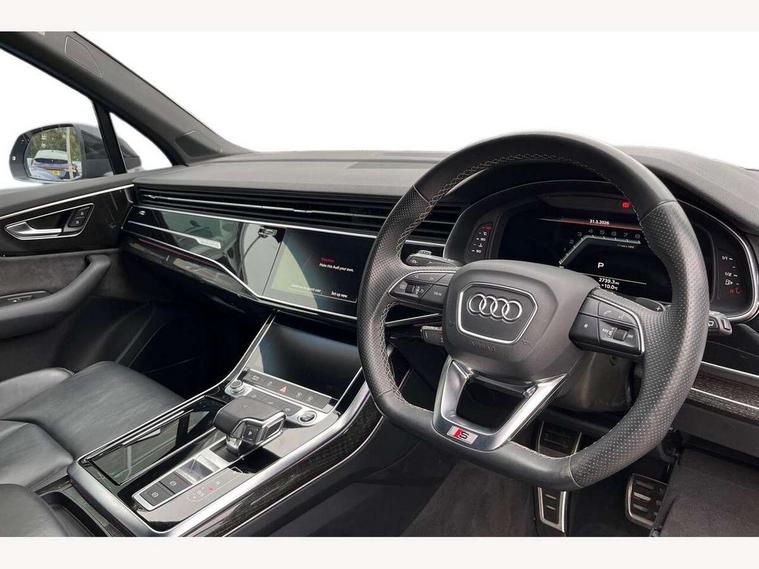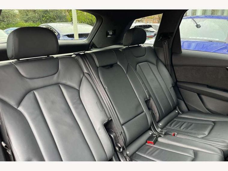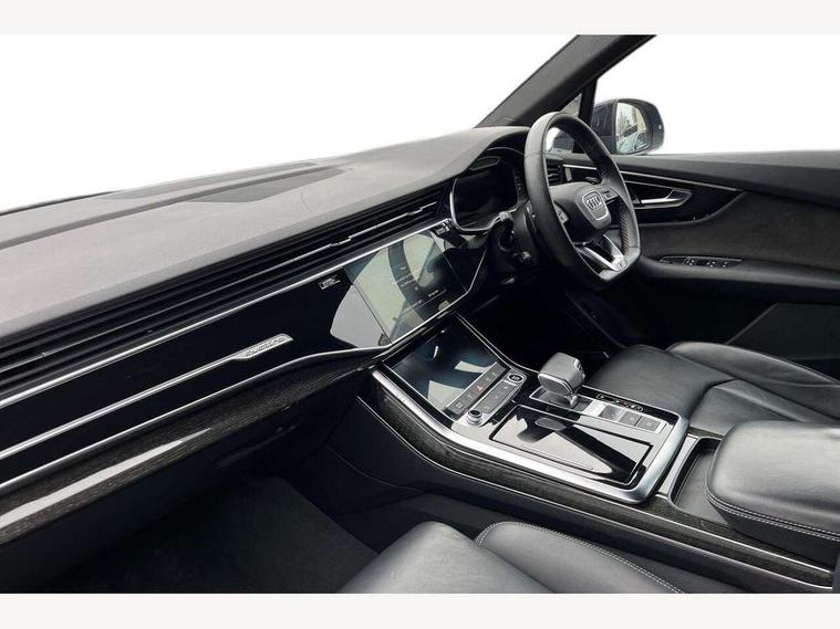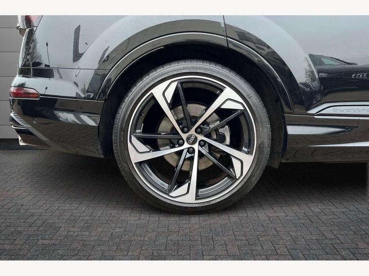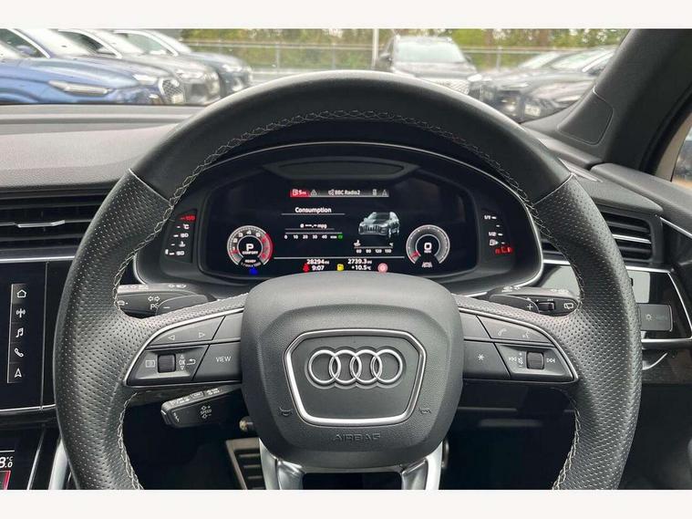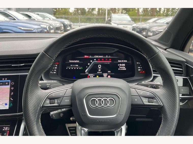 Audi connect safety and service (e-call), Audi connect with Amazon Alexa Integration, Audi drive select (Auto, Comfort, Dynamic, Efficiency, Individual, Off-road and All road), Bluetooth interface, Camera based traffic sign recognition, Electromechanical steering, MMI navigation plus with MMI touch screens includes 10.1" and 8.6" screens with haptic feedback, Natural voice recognition, Parking system plus with 360 degree display (front, rear and side sensors) - acoustic and visual park assist system, Power operated tailgate, Rear view camera, Smartphone interface includes wireless Apple carplay/Android Auto, Start/stop system, 48V Mild hybrid technology, 85 litre fuel tank, Adaptive air sports suspension, Quattro all wheel drive with self locking centre differential, Audi music interface - front 2 USB-C ports with charger and data functions, Audi sound system with 6 channel amplifier, 180 watt amplifying capacity and 10 loudspeakers including subwoofer, DAB digital radio module, 3rd brake light, Audi matrix LED headlights with dynamic front and rear indicators, Auto dimming frameless rear view mirror, Black roof rails, Bumpers in contrast paint scandium grey finish includes door trim and wheel arch trim strips, inlays in door strip contain quattro embossing, Electrically adj heated/folding + automatically dimming exterior mirrors with memory + automatic kerb side function for passenger side exterior mirror, Heat insulating glass in windshield, Integrated LED indications in door mirrors, LED daytime running lights, LED rear tail lights, Privacy glass - dark tinted rear and rear side windows from B-pillar backwards, Rear side wing doors, Rear wiper, 2 seat bench in 3rd row, 3 seat bench in 2nd row, 4 zone deluxe automatic climate control, 7 seat layout with ISOFIX points for the front passenger seat and rear passenger seat, Black cloth headlining, Comfort front centre armrest, Electric adjustable front seat with 4 way lumbar support, driver memory functionality, Folding rear seats, Front head restraints, Front/rear floor mats, Heated front seats, Illuminated door sill trims with S logo, LED interior ambient lighting, Luggage compartment cover, Luggage compartment sill protection in stainless steel, Rear head restraints, Single front passenger seat, Stainless steel pedals, Sunvisors with illuminated vanity mirrors, Titanium black styling pack - Q7/SQ7, 3 point seatbelts on all rear seats, Audi pre sense front, Child locks on rear doors, Driver and front passenger, front side and curtain airbags, Electromechanical parking brake, Electronic Stabilisation Control (ESC) including ABS, ASR and EDL, Extended pedestrian protection measures, Hill hold assist, Seatbelt monitoring, Tyre pressure loss indicator, Warning triangle and first aid kit, Anti theft alarm, Anti-theft wheel bolts and wheel loosening detection, Keyless Go, Remote central locking, Polished oak trim with grey finish inlay, Tool kit, Tyre repair kit,