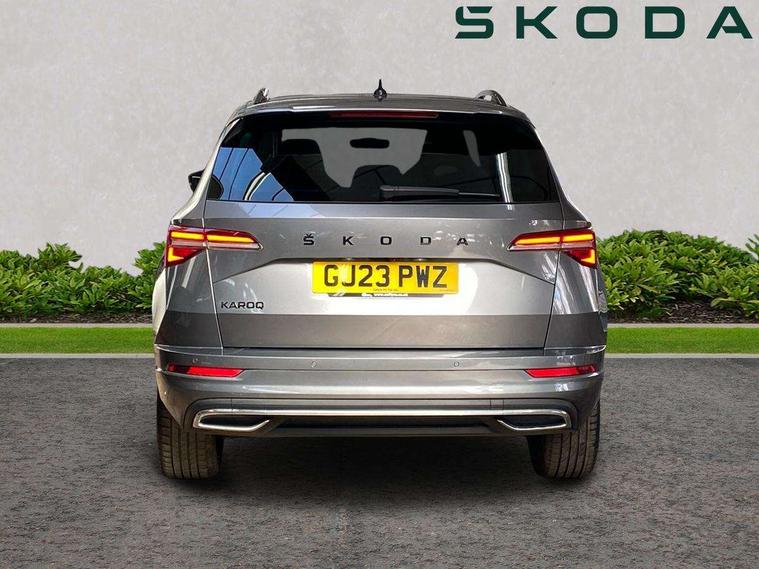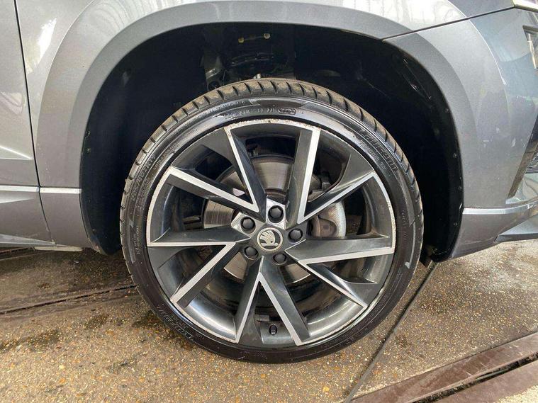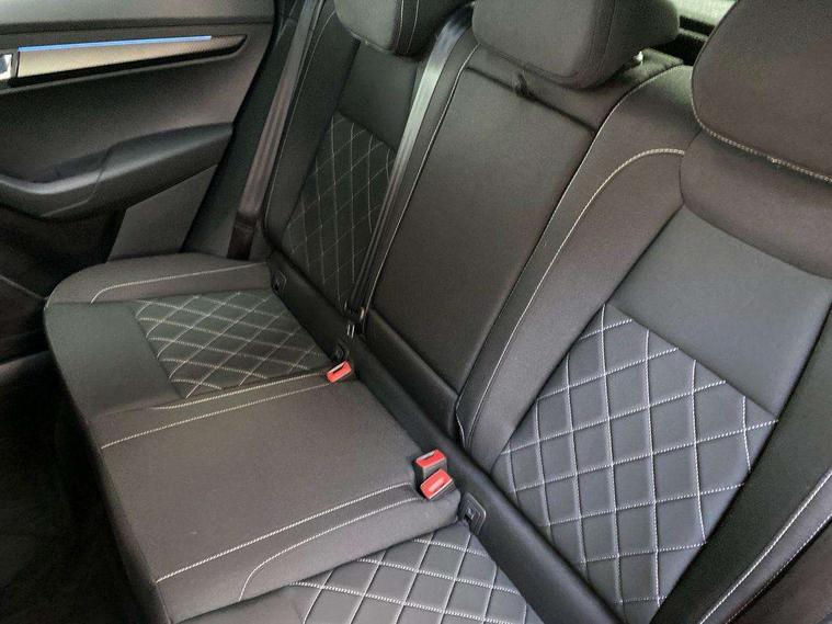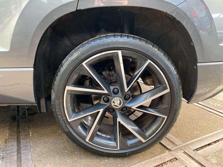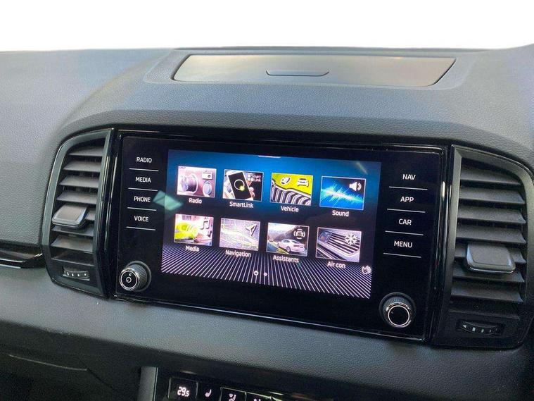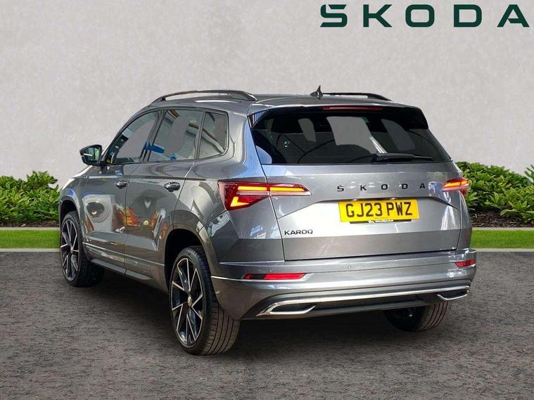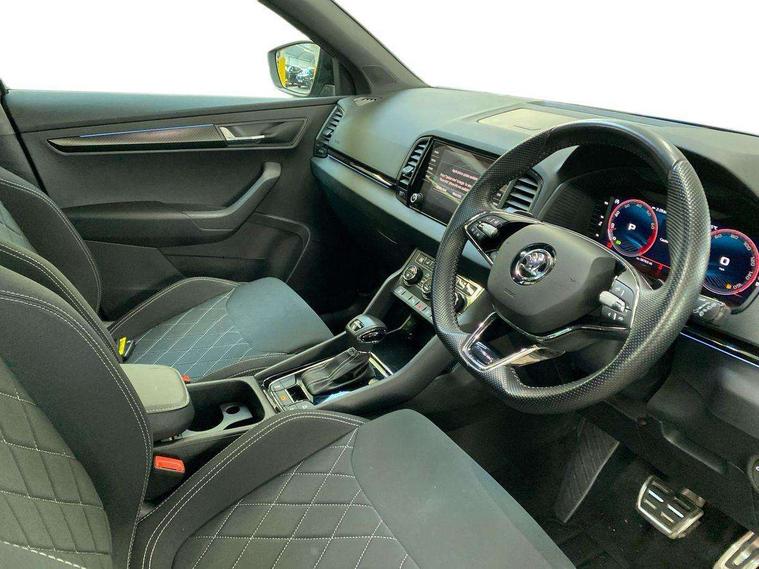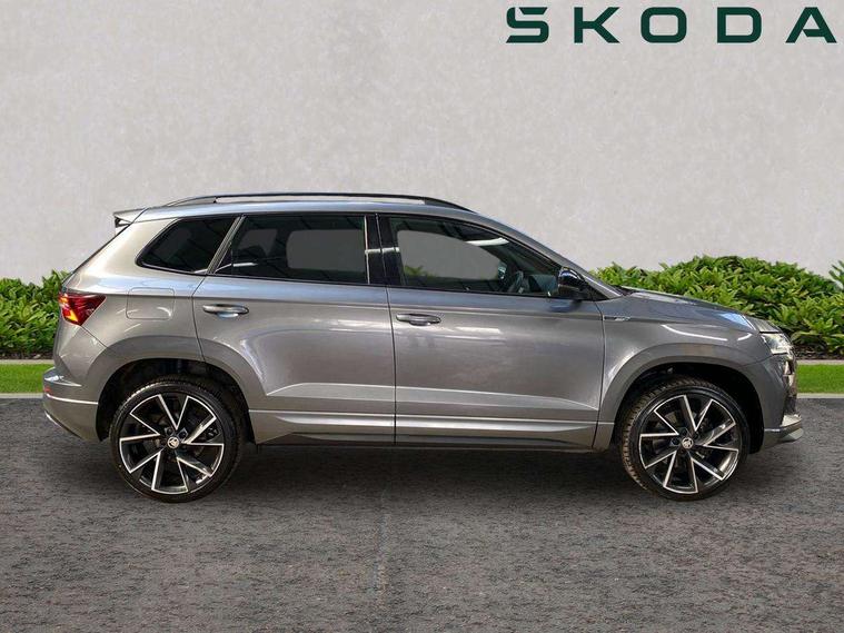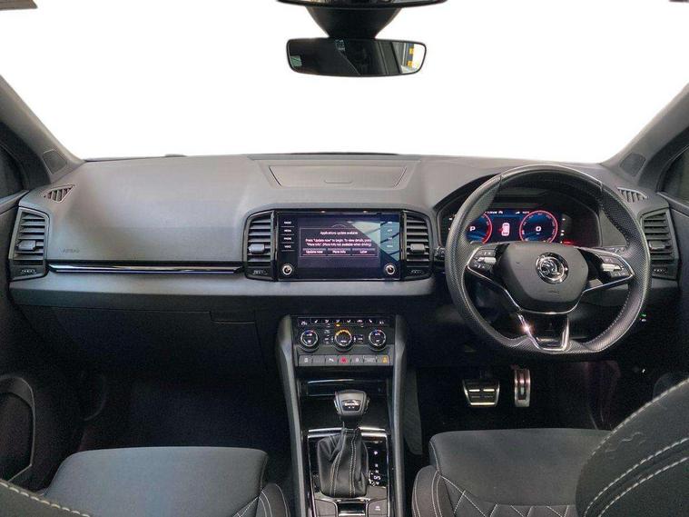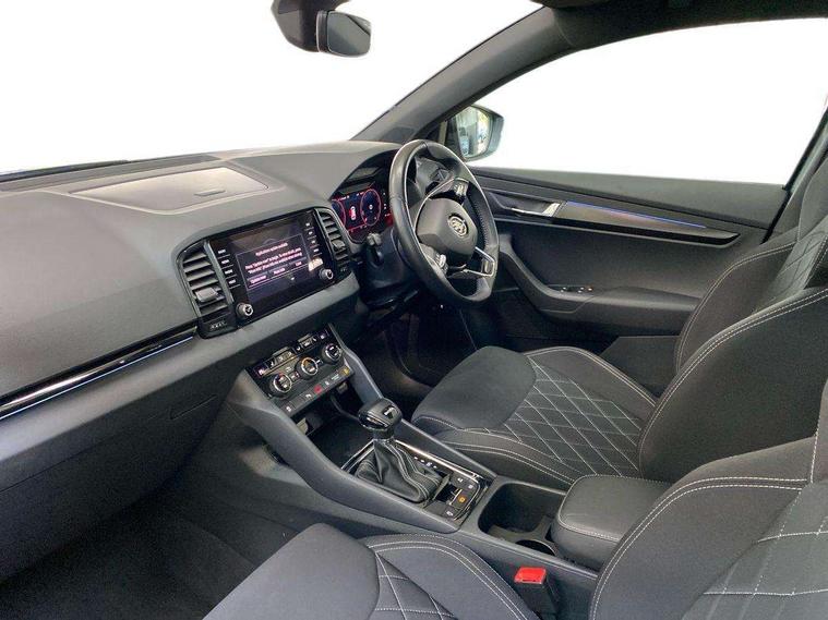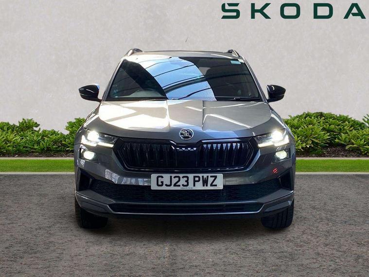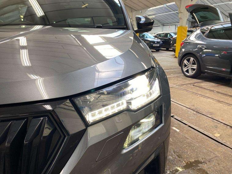 8" Digital display, Care connect, Driver fatigue sensor, Emergency services call system, Outside temperature gauge, Service interval indicator, SmartLink wireless for Apple and wired for Android, Start/stop system with regenerative braking, USB C Port x 2 in front centre console, Virtual cockpit, Virtual pedal with electrically operated boot door, 8 Speakers, DAB radio with Bluetooth, USB connection, Wireless charging without wireless aerial connection, Acoustic glass, Aero front windscreen wipers with intermittent function, Auto dimming rear view mirror with light and rain sensors, Black door mirrors, Black electric window control buttons, Black radiator grille, Black roof rails, Body colour door handles, Dynamic headlight range control with cornering light function, Electric front and rear windows with child proof lock, Front door steps with SportLine logo, Heated rear windscreen, LED daytime running lights, LED rear lights with high functionality welcome effect and dynamic indicators, Light assistant (coming/leaving home/tunnel light), Panoramic sliding sunroof, Plastic scuff plates, Privacy glass, Protective door side sills in body colour, Rear diffuser, Rear side wing doors, Rear spoiler, Rear window wiper with washer system and intermittent control, Safety reflectors on front doors, Skoda lettering on tailgate in black, Sportline badge on front fender, Sportline decorative inserts with badging, Sports front and rear bumpers, 1.5 litre bottle holders in driver and front passenger door panels, 12V socket in boot, 12v socket in front centre armrest with storage compartment and rear air vents, 3 rear height adjustable headrests, 3 seat bench in 2nd row, 3 spoke leather sports multifunction steering wheel and silver stitching with gear shift paddles, 4 foldable roof handles with rear coat hooks, Black floor carpet, Black roof headlining, Chrome inner door handles, Double sided boot floor, Foldable hooks in the boot, Front head restraints, Height adjustable front three point seats belts with tensioners, Height/reach adjust steering wheel, Ice scraper, Illuminated glovebox, Illuminated luggage compartment, Isofix child seat preparation outer rear, Manual lumbar support for front seats, Pen holder, Pollen filter, Rear boot cover, Rear reading lights, Rear seats fixed folding and divided 60:40, Rubbish bin door, Safety vest holder, Single front passenger seat, Storage box in upper central dashboard closed, Sunvisors with illuminated vanity mirrors, Textile floor mats, Ticket holder, Titan black interior ceiling, Welcome animation with sportline logo, Boot pack - Karoq, Light Pack - Karoq, Parking pack - Karoq, Automatic door unlocking in case of crash, Automatic fuel cut off in case of crash, Child locks on rear doors, Driver airbag, Electronic parking brake with auto hold function, Emergency rear braking signal, ESC including ABS, MSR, ASR, EDS, HBA, DSR, RBS, MKB and traction control, Front side airbags, Hill hold control, Knee airbags, Passenger airbag with switch-off function, Pedestrian monitor, Seatbelt reminder signalisation and pretensioner for all seats, Three point seatbelts rear, Two tone horn, Tyre pressure display, Tyre pressure monitor, Alarm with interior monitoring, back up horn and tilt sensor with safe function, Electronic engine immobiliser, Keyless entry and start/stop, Remote central locking with 2 remote folding keys, Black air vent surround, Black centre console, Satin black dashboard, Satin black door trim, 19" Vega black polished alloy wheels, Anti-theft wheel bolts protection, Matt black aero hub caps, Storage on wheel cover, Tool kit,