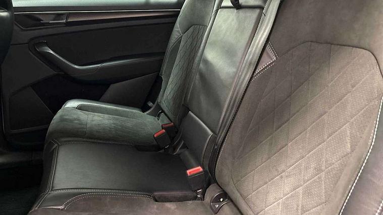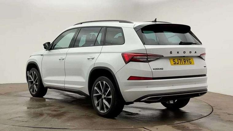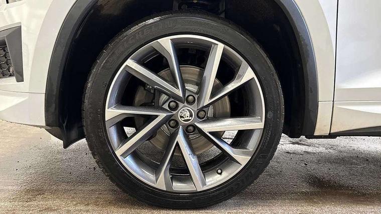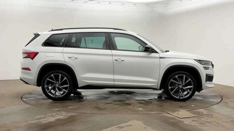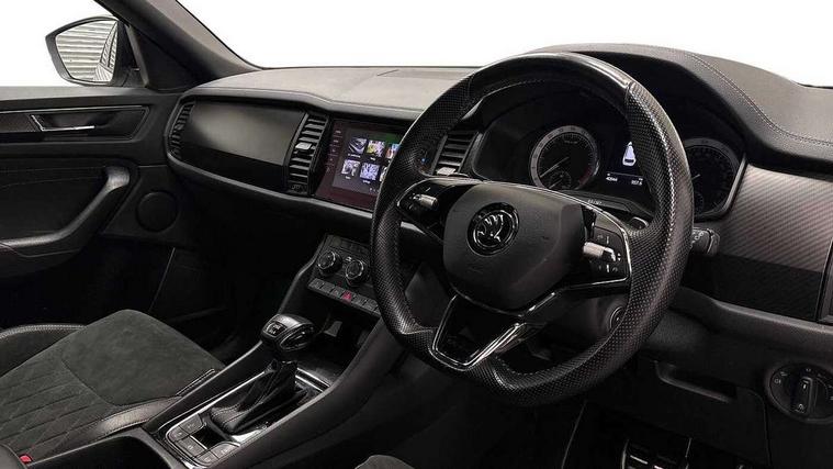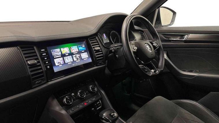 Bluetooth system, Columbus satellite navigation with 9.2" touchscreen, integrated Wi-Fi, web radio, E-call, ECO Stop/start function, Exterior temperature indicator, Progressive steering, Rear view camera, Smartlink wireless for apple carplay and wired for android auto, Speed limiter, Tailgate unlocking from outside, USB C Port x 2 in front centre console, Wireless charging, 8 Speakers, DAB Digital radio, Aero front windscreen wipers with intermittent function, Aero rear window wiper, Auto dimming rear view mirror, Black roof rails, Black sports styling including front grille and window surrounds, Black wheel arch surrounds, Body colour bumpers, Body colour door handles, Electric adjustable/heated/folding door mirrors, driver side auto dimming with boarding sports and memory function, Electric front and rear windows, Extended rear spoiler with finlets in gloss black, Front fog lights, Full LED matrix headlights with AFS (adaptive front light system), cornering function and AWL (all weather lighting system), Gloss black door mirrors, Headlight washers, Heated rear window, Invisible tailpipe, LED daytime running lights, LED rear fog light, LED third brake light in rear spoiler, Light assistant (coming/leaving home/tunnel light), Off-road style lower front bumper element, Privacy glass, Rain and light sensors, Rear diffuser, Rear LED lights (high functionality) with welcome effect and dynamic indicators, Rear side wing doors, Safety reflectors on front and rear doors, Sportline badge on front fender, Sports front and rear bumpers including lower rear chrome strip, Tailgate lettering in Black, Window control switches with black trim, Without engine designation, 12V socket in boot, 2 rails with 2 hooks, 2 seat bench in 3rd row, 3 seat bench in 2nd row, 4 foldable roof handles with rear coat hooks, 60:40 foldable rear seat with sliding adjustment and backrest angle adjustment, Aluminium pedals, Black roof headlining, Bottle holders in door panel in the 1.5 litre front and 1 litre rear, Cargo storage compartments, Chrome headlight control button, Chrome interior door handles, Coat hooks on B pillar, Covered storage compartment on driver side, Decorative door sills in the front and rear, Front centre armrest with storage compartment, cup holder and 12V socket, Front courtesy lights, Gear shift lever with chrome frame and black gloss insert, Grey stitching in front and rear armrests and door armrests + door inserts, Height adjustable front headrests, Illuminated and cooled glovebox, Illuminated luggage compartment, Isofix child seat fittings in outer rear seats with top tether, Manually adjustable steering column, Microsuede door panels, Net programme in boot (1x horizontal Net, 2x vertical Nets), Overhead glasses storage compartment, Pollen filter, Rear centre armrest with cupholders, Single front passenger seat, Sliding trunk cover, Small Bags on the inner sides of the front backrests, Sports seats, Sunvisors with illuminated vanity mirrors, Three rear height adjustable headrests, Ticket holder on A Pillar, Umbrella in door panel, Variable boot floor, LED Interior light pack - Kodiaq, Auto door release and activation of warning lights in the event of an accident, Child locks on rear doors, Driver and front passenger airbag with knee airbag and front passenger airbag deactivation, Electronic parking brake with hill start assist, Emergency rear braking signal, ESC (incl. ABS+MSR+ASR+EDS+HBA+DSR+RBS+MKB), Front assist with autonomous emergency braking, Front side airbags with curtain airbags, Fuel cut off safety device, Height adjustable front 3 point seatbelts + pretensioners, Hill hold control, Rear disc brakes, Safety vest holder in door, Seat belt reminder for all seats, Three point rear seat belts, Two tone horn, Tyre pressure monitor, Alarm with interior monitoring and tilt sensor with safe function, Anti-theft wheel bolts, Immobiliser, Keyless entry and start system (KESSY), Remote central locking with 2 keys, Black air vent surround, Carbon finish dashboard and door inserts, Grey stitching in dashboard, 20" Vega Anthracite alloy wheels, Temporary spare wheel (space saver),