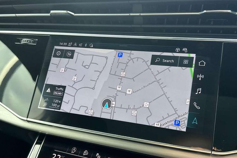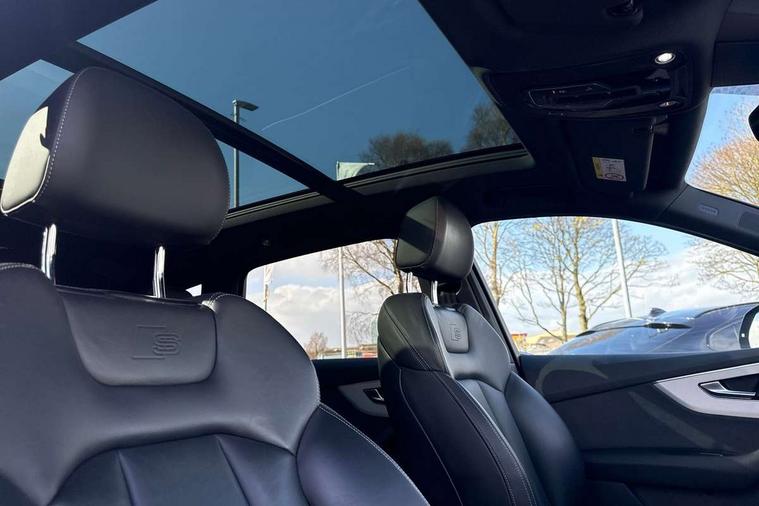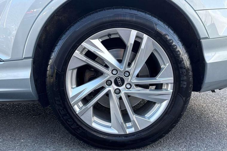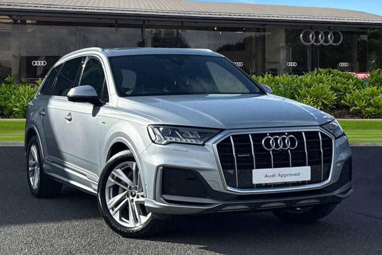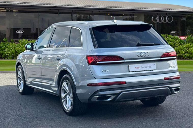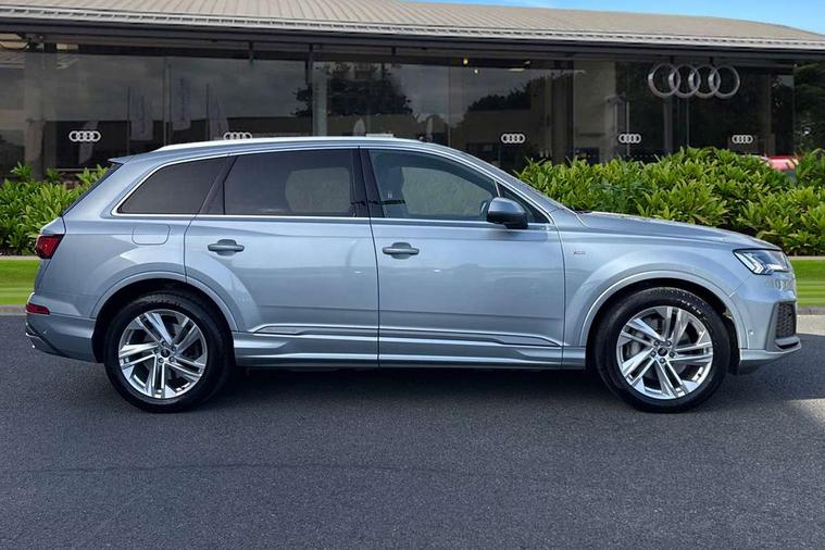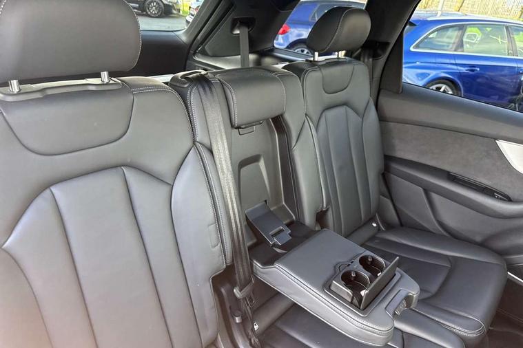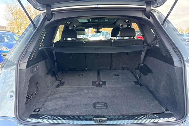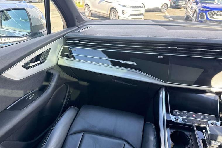 Audi connect safety and service (e-call), Audi connect with Amazon Alexa Integration, Audi drive select (Auto, Comfort, Dynamic, Efficiency, Individual, Off-road and All road), Audi phone box light with wireless charging, Audi virtual cockpit - 12.3" high-resolution LCD display with fully customisable instrument cluster, Bluetooth interface, Camera based traffic sign recognition, Electromechanical steering, MMI navigation plus with MMI touch screens includes 10.1" and 8.6" screens with haptic feedback, Natural voice recognition, Power operated tailgate, Smartphone interface includes wireless Apple carplay/Android Auto, Start/stop system, 48V Mild hybrid technology, Adaptive air sports suspension, Quattro all wheel drive with self locking centre differential, Audi music interface - front 2 USB-C ports with charger and data functions, DAB digital radio module, 3rd brake light, Aluminium window trim, Audi Beam uses LEDs to project S emblem with red rhombus onto the ground when opening the side doors (front/rear), Auto dimming frameless rear view mirror, Black roof rails, Bumpers in contrast paint scandium grey finish includes door trim and wheel arch trim strips, inlays in door strip contain quattro embossing, Dark tinted Matrix LED headlights with dynamic front and rear indicators, Electrically adj heated/folding + automatically dimming exterior mirrors with memory + automatic kerb side function for passenger side exterior mirror, Heat insulating glass in windshield, Integrated LED indications in door mirrors, LED daytime running lights, LED rear tail lights, Privacy glass - dark tinted rear and rear side windows from B-pillar backwards, Rear side wing doors, Rear wiper, 2 seat bench in 3rd row, 3 seat bench in 2nd row, 7 seat layout with ISOFIX points for the front passenger seat and rear passenger seat, Black cloth headlining, Comfort front centre armrest, Electric adjustable front seat with 4 way lumbar support, driver memory functionality, Folding rear seats, Front head restraints, Front/rear floor mats, Heated front seats, Illuminated door sill trims with S logo, Luggage compartment sill protection in stainless steel, Rear head restraints, Single front passenger seat, Stainless steel pedals, Sunvisors with illuminated vanity mirrors, Black styling pack plus - Q7, Technology Pack Pro - Q7, 3 point seatbelts on all rear seats, Audi pre sense front, Child locks on rear doors, Driver and front passenger, front side and curtain airbags, Electromechanical parking brake, Electronic Stabilisation Control (ESC) including ABS, ASR and EDL, Extended pedestrian protection measures, Hill hold assist, Seatbelt monitoring, Tyre pressure loss indicator, Warning triangle and first aid kit, Anti theft alarm, Anti-theft wheel bolts and wheel loosening detection, Remote central locking, Polished oak trim with grey finish inlay, Tool kit, Tyre repair kit,