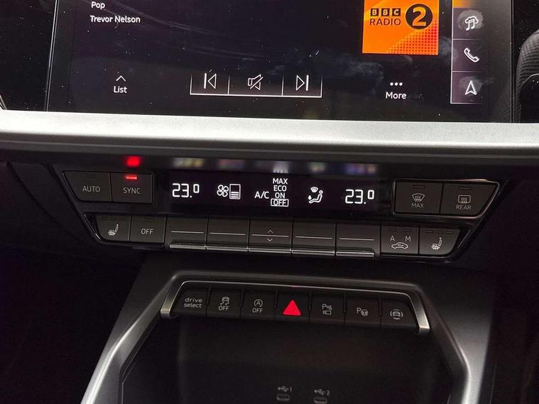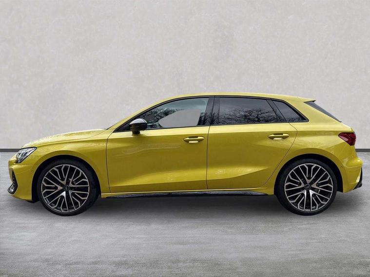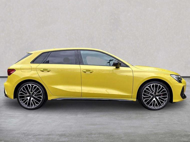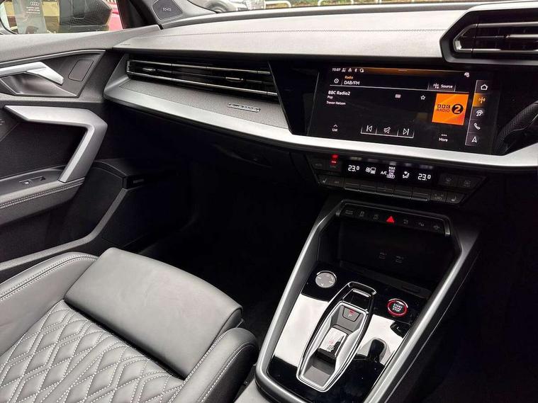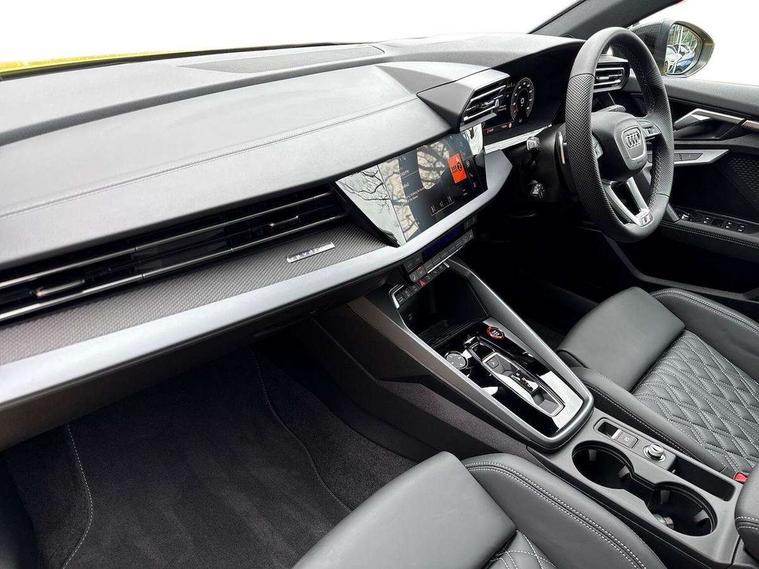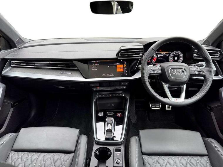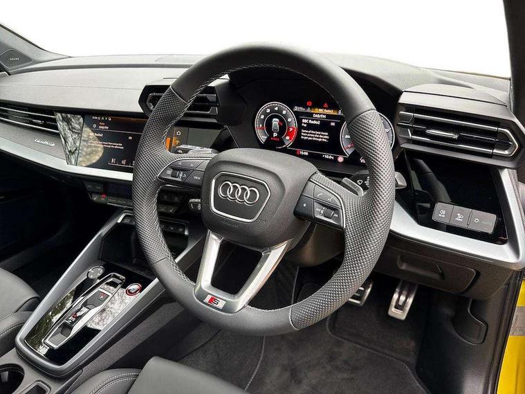 Adjustable speed limiter, Audi drive select, Audi smartphone interface with app store includes wireless Apple carplay, Android auto and Amazon alexa integration, Audi virtual cockpit plus - 12.3" full HD resolution dynamic digital instrument cluster, Automatic start/stop system with recuperation, Bluetooth interface, Camera based traffic sign recognition, Collision avoidance assistant, Distraction and Fatigue warning, e-Call (emergency call), Lane departure warning system, MMI Navigation Plus with high resolution 10.1" colour touch screen display, Park Assist with parking system Plus, Progressive steering, Service indicator, Tailgate, Trip computer, Voice control system with natural language interaction, quattro permanent all-wheel drive with torque splitter, S suspension with damper control, Audi Phonebox light with wireless charging, DAB Digital radio, USB ports with charging function in the rear, 3rd brake light, Anthracite grey Audi rings (front and rear), Audi Beam uses LEDs to project Vorsprung onto the ground as you exit your S3, Auto dimming frameless rear view mirror, Black accents front and rear bumpers including air inlets, Black accents in front grille and frame, Black accents window trims strips, Carbon door mirror housings, Electrically adjustable/heated/folding/auto dimming door mirrors with integrated LED indications + kerb view function for passenger side, Exterior model badging, Front electric windows, Headlight washers, Heat insulating glass windscreen, Illuminated door sills with aluminium inserts at the front with S logo, LED daytime running lights, Light and rain sensors, Privacy glass - dark tinted rear window, rear door and side windows, Rear electric windows, Rear side wing doors, Rear wiper, S grille, S3 front bumper with S specific air intake grilles, S3 roof spoiler, 12V socket and storage compartment in front centre console, 3 seat bench in 2nd row, 3 spoke leather multifunction steering wheel with gear shift paddles, 3-zone deluxe automatic air conditioning, 4 way electrically adjustable lumbar support for driver and front passenger, 40/20/40 split folding rear seat bench, Black cloth headlining, Fine Nappa leather upholstery with front sports seats S embossed logo, Front and rear centre armrest in artificial leather, Front and rear centre armrest in artificial leather with contrasting stitching on armrests and instrument panel, Front and rear headrests, Front/rear floor mats, Heated front seats, Height and reach adjustable steering wheel, Manual boot compartment lid, Rear cup holders, S badging on the steering wheel, Seat side bolsters, Single front passenger seat, Stainless steel pedals and front footrest in black, Aluminium interior elements pack - A3 Sportback, Extended ambient lighting package Pro - S3, Storage package - A3, Technology package pro - A3 S Tronic, 3x3 point rear seat belts, Driver and front passenger airbag with passenger airbag deactivation, Electronic Stabilisation Control (ESC) including ABS, ASR and EDL, First aid kit with warning triangle and 2 safety vests, Front side airbags with head airbags and interaction airbag, Hill hold assist, Pre-sense front with pedestrian and cyclist detection, Seatbelt monitoring, Tyre pressure loss indicator, Anti theft alarm, Anti-theft wheel bolts, Electronically operated child locks, Immobiliser, Remote central locking with safelock, Dash & door inlays in carbon atlas structure, Tyre repair kit,