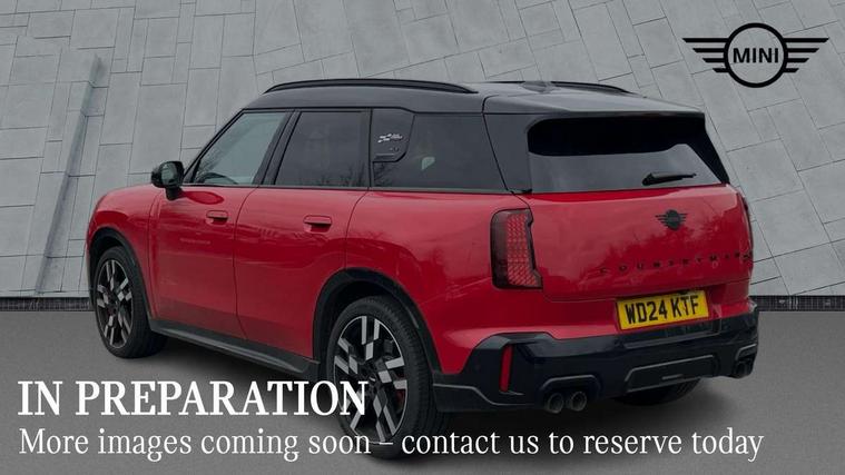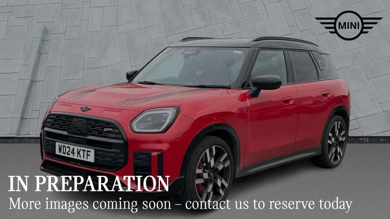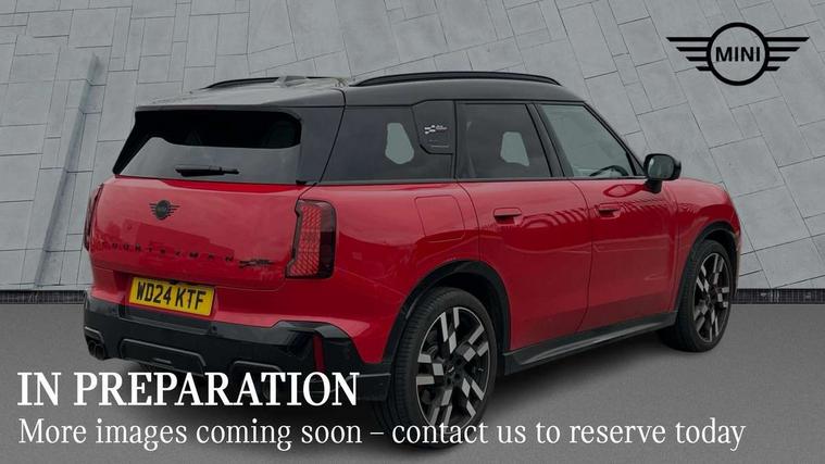 Bluetooth connection, Circular OLED Screen, Compatible mobile phone bluetooth with audio streaming, Cruise Control (DCC), Digital dashboard display, Driving Assistant Plus Preparation, E-call, Electro-mechanical speed dependant steering assistance, MINI Experience Modes, MINI Head up display, Mini navigation system, MINI TeleServices, Parking assistant in camera and ultrasound based assistance system, rear view camera, parking aid and distance control, Double clutch sports transmission, Quad exhaust system, DAB Digital radio, Harman Kardon surround sound system, Personal eSim, Auto tailgate, Electric adjustable heated door mirrors, Front and rear apron, Front and rear electric windows, Heated rear window, High beam assistant, High gloss hexagonal patterned grille surround, Interior rear-view mirror with automatic anti-dazzle function, LED daytime running lights, LED headlights with extended contents including Adaptable light signatures, LED rear lights, LED third brake light, Rain sensor with auto headlights, Rear roof spoiler with airblades, Rear side wing doors, Rear window wiper, Roof rails, 3 seat bench in 2nd row, 60/40 split rear bench seat, Anthracite headliner, Auto air conditioning, Driver and front passenger seat heating, Floor mats, Front armrest, Front headrests, Heated steering wheel, Height and length steering column adjustment, JCW Front sports seats, Lidded storage box in Black/Red knit, Luggage compartment separating net, Perforated Vescin steering wheel, Rear headrests, Seat adjustment for rear seats, Single front passenger seat, Sunvisors with vanity mirrors, Vescin/Cloth upholstery, Wireless charging tray, Interior and exterior mirror package - Mini Countryman, 3x3 point rear seat belts, 6 Airbags - front, side, head and seat belt tensioners, ABS, DSC - Dynamic Stability Control, Electronic handbrake, Electronic Stability Programme (ESP), Front ISOFIX (iSize), Hill descent control, Hill hold assist, Hill start assist, JCW logo in brake calipers, JCW Sport brakes with Chilli Red calipers, Manual rear child locks, Traction control, Tyre pressure monitoring system, Warning triangle, Alarm system with tilt sensor, monitoring doors, bonnet interior and tailgate, Auto drive away locking, Comfort access system, Deadlocking function, Electronic vehicle immobiliser, Locking wheel bolts, Remote control locking, Start/stop toggle with keyless go, JCW Black/Red dashboard knit, 19" JCW Runway Spoke Black alloy wheels, MINI Mobility Kit,