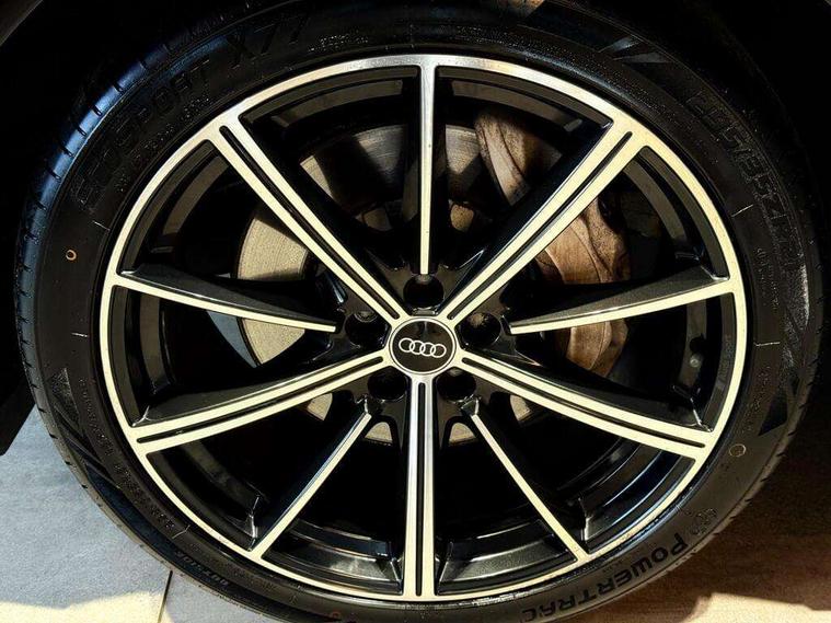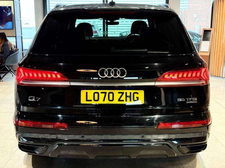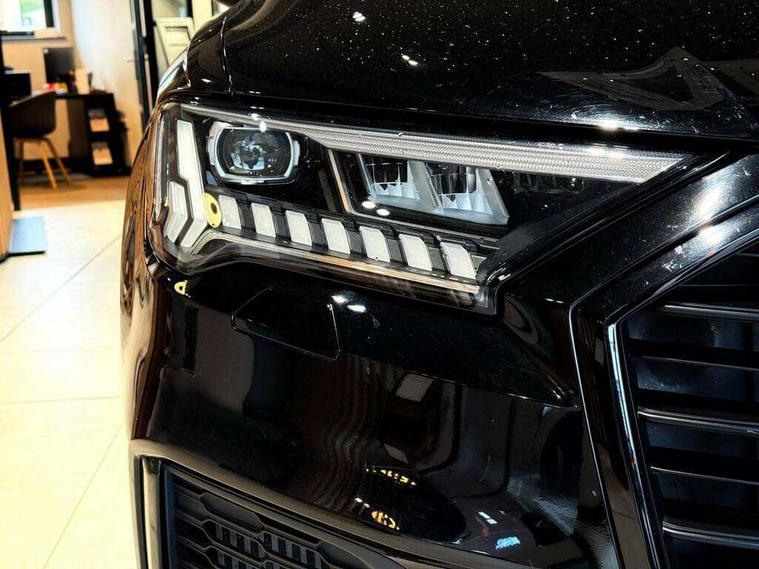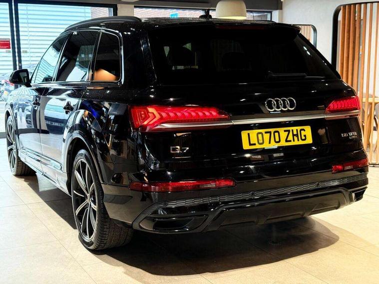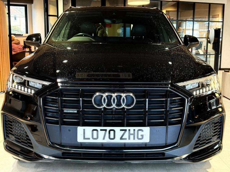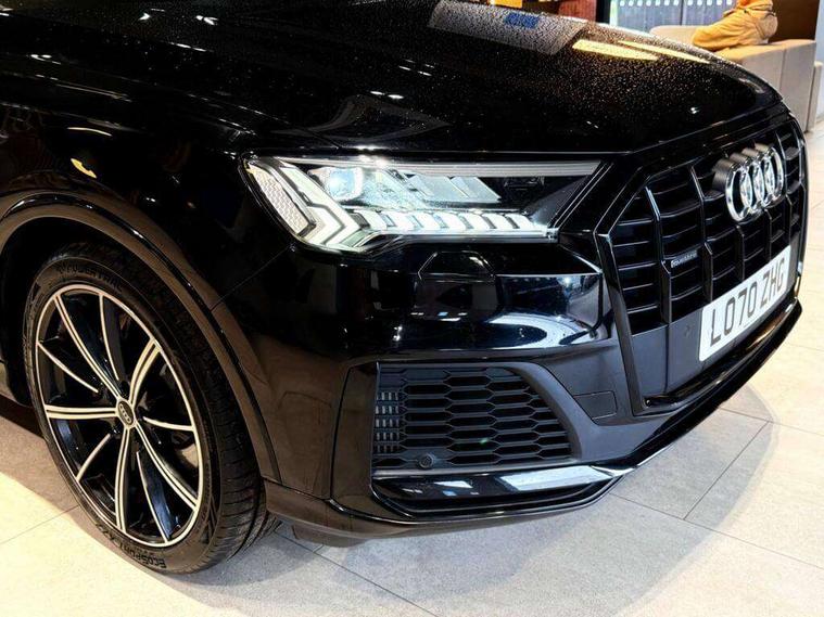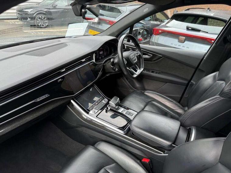 Audi connect safety and service (e-call), Audi drive select (Auto, Comfort, Dynamic, Efficiency, Individual, Off-road and All road), Audi phone box with wireless charging, Camera based traffic sign recognition, Electromechanical steering, MMI navigation plus with MMI touch screens includes 10.1" and 8.6" screens with haptic feedback, Natural voice recognition, Parking system plus - front + rear sensors, Power operated tailgate, Rear view camera, Smartphone interface includes wireless Apple carplay/Android Auto, Start/stop system, 48V Mild hybrid technology, 85 litre fuel tank, Adaptive air sports suspension, Quattro all wheel drive with self locking centre differential, Audi music interface - front 2 USB-C ports with charger and data functions, Audi sound system with 6 channel amplifier, 180 watt amplifying capacity and 10 loudspeakers including subwoofer, DAB digital radio module, Audi matrix LED headlights with dynamic front and rear indicators, Auto dimming frameless rear view mirror, Black roof rails, Bumpers in contrast paint scandium grey finish includes door trim and wheel arch trim strips, inlays in door strip contain quattro embossing, Electrically adj heated/folding + automatically dimming exterior mirrors with memory + automatic kerb side function for passenger side exterior mirror, Heat insulating glass in windshield, Integrated LED indications in door mirrors, LED daytime running lights, LED rear tail lights, Privacy glass - dark tinted rear and rear side windows from B-pillar backwards, 4 zone deluxe automatic climate control, 7 seat layout with ISOFIX points for the front passenger seat and rear passenger seat, Comfort front centre armrest, Folding rear seats, Front head restraints, Front/rear floor mats, Heated front seats, LED interior ambient lighting, Luggage compartment cover, Luggage compartment sill protection in stainless steel, Rear head restraints, Stainless steel pedals, Titanium black styling pack - Q7/SQ7, 3 point seatbelts on all rear seats, Audi pre sense front, Driver and front passenger, front side and curtain airbags, Electromechanical parking brake, Electronic Stabilisation Control (ESC) including ABS, ASR and EDL, Extended pedestrian protection measures, Hill hold assist, Seatbelt monitoring, Tyre pressure loss indicator, Warning triangle and first aid kit, Anti theft alarm, Anti-theft wheel bolts and wheel loosening detection, Keyless go with remote central locking, Polished oak trim with grey finish inlay, Tool kit, Tyre repair kit,