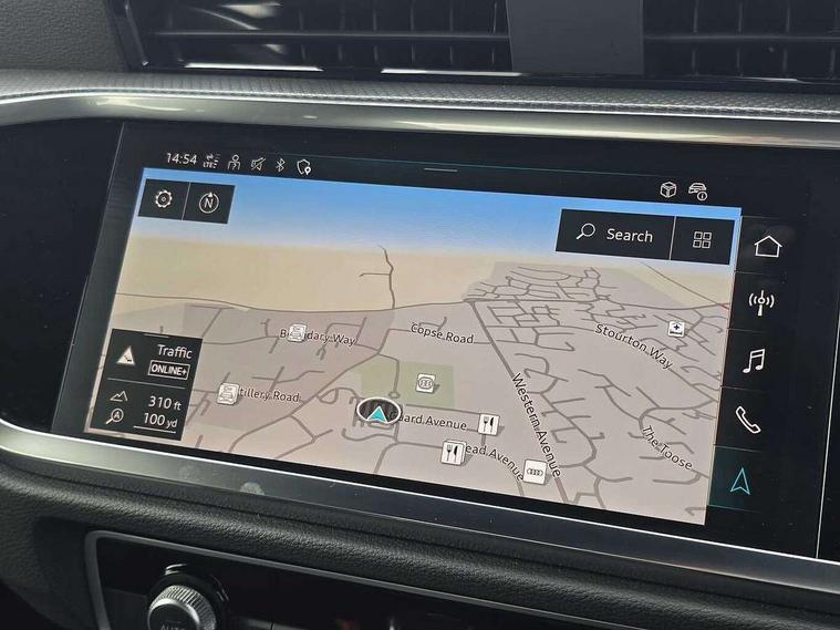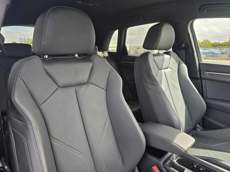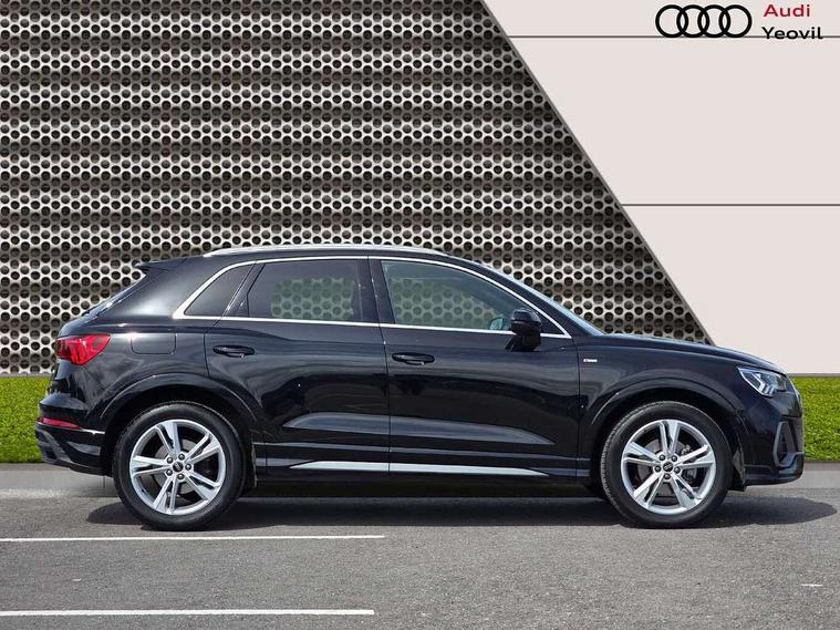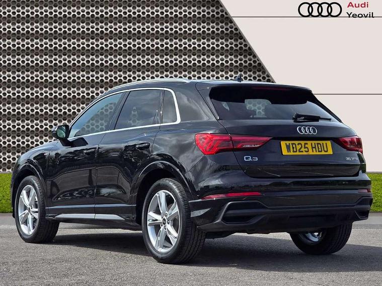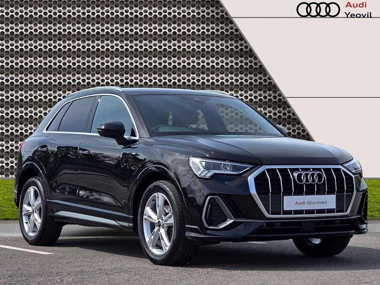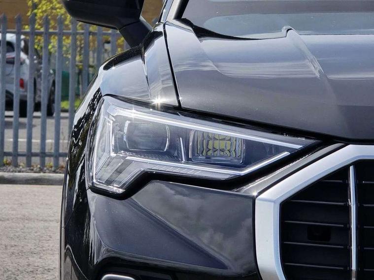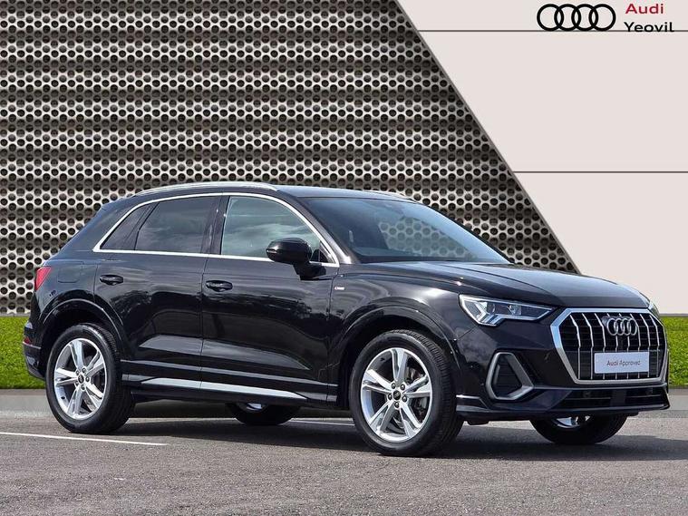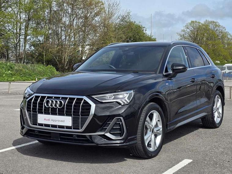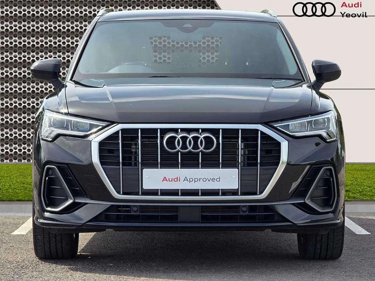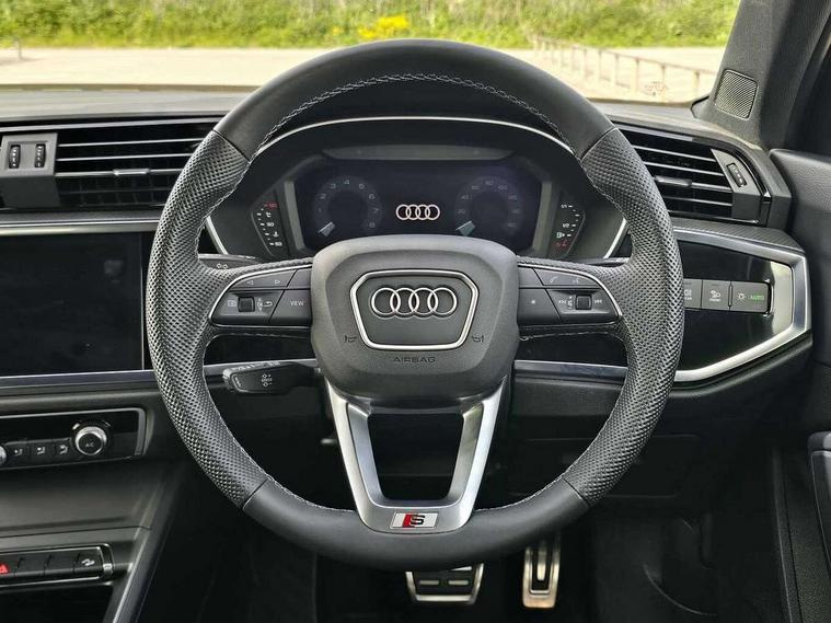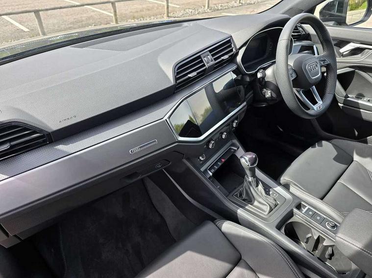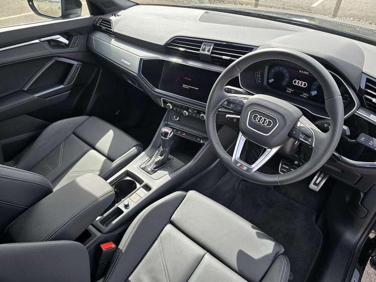 Amazon alexa Integration, Audi connect safety and service, Audi drive select, Audi lane departure warning, Audi Virtual Cockpit - 10.25" display, Bluetooth interface, Camera based traffic sign recognition, Distraction and Fatigue warning, Legal emergency call, MMI Navigation Plus with high resolution 10.1 inch touchscreen colour display, Power operated tailgate, Progressive steering, Service interval indicator, Smartphone interface includes wireless Apple carplay/Android Auto, Start stop system with recuperation, Voice control system with natural language interaction, Sports suspension, 2 USB-C ports with charge and data functions, 6 passive loudspeakers, DAB digital radio module, Acoustic windscreen, Aluminium roof rails, Aluminium window trim, Anthracite black radiator grille, Auto dimming door mirrors, Auto dimming frameless rear view mirror, Body colour front spoiler blade, Electrically folding, adjustable and heated door mirrors with integrated LED side indicators and kerb view function for passenger side, Front and rear electric windows, Front fog lights, Front side air inlets in matt platinum grey, Grille vertical bars in aluminium silver/Matt, High gloss black finish B and C pillars, LED Dynamic rear indicators, LED headlights with LED daytime running lights, LED rear lights, LED third brake light, Privacy glass dark tinted rear and rear-side windows (from B-pillar backwards), Rain and light sensors, Rear diffuser grille in grained matt black, Rear diffuser strip in matt anthracite black, Rear side wing doors, Rear wiper, S line badges on front wings, S Line front and rear bumpers and side skirts, Side skirt insert in matt Platinium grey, Variable front intermittent wipers, 12V socket in rear centre console, 3 seat bench in 2nd row, 3 spoke leather multifunction steering wheel features S badging and grips in perforated leather with contrast stitching, 40:20:40 folding with manual adjustment for 60:40 forwards/backwards position and backrest angle, Adjustable rear seat bench/backrest with centre armrest and cupholder, Black carpet mats, Black cloth headlining, Dual zone electronic climate control, Electric lumbar support, Front and rear black floor mats with contrast stitching in rock grey, Front and rear headrests, Front centre armrest, Height and reach adjustable steering wheel, Horizontal trim strip in matt platinum grey, Illuminated door sill trims with S logo, ISOFIX child seat mounting for front passenger with airbag deactivation and outer rear seat including top tether attachment point for outer rear seats, Luggage compartment sill protection in stainless steel, Manual front seats with height adjustment, Perforated leather gearknob, Single front passenger seat, Stainless steel pedals, Twin leather upholstery with front sport seats + S embossing, Non smoking pack - Q3, 3x3 point rear seatbelts, 6 airbags - Driver, front passenger, curtain and side windows, Audi pre-sense front with pedestrain and cyclist recognition, Electrically operated child locks on rear doors, Electromechanical parking brake, Electronic stabilisation control including ABS, ASR and EDL, Front seatbelt reminder, Hill descent control, Hill hold assist, Pre sense basic, Seatbelt monitoring, Tyre pressure warning, Warning triangle and first aid kit, Anti theft wheel bolts, Immobiliser, Remote central locking, Thatcham approved category 1 anti theft alarm, Aluminium look interior elements, Dark matt brushed aluminium inlay, Detail dashboard around MMI touch colour display in glass look, black with surround in aluminium look, Leatherette door armrest,