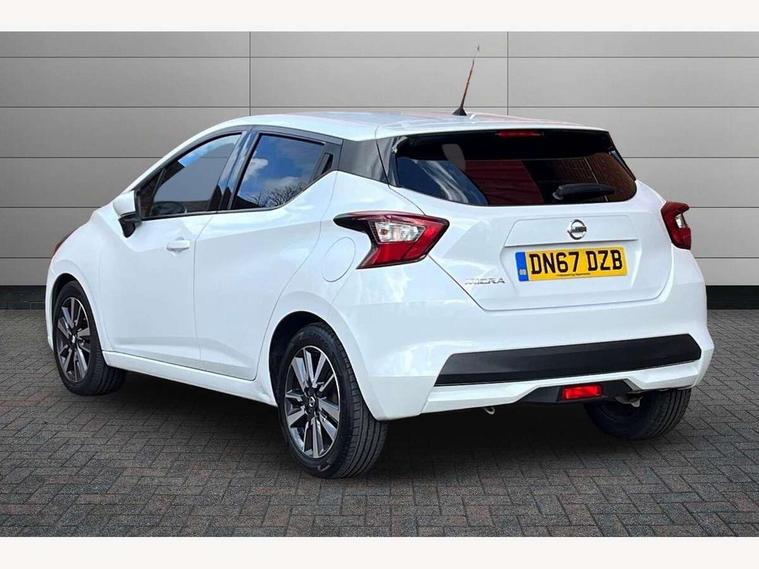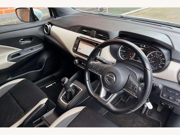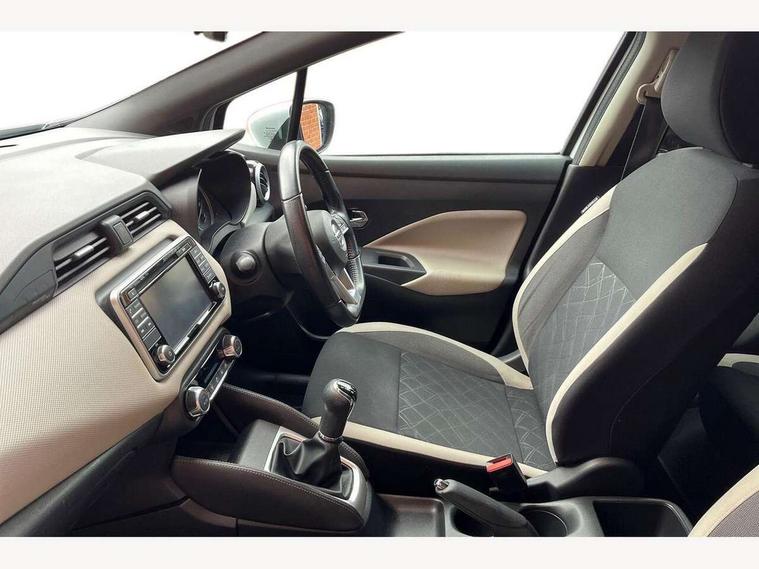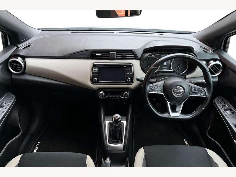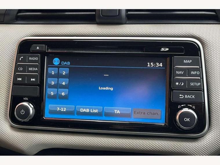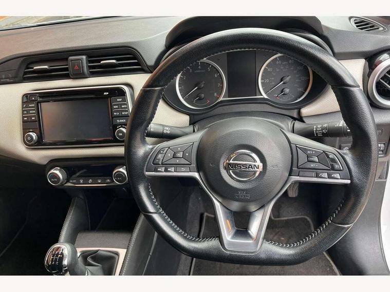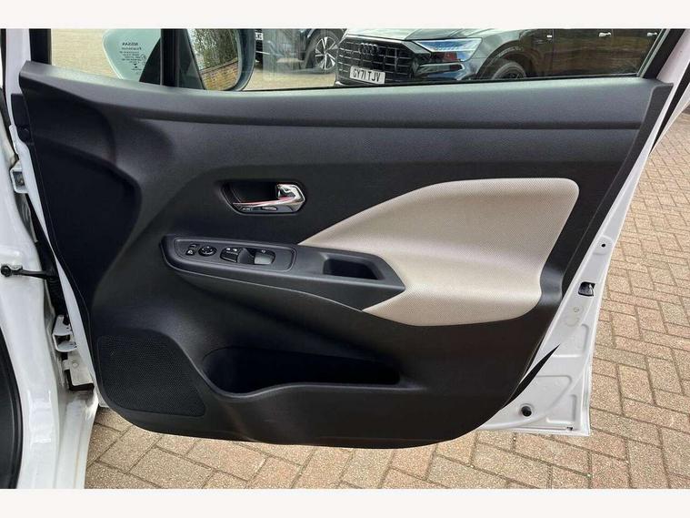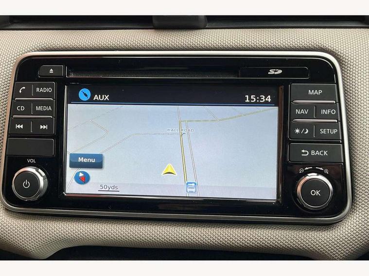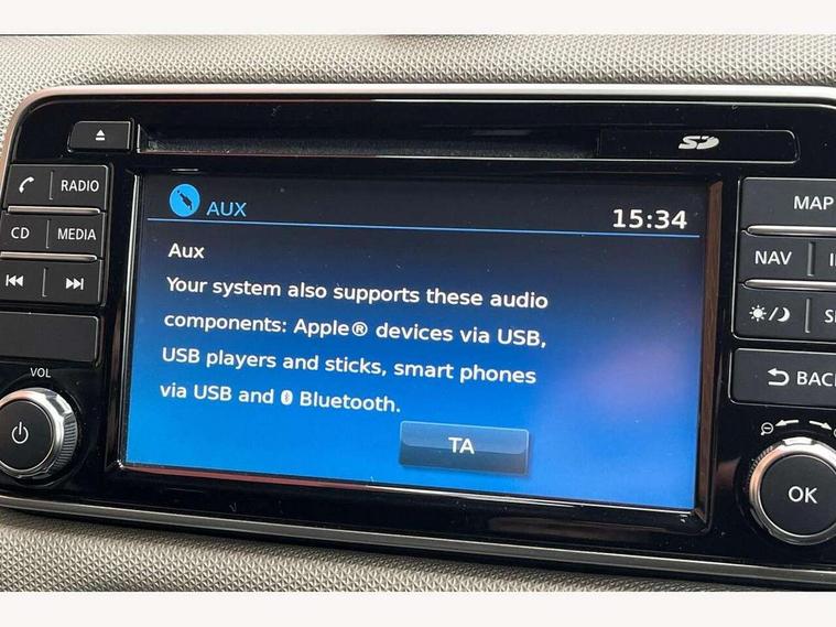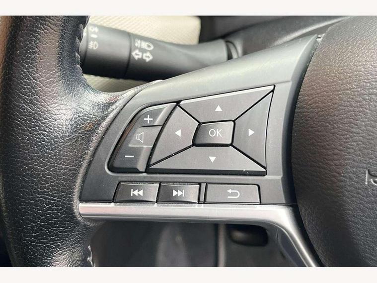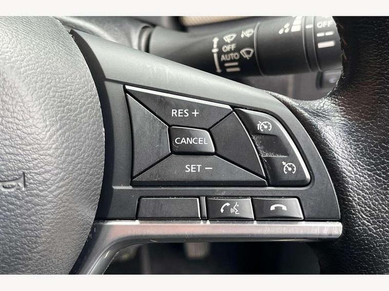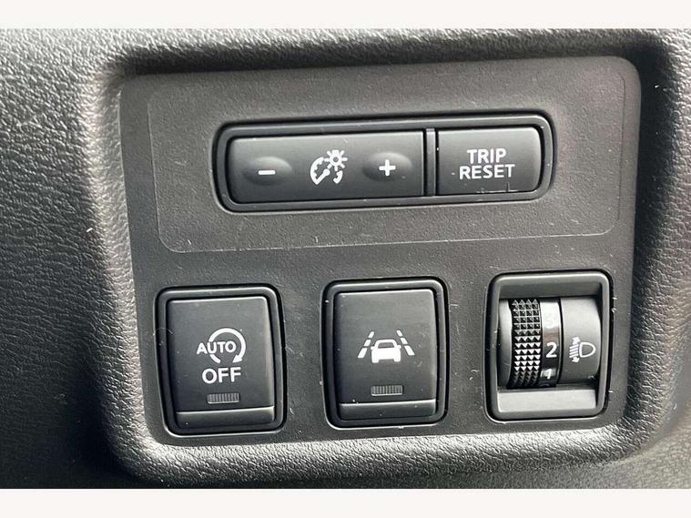 Adjustable speed limiter, Bluetooth system, Cruise control, Driver information module, Lane departure warning system, Nissan connect sat nav system, Outside temperature gauge, Traffic sign recognition, Trip computer, 4 speakers, DAB Digital radio, MP3 player, Radio/single CD player, USB/iPod connection, Automatic headlights with dusk sensor, Body coloured door handle inserts, Chrome door handles, Electric folding door mirrors, Electrically adjustable door mirrors, Front fog lights, Heated door mirrors, High beam assist, High mounted stop lamp, LED daytime running lights, LED indicators in door mirrors, Power front windows, Privacy glass, Rain sensor windscreen wipers, Rear roof spoiler, Rear wiper, 12V power point front, 2 height adjustable rear headrests, 3 cupholders, 60/40 split folding rear seat, Automatic air conditioning, Boot carpet, Boot light, Driver's seat manual height adjust, Driver/passenger sunvisors and vanity mirrors, Front and rear door pockets with bottle holders, Front console storage box, Gear shift indicator, Height adjustable front headrests, Height adjustable steering wheel, Isofix front passenger and rear seat preparation, Leather wrapped steering wheel, LED ambient lighting, Passenger seat back pocket, Satin silver air vents, ABS+EBD+Brake assist, Crash sensor, Driver/Front Passenger airbags, ESP + ASR traction control + CSV understeer control, Forward emergency braking, Front and rear curtain airbags, Front side airbags, Hill start assist, Manual passenger airbag deactivation function, Seatbelt warning, Three 3 point rear seatbelts, Tyre pressure monitoring system, Warning triangle and first aid kit, Anti-theft immobiliser, Remote central locking, 16" alloy wheels, Tyre repair kit,