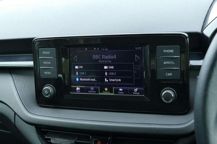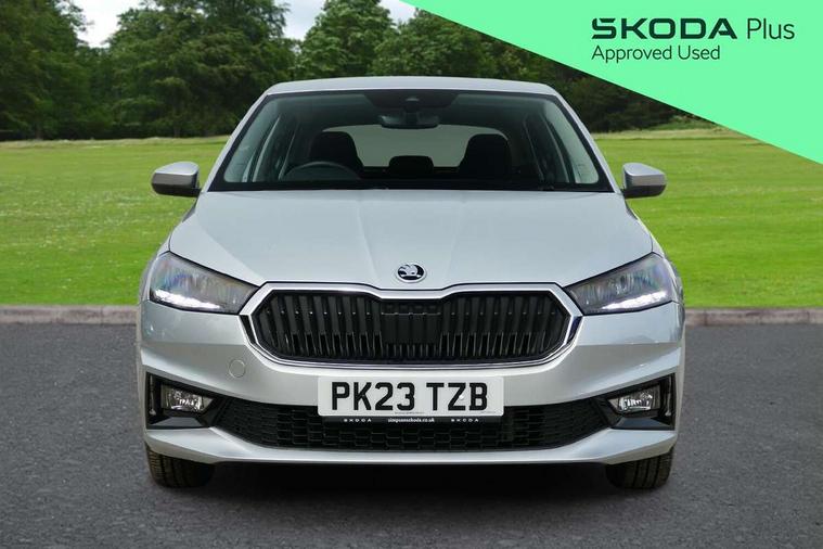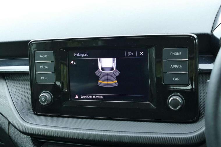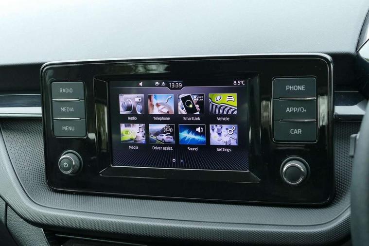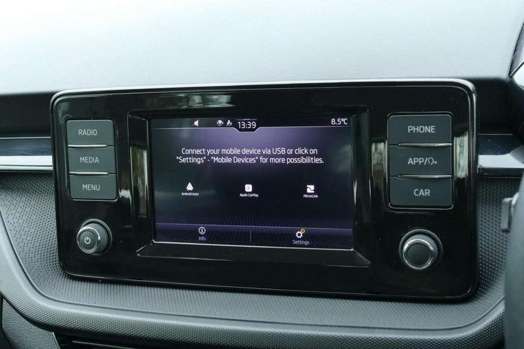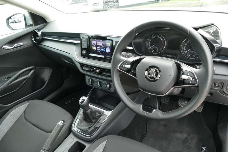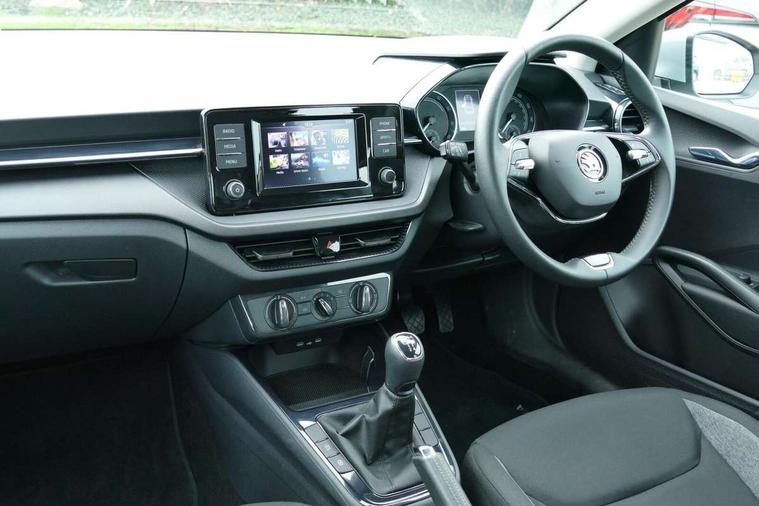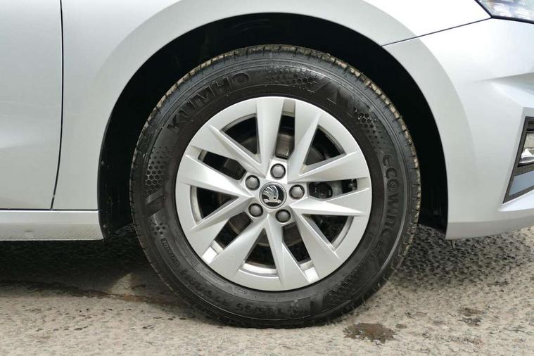 Bluetooth connection, Driver alert system - DAS, Electromechanical power steering, Exterior temperature gauge, Lane assist including road edge detection, Multifunction trip computer in black and white, Service interval indicator, Speed limiter, 2x USB-C in the front (for data transmission and charging), 4 speakers in front, Auxiliary socket for external MP3 player, DAB digital radio reception, Radio Swing with 6.5" colour display, Basic LED Headlights, Basic rear lights, Body colour door mirrors, Body coloured bumpers, Dimming rear view mirror with black frame, Door mirror integrated indicators, Electrically adjustable and heated door mirrors, Electrically adjustable front windows with function auto up/down, Front fog lights, Front window wiper intermittent control, Headlight range control - Automatic, Ice scraper in fuel cap, LED daytime running lights with coming and leaving home feature, Mechanical adjustable rear windows, Rain sensor, Rear LED fog light, Rear side wing doors, Rear window wiper with washing nozzles, Roof mounted spoiler, SKODA tailgate lettering in chrome, Third brake light, 2 reading lights in front and 2 reading lights in rear, 2 spoke leather multifunction steering wheel, 3 rear headrests, Backrest split and folding, Central console with fixed cup holder and storage box, Chrome handbrake release button, Fabric upholstery, Gearshift knob/handle in leather, Grain satin black interior door handles, Hand brake lever handle in leather, Height adjustable front headrests, Height adjustable front seats, Height adjustable steering wheel, ISOFIX and TopTether anchorage points to the outer rear seats, ISOFIX and TopTether on the front passenger seat, Luggage compartment lighting, Manual air conditioning, Manually adjustable lumbar support in front seats, Pollen filter, Rear seat bench unsplit, Single front passenger seat, Storm grey headlining, Sun visors with mirror and airbag label on passenger side, Ticket holder, 3-point height adjustable front seats belts with pretensioner and force limiter, Automatic warning lights in case of crash, Driver and passengers airbag with switch off function, e-Call+, ESC including ABS, MSR, ASR, EDS, HBA and XDS, Front and rear seat belt warning, FRONT ASSIST (AEB City and AEB Inter Urban), Front side airbags, Head airbags, One tone horn, Pedestrian protection, Three rear 3-points safety seat belts with pretensioner and force limiter including stop function for outer rear seat belts, Tyre pressure monitoring system, Anti-theft alarm system including immobiliser, interior monitoring, backup horn, and towing protection, Central locking with radio remote control, interior controls, SAFE function and 2 foldable keys, Black painted air vents, Glossy black decorative trim, Grain satin black central console cover, Grain satin black lower decorative trim, Satin black door and side trim panel in front, Anti-theft wheel bolts protection, Super-low rolling resistance tyres,