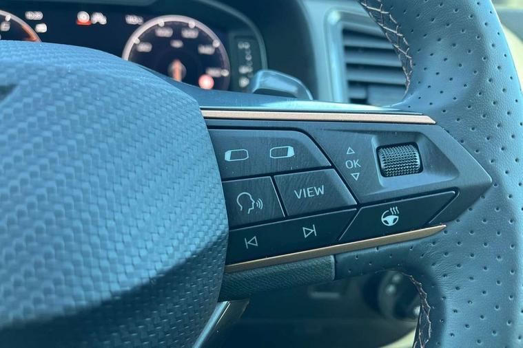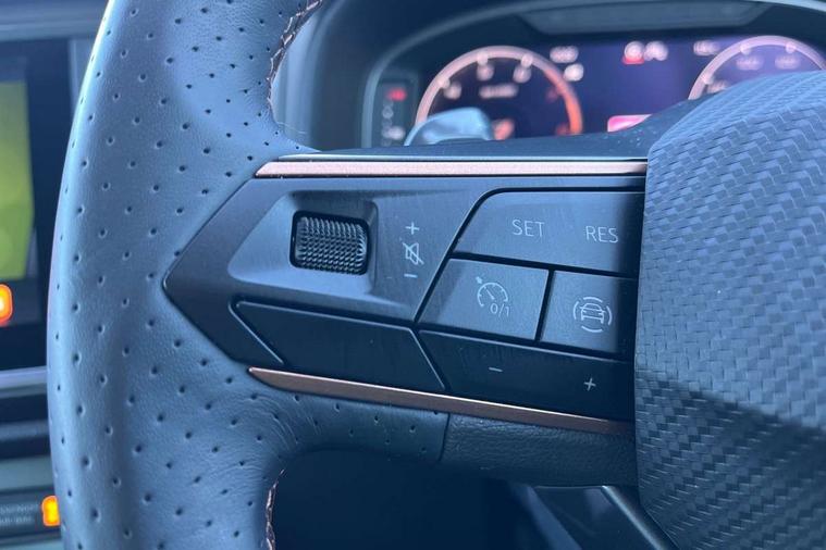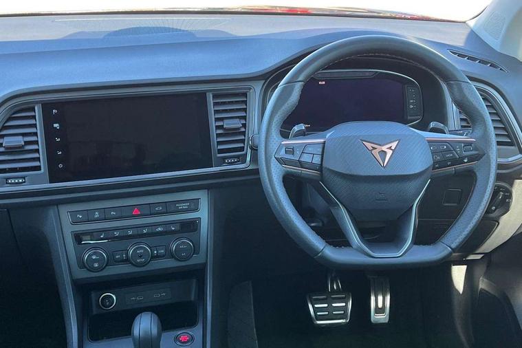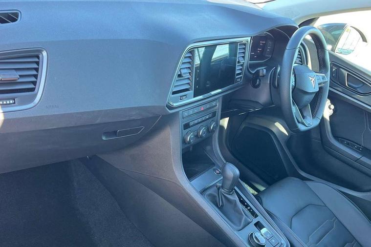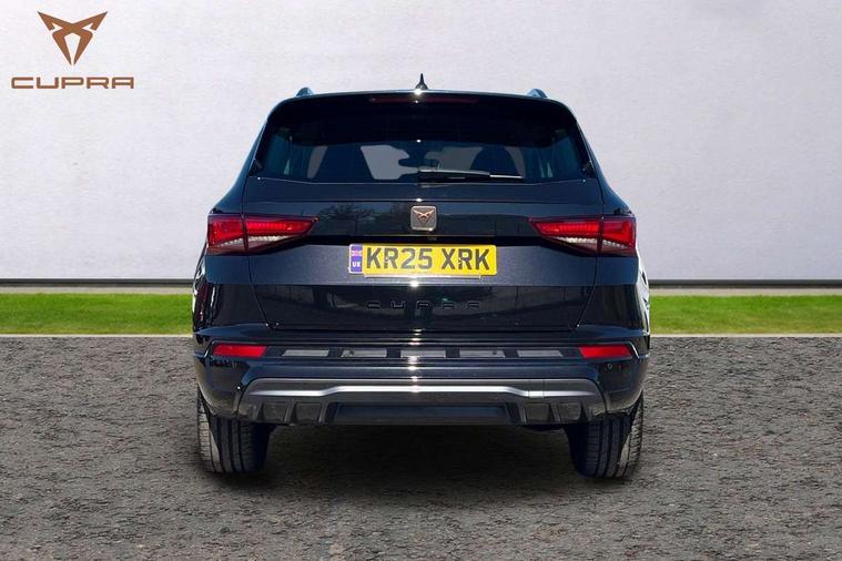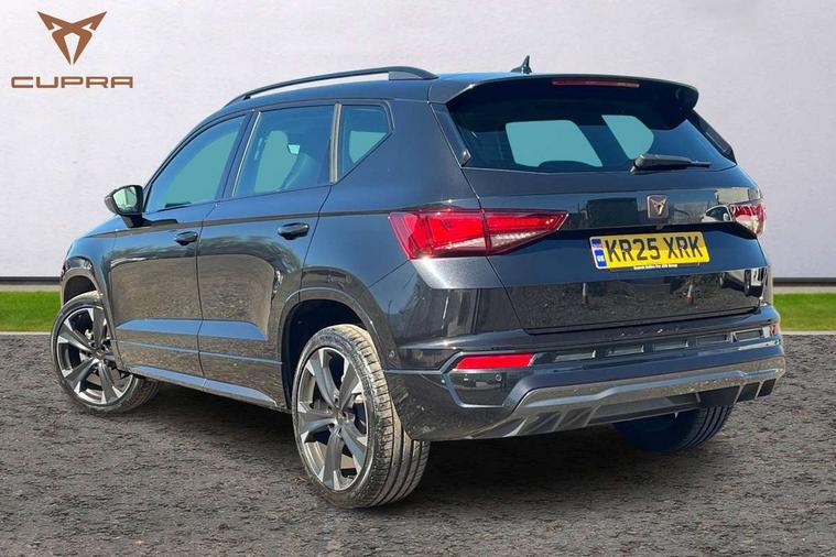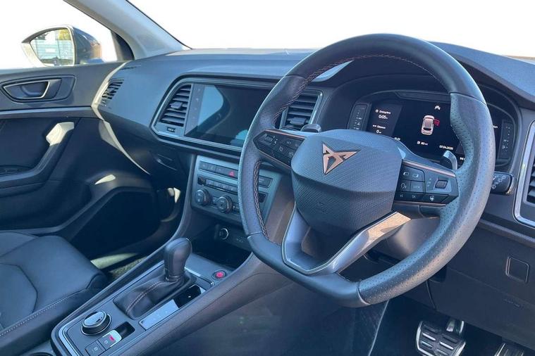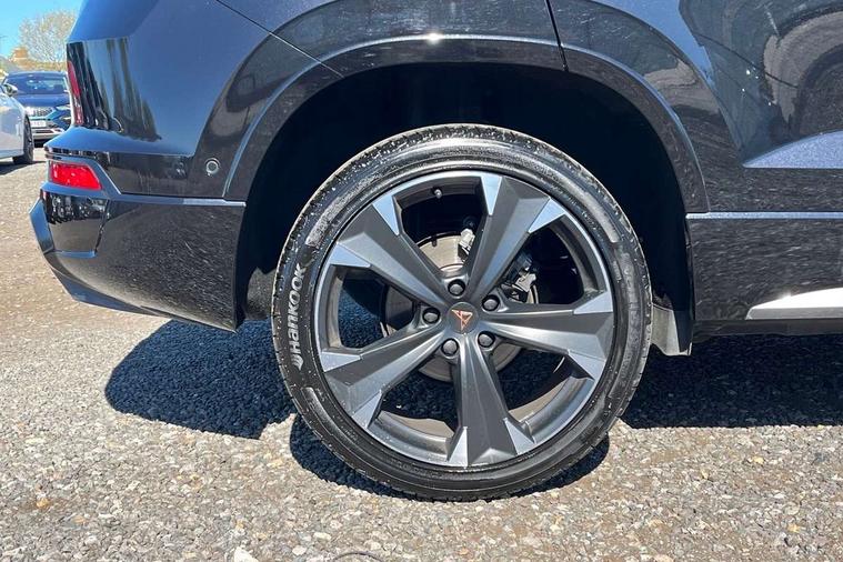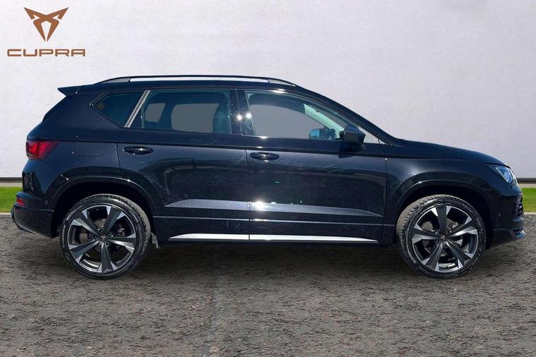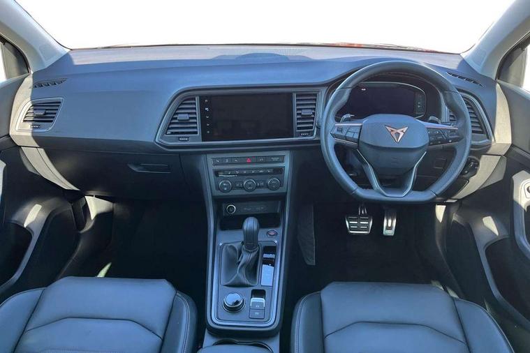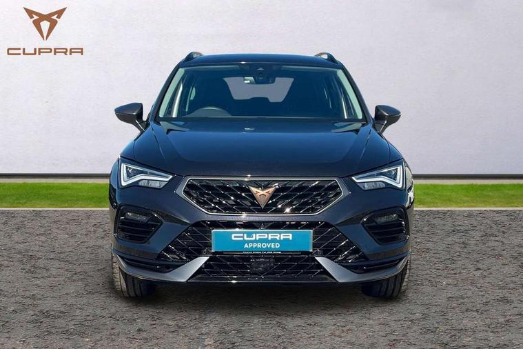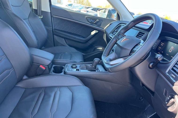 Cruise control system with speed limiter, Digital cockpit, Driving profile selection and conventional shock absorber, E-call, Electric tailgate with virtual pedal, Outside temperature gauge, Progressive power assisted steering, Rear view camera, Self parking functionality (includes front and rear parking sensors), Trip computer, wired and wireless full link smartphone integration, Wireless phone charger, Front and rear shock absorption, chassis with increased ride height, Steering wheel mounted audio/phone controls, Body colour bumpers with dark aluminium diffusor, Body coloured wheel arch surrounds, Dark tinted rear windows, Daytime running lights, Door mirrors with welcome CUPRA light silhouette, Dynamic headlight range control with self adjusting whilst driving, Electric adjustable/heated/folding door mirrors, Front and rear electric windows, Front grille frame in chrome, Full LED headlamps with lens and LED front fog lamps with cornering function, Gloss black door mirrors, Gloss black roof rails, Gloss black side mouldings, Gloss black side window trim, Illuminated aluminium front door sill, LED rear tail lights with dynamic indicators, Rear fog lights, Rear side wing doors, Rear spoiler, Rear wash/wipe, Specific CUPRA design front bumper, Standard rear exhaust tailpipes, Third brake light, 12V socket in front, 3 seat bench in 2nd row, 60/40 split folding rear seat, Aluminium pedals, Cupra steering wheel emblem, Dual zone climate control, Electric driver seat with memory function, Front and rear head restraints, Front centre armrest, Front seat back storage pockets, Grey roof lining, Heated front seats, Heated steering wheel, Height adjustable driver and passenger seat with lumbar adjustment, ISOFIX points in outer rear seats with top tether anchorage points, Leather sport bucket seats, Leather steering wheel and gear knob, Multicoloured ambient lighting with LED interior illumination, Pedal cluster, Rear armrest and easy back seat release mechanism from boot, Single front passenger seat, Sports steering wheel, Steering wheel mounted gearshift paddles, Storage compartment in roof console for sunglass, Storage compartment under driver's seat, Convenience pack - Ateca, Interior lighting pack - Ateca, Navigation system plus pack with DAB - Ateca, Safety and driving pack - Ateca, 3x3 point rear seatbelts, ABS, Traction control system (TCS), Electronic stability control (ESC) and Electronic differential lock system (XDS), Airbags - Driver and front passenger airbag with deactivation, front side, two curtain and driver's knee airbags, Black brake callipers with CUPRA logo, Electric parking brake with auto hold function, Front and rear seatbelt reminder, Front assist with autonomous emergency braking, Hill hold control, Manual rear child locks, Single tone horn, Tiredness recognition system, Tyre pressure monitoring system, Alarm, Keyless entry, Locking wheel bolts, 19" Sport machined alloy wheels 36/3 in black/silver,