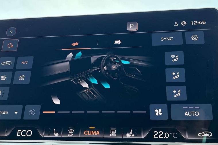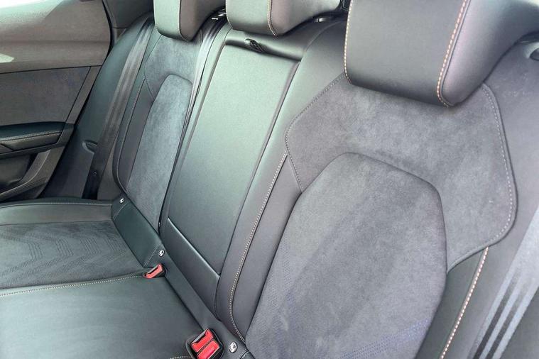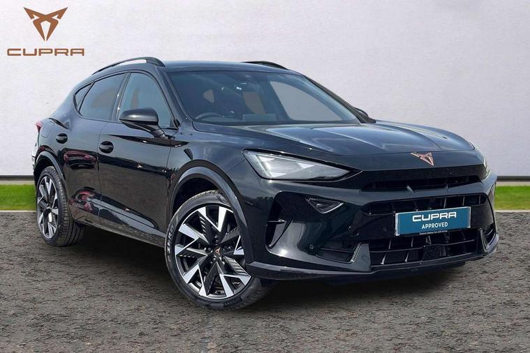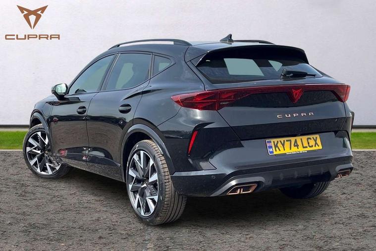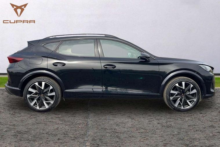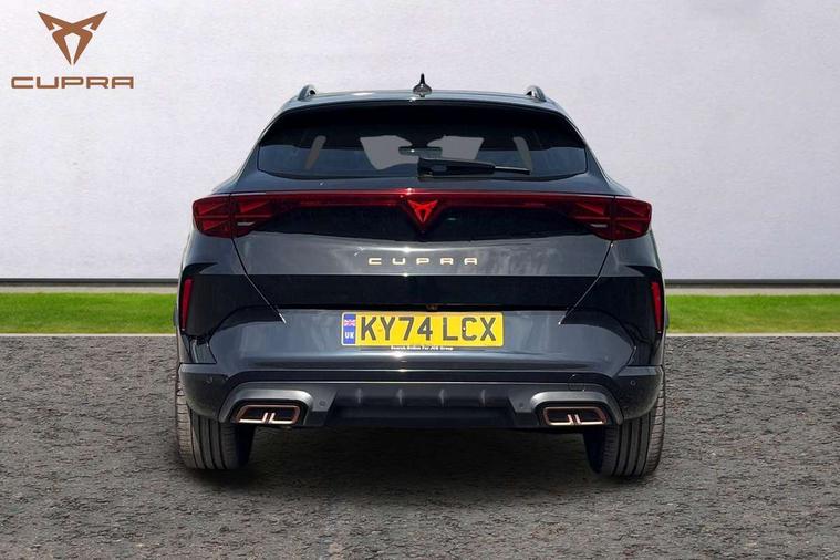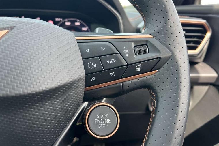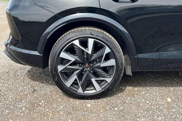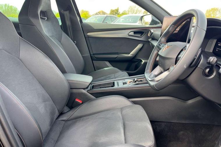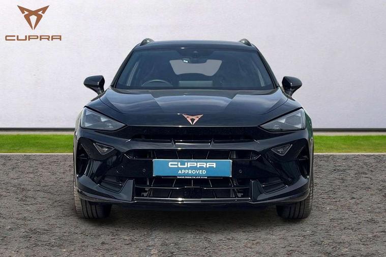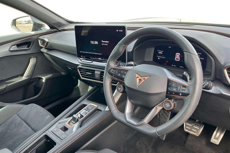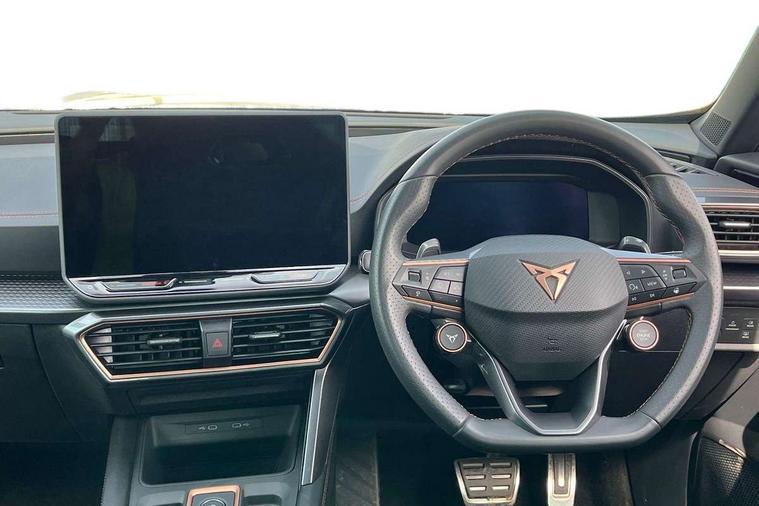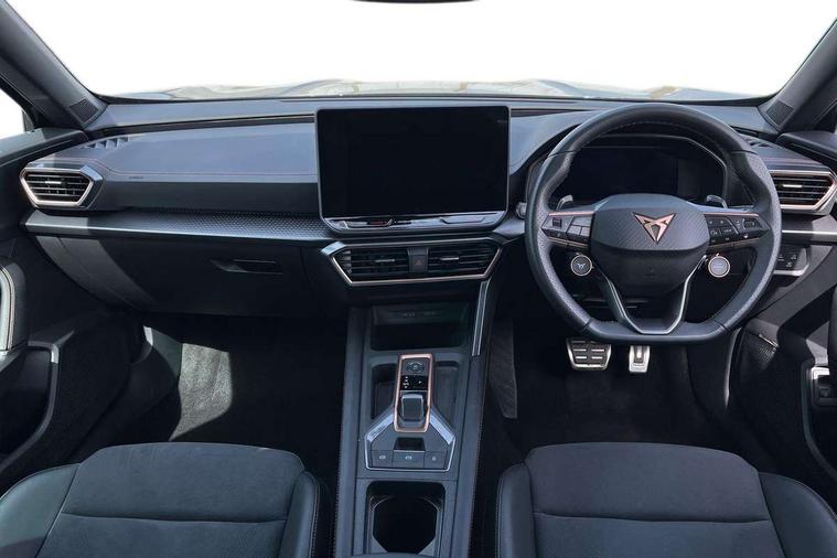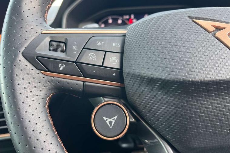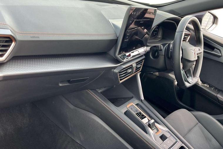 10.25" digital cockpit and configurable dashboard, Adaptive cruise control with follow-to-stop and speed limiter, Advanced driver alert system, Driving profile selection, Dynamic road sign display, Emergency steering support with turn assist, Forward collision warning with automatic braking, Front and rear parking sensors, Full link phone integration, Lane assist, Progressive steering, Rear view camera, RPM, trip computer, outside temp gauge, instrument light brightness, low fuel warning light, lights on reminder, gearshift indicator, Service interval indicator, Start/stop system with regenerative braking, Virtual pedal and electric tailgate, Voice control system, Wired Android Auto, Wireless apple carplay, Wireless phone charger, 10 amp mode 2 charging cable, 32 amp mode 3 charging cable, CUPRA sport suspension, Electronic locking differential and dynamic traction support, 2 front and 2 rear USB type C sockets, Media system with navigation, 12.9" touchscreen display, voice control, DAB, steering wheel mounted controls, Auto dimming rear view mirror, Body colour door handles, Body coloured bumpers, Dark grey wing mirror, Daytime running light with automatic headlight control and coming home feature, Door panel ambient lighting, Dynamic headlight range control, Electric front/rear windows, Electrically adjustable heated and folding door mirrors with memory function, Gloss black roof rails and window surrounds, High beam assist, LED 3rd brake light, LED front fog lamps with cornering function, LED Headlights, LED Taillights with dynamic indicator, Rain sensing wipers, Rear diffuser with copper simulated exhaust pipes, Rear fog lights, Rear side wing doors, Rear wash/wipe, Tinted rear windows, Welcome lights (within exterior mirror housing), 12V socket, 2 front and 2 rear reading lights, 3 seat bench in 2nd row, 60/40 split rear bench seat with armrest and mechanical seat release, Black headlining, Black interior roof lining, Cupra sports pedals, Dust/pollen filter, Electrically adjustable driver's seat with memory and lumbar support, Front and rear head restraints, Front centre armrest, Heated front seats, Heated supersports multifunction leather steering wheel with satellite buttons and gear shift paddles, Height/reach adjust steering wheel, Illuminated aluminium doorsteps, Illuminated interior front door sills, Illuminated sunvisor with mirror, Isofix, Leather dashboard, door insert and side trim panel, LED smart wraparound lighting, PVC/Dinamica microfiber upholstery + bucket seats, Satellite steering wheel, Single front passenger seat, Storage pockets on rear of front seats, Three zone climate control with control panel in rear, 3 point seatbelts on all rear seats, ABS, Brake control system - ESC and brake booster, Child proof door locks, Driver and front passenger airbags with front passenger airbag de-activation, Electronic parking brake, Front and rear disc brakes, Front side curtain airbags, Hill hold control, Public e-call, Seat belt reminder for front and rear seats, Tyre pressure monitoring system, Anti theft alarm system, KESSY Advanced - Keyless start, keyless entry with SAFELOCK, Locking wheel bolts, Copper and aluminium interior detailing, 19" Sandstorm machined sport black and silver alloy wheels, Breakdown and tool kit,