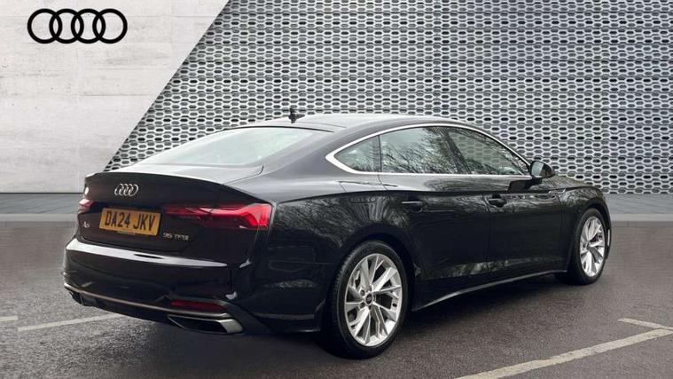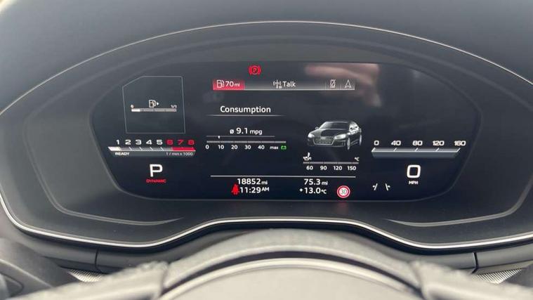 Audi connect safety and service (e-call), Audi drive select (Auto, Comfort, Dynamic and Individual), Audi smartphone interface, Audi virtual cockpit - 12.3" full colour digital instrument cluster, vehicle/engine speed, Radio/media information+Driver assistance systems, Automatic start-stop system with coasting functionality and efficiency programme, Bluetooth interface, Camera based traffic sign recognition, Electro-mechanical power steering, Email, calendar and text messages displayed via MMI, Front and rear parking sensors, Lane departure warning, MMI nav+ with MMI touch - 10.1" high resolution MMI display, touch sensitive, 3D map, route/country info, dynamic route guide, personal route assist, Power operated tailgate, Rear view camera, Service interval indicator, Voice control system, 54 litre fuel tank, Comfort dynamic suspension, 8 passive loudspeakers, CD player, DAB digital radio reception, Two additional USB ports for rear passenger in rear centre console, Two SDXC card slots, Auto dimming door mirrors, Auto dimming rear view mirror, Body colour bumpers, Body colour door handles, Body colour side sill trim, Body coloured door mirrors, Electric adjustable heated door mirrors, Electric folding door mirrors, Electric front windows, Front fog lights, Kerb-view function for passenger side, LED headlights and rear lights with LED daytime running lights, LED side indicator lights integrated into door mirrors, LED third brake light, Matt aluminium silver tailpipe trim, Radiator grille in matt anthracite black and air inlets with inserts in matt aluminium silver, Rain and light sensors, Rear diffuser in matt anthracite black with trim strip in matt aluminium silver, Rear side wing doors, Rear wiper, Sport front and rear bumpers with side skirts, Variable front intermittent wipers, Windscreen with acoustic glazing, 3 seat bench in 2nd row, 3 spoke high multi-function leather sport steering wheel with paddle shift and height and reach adjustable, 4 way electric lumbar support for driver and front passenger, 40/20/40 split folding 3 seater rear bench seat, Black carpets, Deluxe 3 zone electronic climate control, Front centre armrest, Front door sill trims with aluminium inlay, Front head restraints, Front/rear floor mats, Heated front seats, ISOFIX child seat mounting and top tether, Luggage compartment mat, Manual seat adjustment, Rear centre armrest, Rear headrests, Single front passenger seat, Sunvisors with vanity mirrors, Twin leather upholstery + front sports seats, LED interior light pack - A5/RS5, 3x3 point rear seatbelts, 6 airbags - Driver, front passenger, curtain and side airbags, Attention and drowsiness assist, Electromechanical parking brake, Electronic Stabilisation Control (ESC) including ABS, ASR and EDL, Front passenger airbag deactivation, Height adjustable front seatbelts, Hill hold assist, Manual child lock in rear doors, Multi collision brake assist, Pop-up bonnet for pedestrian protection, Pre sense city, Seatbelt monitoring, Tyre pressure warning, Variable restraint system, Warning triangle and first aid kit, Anti theft alarm system, Anti theft wheel bolts, Immobiliser, Keyless Go, Remote central locking, Aluminium ellipse silver inlays, Tool kit, Tyre repair kit,