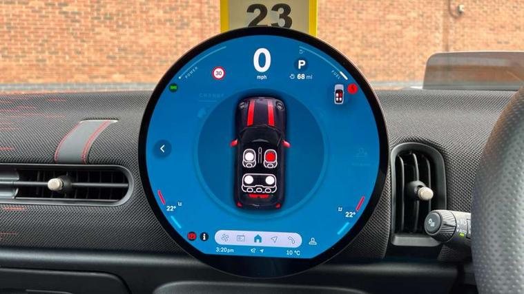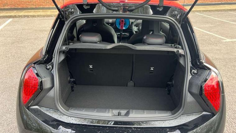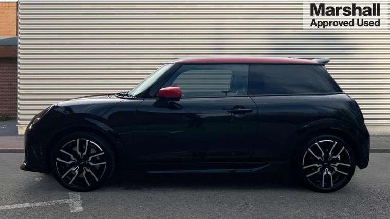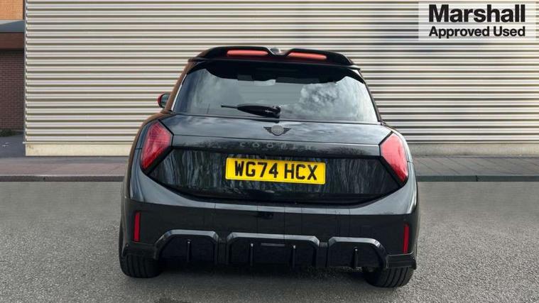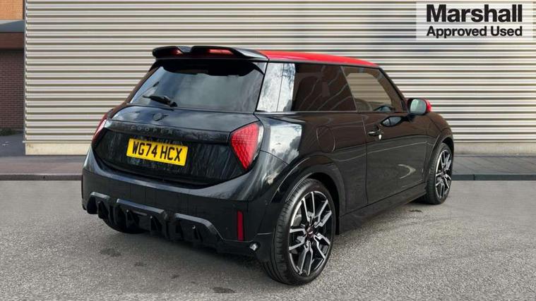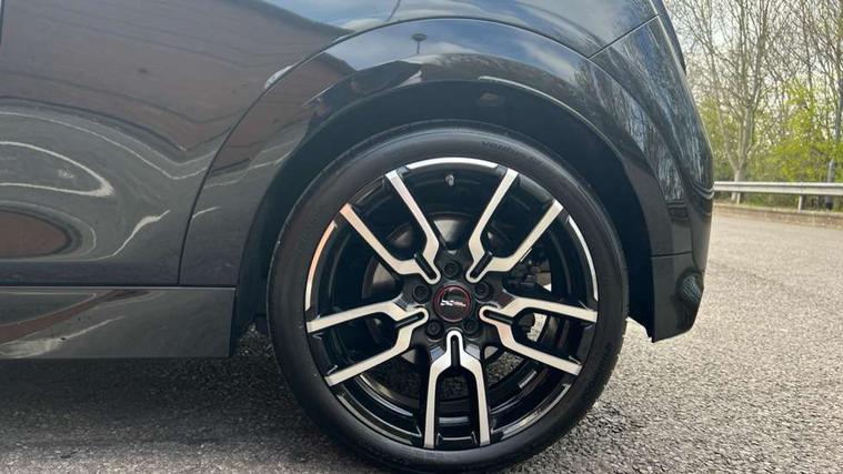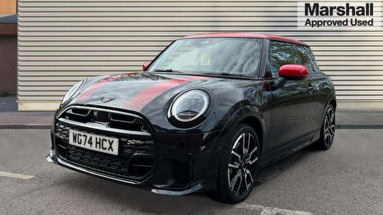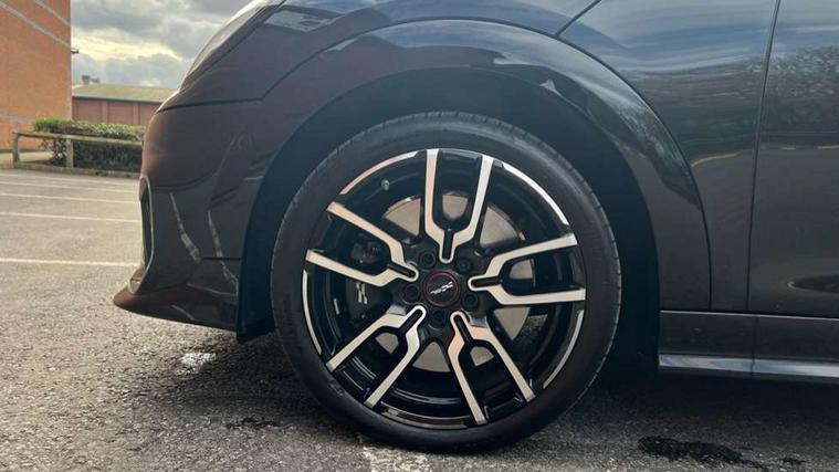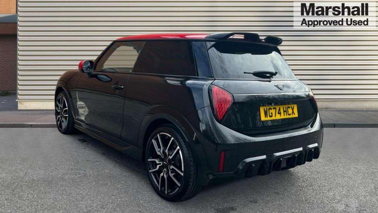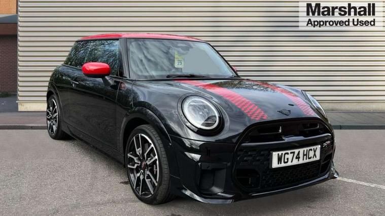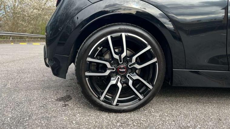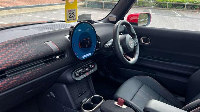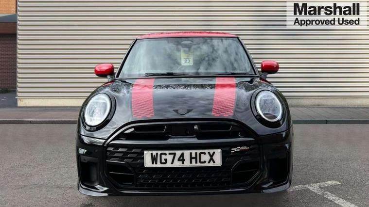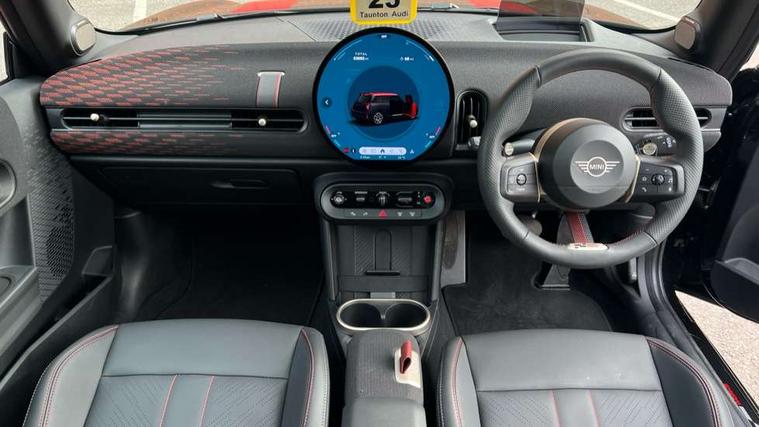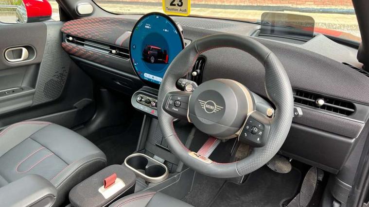 Central toggle bar, Circular OLED Screen, Compatible mobile phone bluetooth with audio streaming, Cruise control, Digital instrument cluster, Electro-mechanical speed dependant steering assistance, Emergency call service, MINI Experience Modes, Mini navigation system, On board computer, Service interval indicator, 7 speed steptronic sport transmission with double clutch, Adaptive suspension, DAB Digital radio, Personal eSim, Auto headlights, Electric adjustable heated door mirrors, Electric front windows, Front and rear apron, Heated rear window, Heated windscreen washer jets, High gloss black wheel arches, High gloss hexagonal patterned grille surround, JCW body kit, LED daytime running lights, LED Headlights, LED indicator lights, LED rear lights, Rain sensor window wipers, Rear fog lights, Rear roof spoiler with airblades, Rear window wiper, 2 seat bench in second row, 2 zone automatic air conditioning, 60/40 rear seat bench, Ambient lighting, Black lower band in high gloss, Cupholders, Dark headliner, Floor mats, Front and rear head restraints, Front compact armrest, Heated steering wheel, Height adjustable passenger seat, Lidded storage box in Black/Red knit, Luggage compartment lighting, Partially perforated vescin steering wheel with red accent, black/red decorative strap, Single front passenger seat, Steering wheel paddle shift, Sunvisors with vanity mirrors, Vescin/Cord upholstery, Driving assistant pack - Cooper Hatchback, Park assistant pack - Cooper Hatchback, 3 point seatbelts on all four seats, 6 Airbags - front, side, head and seat belt tensioners, Acoustic pedestrian protection, Anti-lock braking system (ABS), Brake caliper in Black with JCW badge, DSC - Dynamic Stability Control, Electronic parking brake, Front and rear disc brakes, Front ISOFIX (iSize), Front passenger airbag deactivation, JCW Sport Brakes, Traction control, Tyre pressure monitoring system, Alarm, Immobiliser, Remote central locking, Black/Red decorative dash strap, JCW Black/Red dashboard knit, Tyre repair kit,