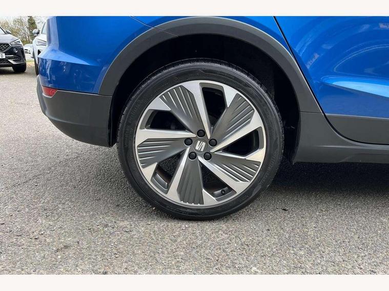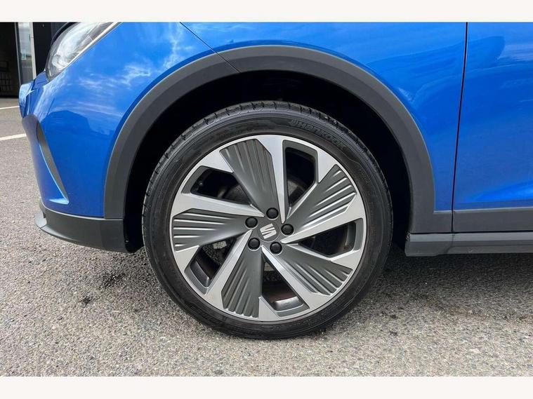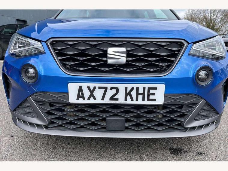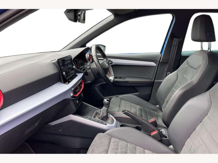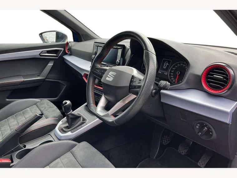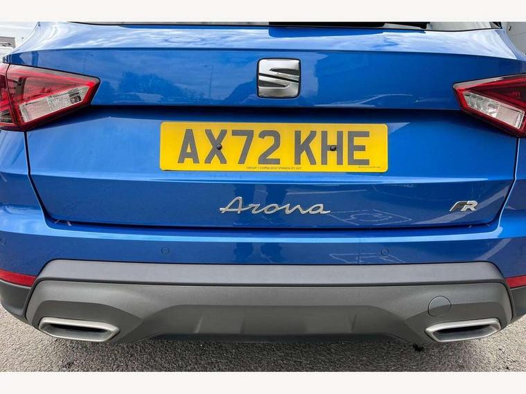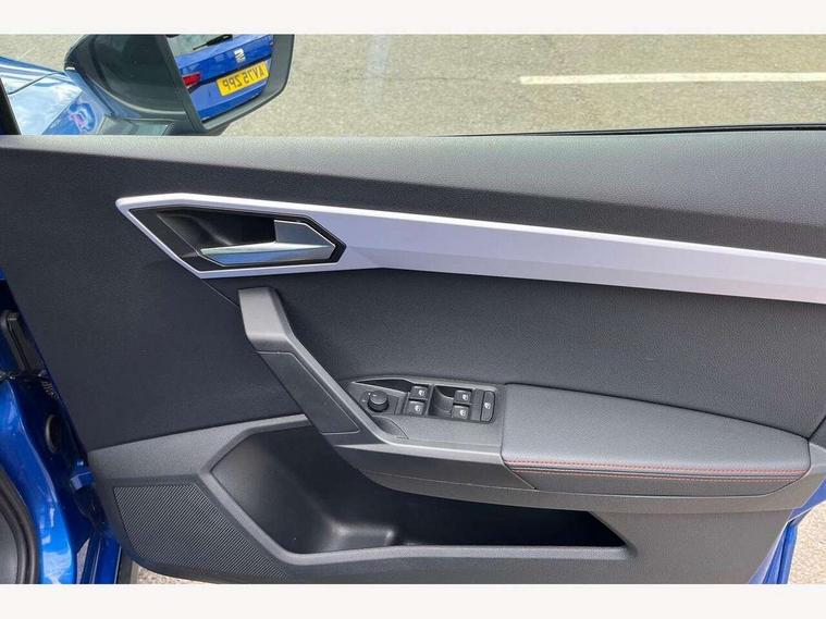 'Lights On' Reminder warning buzzer, Analogue cockpit with physical dials, Digital clock, E-call, Electric speed sensitive power steering, Full Link Smartphone Integration with Mirror Link, Apple Car Play, Google Android Auto with USB Type C cable for Apple and Android compatibility, Lane keeping system, Low fuel warning light, Outside temperature display, Rear parking sensor, RPM counter, Seat connect with safety, service and remote, SEAT Drive profile - Four different models normal-sport-eco-individual, steering response, throttle response, Trip computer, Wireless phone charger, Bluetooth interface for hands free and audio streaming, DAB digital radio and AM/FM radio, Media system with 8.25" colour touchscreen with USB port (type c), Steering wheel mounted audio controls, Anti theft roof antenna, Automatic activation of hazard warning lights, Body coloured bumpers, Body coloured door handle inserts, Chrome roof rails and window surrounds, Dark tinted rear windows, Dimming rear view mirror, Electric front/rear windows, Electrically adjustable and heated door mirrors, Front fog lights with cornering function and rear fog light, FULL LED automatic headlights with dynamic headlight range control, coming and leaving home, LED daytime running lights, LED rear tail lights and licence plate lights, Protective side mouldings, Rear side wing doors, Rear spoiler, Rear window wash/wipe, Roof colour door mirrors, Third brake light, Twin exhaust pipe styling hidden exhaust pipe, Visible VIN plate, Windshield wiper with intermittent control and potentiometer, 2 cupholders, 3 seat bench in 2nd row, 60/40 split folding rear seat, Aircare filter, Black interior roof, Double boot floor, Driver sunvisor with covered mirror + card holder, Dual zone climate control, Front comfort seats, Front courtesy light with 2x front and 2x rear reading lights, Gear shift indicator, Height adjustable front seats, Height/reach adjustable steering column, Illuminated boot, Instrument lighting with brightness control, Interior ambient lighting, Interior light in footwell, central console and door panel, ISOFIX points in outer rear seats with top tether anchorage points, Microsuede cloth upholstery, Passenger sunvisor with vanity mirror, Perforated flat bottomed leather steering wheel/gear knob/handbrake with red stitching and FR logo, Single front passenger seat, Two front and three rear height adjustable headrests, Interior chrome pack - Arona, 3 point seatbelts on all rear seats, ABS, Active front headrests, Child locks on rear doors, Driver and front passenger airbags with front passenger airbag de activation, front side and curtain airbags, Electronic stability control, Emergency Brake Assist (EBA) and front assist, Front and rear seatbelt reminder, Hill hold control, Multi-Collision braking, Tiredness recognition system, Traction control, Tyre pressure monitoring system, Alarm with back-up horn, Electronic engine immobiliser, KESSY Keyless entry and go, Locking wheel bolts, Remote central locking + deadlocks, Tow away protection, Titan black dashboard,