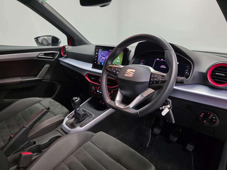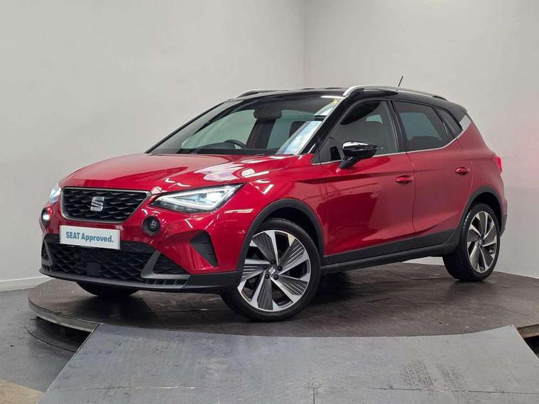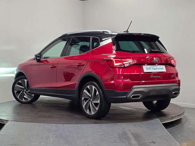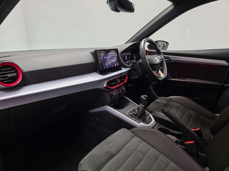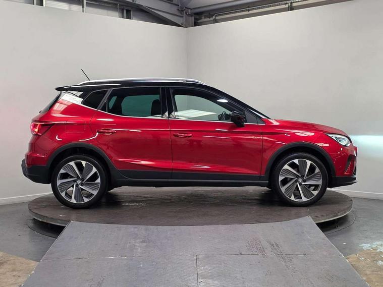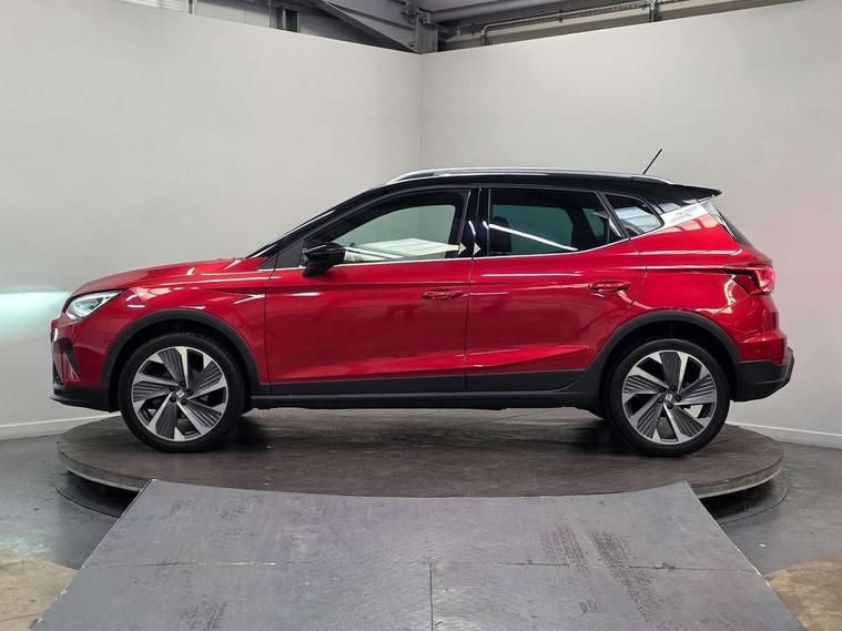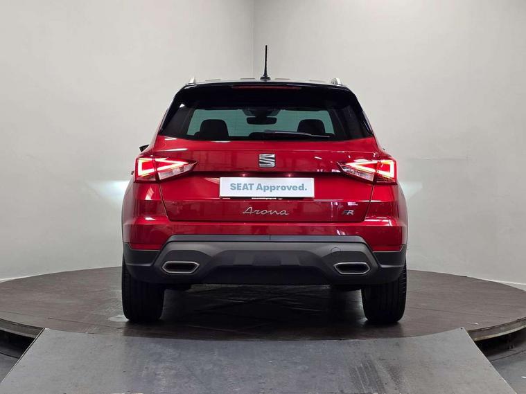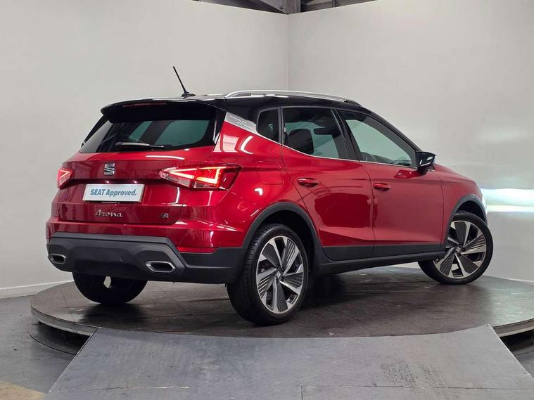 'Lights On' Reminder warning buzzer, 10" Digital cockpit, Digital clock, E-call, Electric speed sensitive power steering, Full Link Smartphone Integration with Mirror Link, Apple Car Play, Google Android Auto with USB Type C cable for Apple and Android compatibility, Lane keeping system, Low fuel warning light, Outside temperature display, RPM counter, SEAT Drive profile - Four different models normal-sport-eco-individual, steering response, throttle response, Trip computer, Wireless phone charger, 9.2" colour touchscreen with navigation system, voice control and USB port (type c), Bluetooth interface for hands free and audio streaming, DAB digital radio and AM/FM radio, Steering wheel mounted audio controls, Anti theft roof antenna, Auto dimming interior rear view mirror, Automatic activation of hazard warning lights, Body coloured bumpers, Body coloured door handle inserts, Chrome roof rails and window surrounds, Dark tinted rear windows, Electric front/rear windows, Electrically adjustable, heated and folding door mirrors, Front fog lights with cornering function and rear fog light, FULL LED automatic headlights with dynamic headlight range control, coming and leaving home, LED daytime running lights, LED rear tail lights and licence plate lights, Protective side mouldings, Rain sensing wipers, Rear side wing doors, Rear spoiler, Rear window wash/wipe, Roof colour door mirrors, Third brake light, Twin exhaust pipe styling hidden exhaust pipe, Visible VIN plate, 2 cupholders, 3 seat bench in 2nd row, 60/40 split folding rear seat, Aircare filter, Black interior roof, Double boot floor, Driver sunvisor with covered mirror + card holder, Dual zone climate control, Front comfort seats, Front courtesy light with front reading lights, Front seat back storage pockets, Gear shift indicator, Heated front seats, Height adjustable front seats, Height/reach adjustable steering column, Illuminated boot, Instrument lighting with brightness control, Interior ambient lighting, Interior light in footwell, central console and door panel, ISOFIX points in outer rear seats with top tether anchorage points, Microsuede cloth upholstery, Passenger sunvisor with vanity mirror, Perforated flat bottomed leather steering wheel/gear knob/handbrake with red stitching and FR logo, Potentiometer, Single front passenger seat, Two front and three rear height adjustable headrests, Interior chrome pack - Arona, Safe and driving pack (S) - Arona, 3 point seatbelts on all rear seats, ABS, Active front headrests, Child locks on rear doors, Driver and front passenger airbags with front passenger airbag de activation, front side and curtain airbags, Emergency Brake Assist (EBA) and front assist, Front and rear seatbelt reminder, Hill hold control, Multi-Collision braking, Tiredness recognition system, Traction control, Tyre pressure monitoring system, Alarm with back-up horn, Electronic engine immobiliser, Locking wheel bolts, Remote central locking + deadlocks, Tow away protection, Titan black dashboard, 18" Performance Cosmo grey matt alloy wheels,
