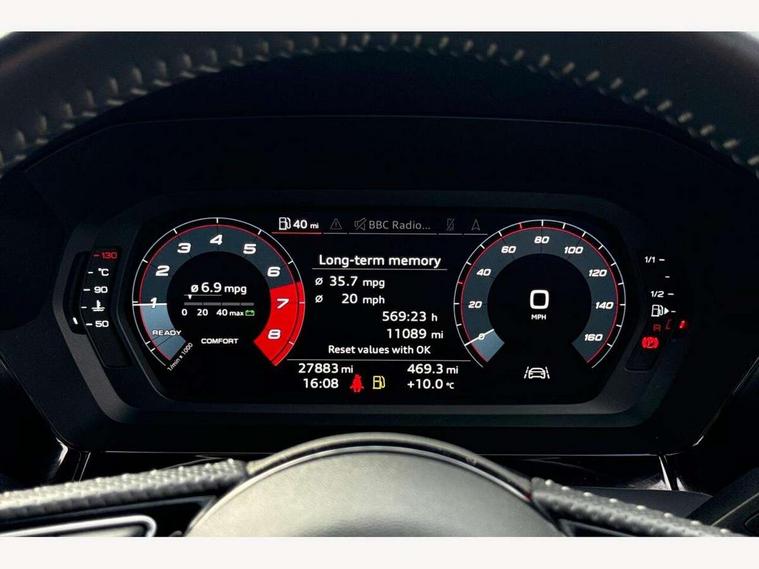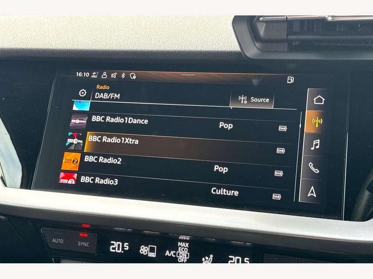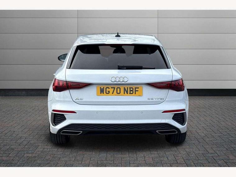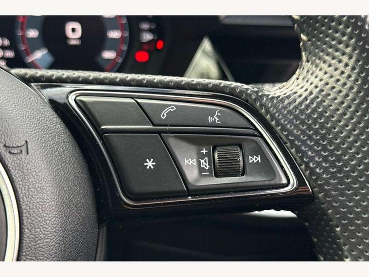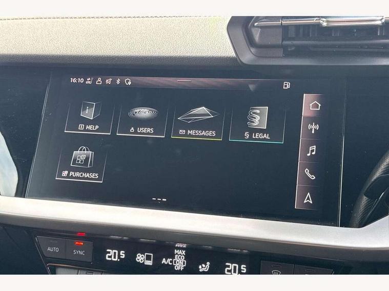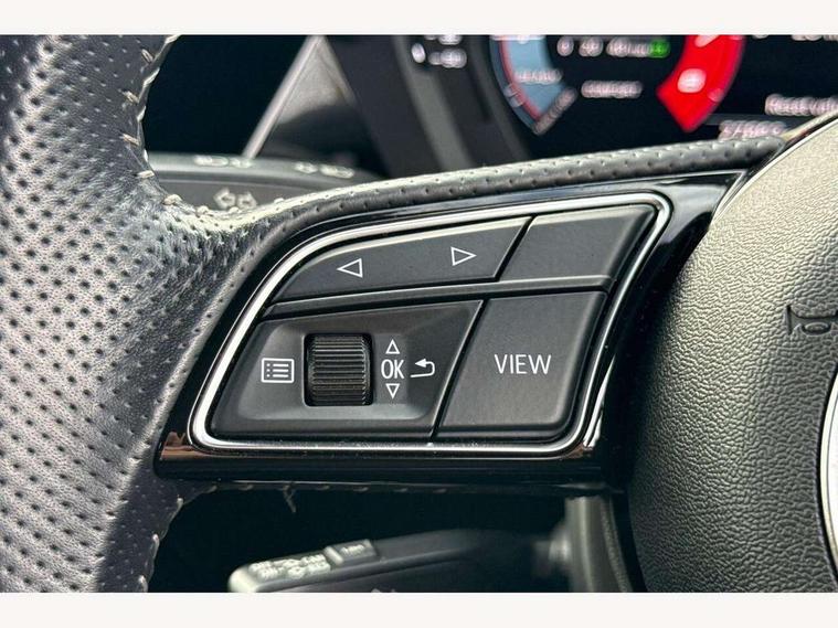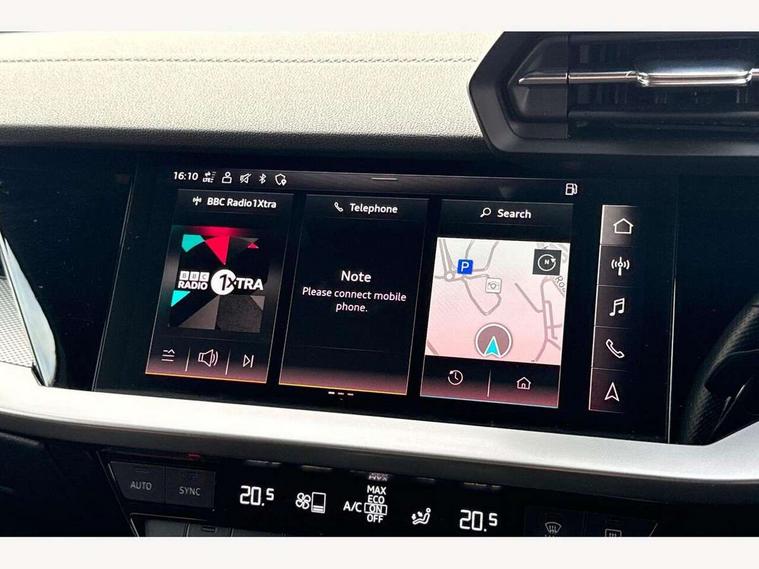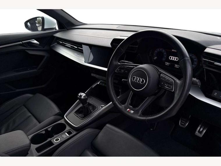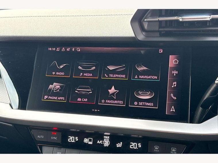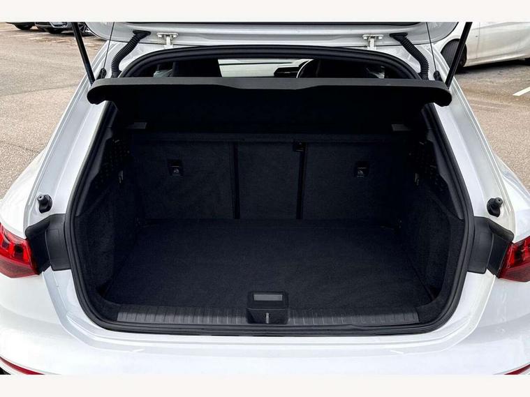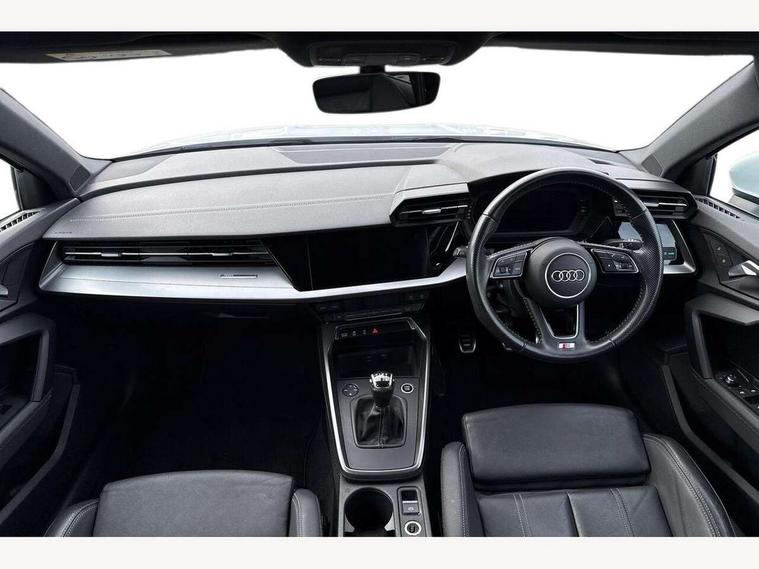 Audi connect emergency call and service, Audi drive select (Auto, Comfort, Dynamic, Efficiency and Individual), Audi smartphone interface, Audi Virtual Cockpit - 10.25" digital and colour instrument cluster, Automatic start/stop system with recuperation, Bluetooth interface, Collision avoidance assistant, Cruise control, Electromechanical power speed sensitive steering, Lane departure warning system, MMI Navigation Plus with high resolution 10.1" colour touch screen display, Rear parking sensors, Service indicator, Trip computer, Voice control system with natural language interaction, 1xUSB-A and 1xUSB-C connection, 6 passive loudspeakers, DAB Digital radio, Acoustic glass windscreen, Aluminium window trim, Auto dimming frameless rear view mirror, Body colour exterior mirrors, Electrically adjustable/heated/folding/dimming door mirrors with kerb view includes integrated LED indications + kerb view function for passenger side, Front electric windows, Illuminated aluminium inserts front door sills with S logo, LED daytime running lights, Light and rain sensors, Privacy glass - dark tinted rear window, rear door and side windows, Rear electric windows, Rear side air outlets in grained matt black, Rear wiper, S line bumpers, S roof spoiler, 12V socket and storage compartment in front centre console, 40/20/40 split folding rear seat bench with cupholder, Black cloth headlining, Dual zone electronic climate control, Front and rear centre armrest in leather, Front and rear headrests, Front/rear floor mats, Height and reach adjustable steering wheel, Interior lighting - glove compartment light and right hand side, Luggage compartment floor covering, Manual boot compartment lid, Manually adjustable front seats, Seat side bolsters, Stainless steel pedals and front footrest, Twin leather upholstery with front sports seats S embossed logo, Aluminium interior elements pack - A3 Sportback, S line styling pack - A3 Sportback, 3x3 point rear seat belts, Driver and front passenger airbag with passenger airbag deactivation, Electronic Stabilisation Control (ESC) including ABS, ASR and EDL, First aid kit with warning triangle and 2 safety vests, Hill hold assist, Pre-sense front with pedestrian and cyclist detection, Seatbelt monitoring, Tyre pressure loss indicator, Anti theft alarm, Anti-theft wheel bolts, Electronically operated child lock, Immobiliser, Remote control central locking, Accent surfaces in the dashboard and centre console in platinum grey silk effect paint finish, Dark spectrum aluminium inlays,