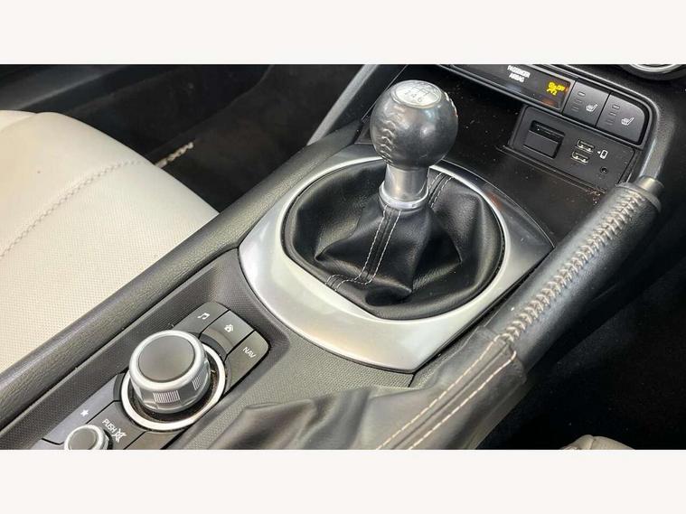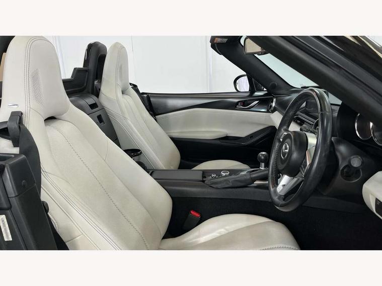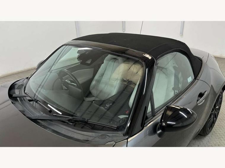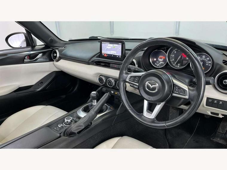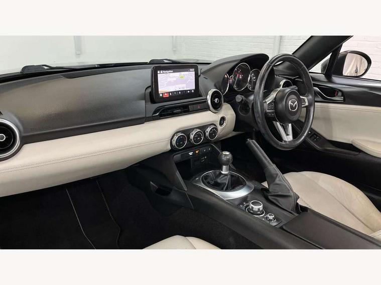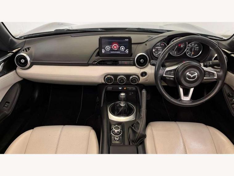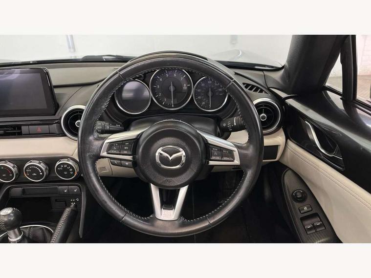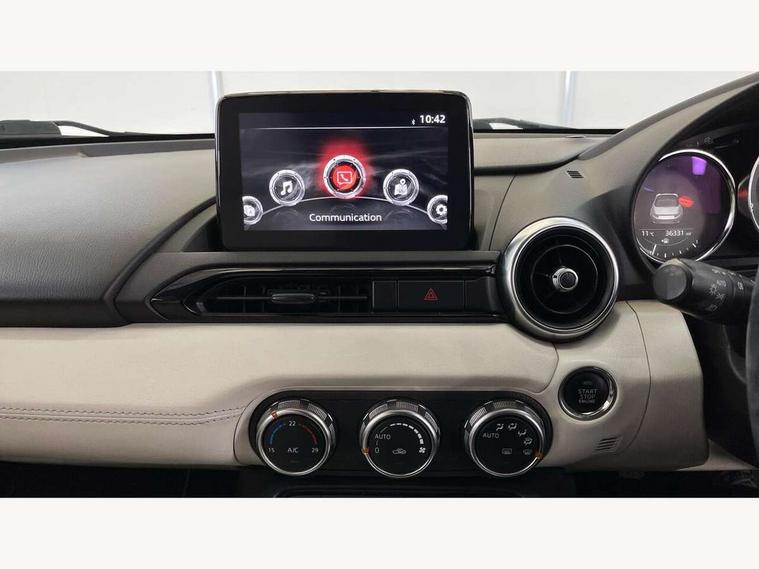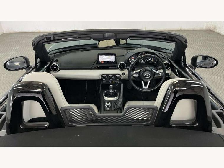 7" colour touch screen with Mazda connect infotainment, Aha and stitcher app, Analogue speedometer, Apple car play/Android Auto, Blind spot monitoring with rear cross traffic alert, Cruise control + speed limiter, Driver alert system, eCall emergency call system, Emergency stop signalling system, Engine start/stop button, Hands free phone preparation, Integrated bluetooth with hands-free calling, bluetooth audio and easy access to phone contacts, Integrated navigation system, Lane departure warning system, Multi dot display tachometer and electric odometer, PAS, Rear parking sensor, Reversing camera, Service indicator, Traffic sign recognition, Trip computer, Water temperature gauge, I-ELOOP, i-stop, Limited slip differential, Sports suspension featuring Bilstein dampers, 2 USB/aux input socket, Multimedia Commander including separate volume dial, Premium Bose sound system with 9 speakers with 2 in each front headrest, AM/FM/DAB radio and MP3, Steering wheel mounted audio/bluetooth controls, Adaptive LED Headlights, Auto dimming rear view mirror, Automatic headlamp levelling, Body colour bumpers, Body colour co ordinated interior upper door trim, Coming/leaving home lighting function, Dual exhaust pipes, Dusk sensitive headlamps, Electric front windows/one touch facility, High mounted rear brake light with Black coloured cover, LED 3rd brake light, LED daytime running lights, LED indicator lights, LED rear lights, Manually operated black premium cloth soft top with heated rear glass window, Piano black electric/heated door mirrors, Piano Black fashion bars, Rain sensing front wipers, Stainless steel scuff plates with MX-5 logo, 12V socket, Centre console storage box, Chrome Air conditioning dials, Climate control air conditioning, Coin Box, Driver and front passenger sunvisors with covered vanity mirror and driver ticket holder, Driver seat manual slide, recline and tilt adjustment, Front centre armrest, Front head restraints, Gear shift indicator, Heated front seats, in 3 heat levels, Interior courtesy light, ISOFIX front passenger seat child seat compliance, Leather gear knob, Leather handbrake lever, Leather steering wheel, Lockable rear centre box with lid, Passenger seat + manual slide/recline adjust, Perforated nappa leather upholstery, Side door trim in light stone vinyl with light stitching, Single front passenger seat, Sports seats, Strut brace, Tilt/telescopic steering column, Two cupholders, Windblocker, 3 point ELR front seatbelts with pretensioners, ABS+Electronic Brake force Distribution, Deployable Hood System (DHS), Driver and front passenger airbags, Driver and passenger seatbelt reminder audible warning, Front dynamic yaw stability control, Hill hold assist, Passenger airbag deactivate switch, SCBS - Smart City Brake Support, rear plus front with autonomous emergency braking, Side airbags, Traction control, Tyre pressure monitor, Remote central locking with deadlocking and remote boot release, Smart keyless entry, Superlocking, Thatcham category 1 alarm + immobiliser, Chrome air vent surrounds, Chrome meter rings, Dashboard panel - vinyl leather Light Stone, 17" BBS Gun Metallic alloy wheels, Tyre puncture repair kit,