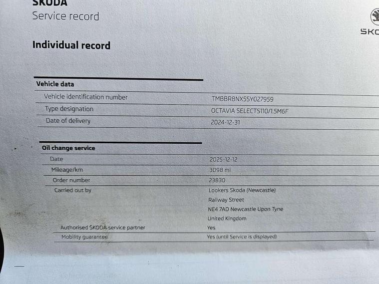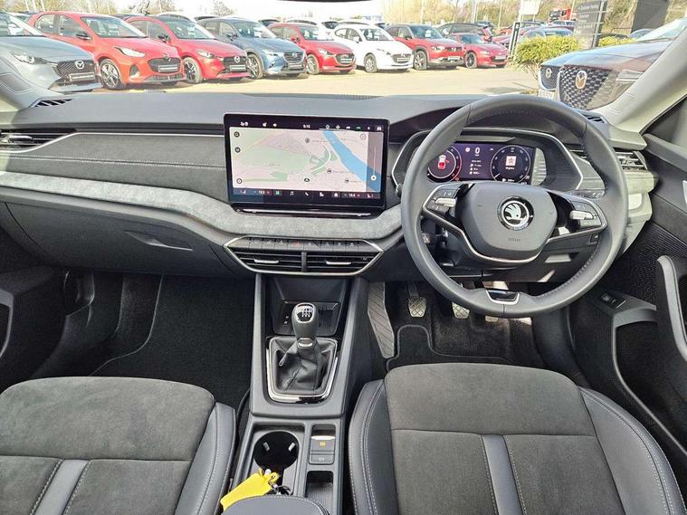1x USB Typc C port in rear view mirror, 4x USB Type C ports - 2x in front centre console and 2x in rear (45W), Drive mode selection, Driver fatigue sensor, eCall emergency system, Electro-mechanical power steering, Front and rear parking sensors with manoeuvre assist, Front assist system, Traffic jam assist, Traffic sign recognition, Turn Assist, Virtual Cockpit - 10.25" digital display, Voice control system, Wireless charging (15W) with cooling function, Wireless SmartLink for Apple CarPlay and Android Auto, 13" touchscreen display with navigation, DAB Digital radio, Aero front windscreen wipers with intermittent function, Auto dimming rear view mirror, Body colour bumpers, Body colour door mirrors and handles, Chrome grille surround, Chrome strip in lower front bumper, Chrome window surrounds, Electric front and rear windows, Heated rear windscreen, High level third brake light, Ice scraper in fuel cap, LED daytime running lights, LED Headlights, Logo projection in front doors, Rain and light sensors, Rear fog light on one side, Rear privacy glass, Rear side wing doors, 12 volt socket in boot, 3 rear headrests, 3 seat bench in 2nd row, 4 foldable roof handles, Boot net programme, Front head restraints, Heated front seats, Illuminated glovebox, Interior door handles in dark chrome, Jumbo Box storage, Luggage compartment lighting x2 lights, Mechanical rear seat release from boot, Parcel shelf - folding, Single front passenger seat, Steering wheel in black leather with black stitching, Storage compartments in left and right of boot, Sun visors with mirrors, Sunglasses storage, Ticket holder, Umbrella in door panel, Unsplit rear bench seat, split folding backrest with centre armrest with cupholder, Comfort package - Octavia, 3x3 point rear seat belts, Alarm with interior monitoring, tilt sensor and back up horn, Curtain airbags and front side airbags, Driver and front passenger airbags, Drivers knee airbag, Electronic parking brake, ESC including ABS, EBV, MSR, ASR, EDS, HBA, DSR, Front central airbag, Hill hold assist, ISOFIX on front passenger seat and outer rear seats, Passenger airbag deactivate switch, Three point seat belts in front and rear, Two tone horn, Tyre pressure monitor, Visual and acoustic seat belt reminder, Warning reflectors in front door, Anti-theft wheel bolts, Keyless start/stop, Remote central locking, Chrome air vent surrounds,