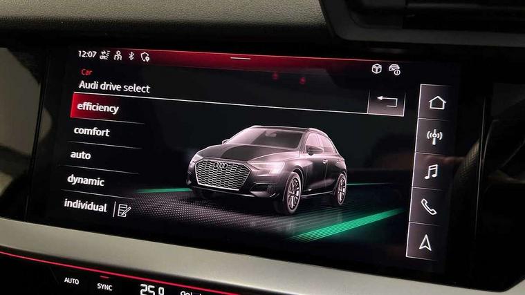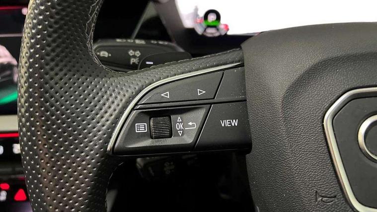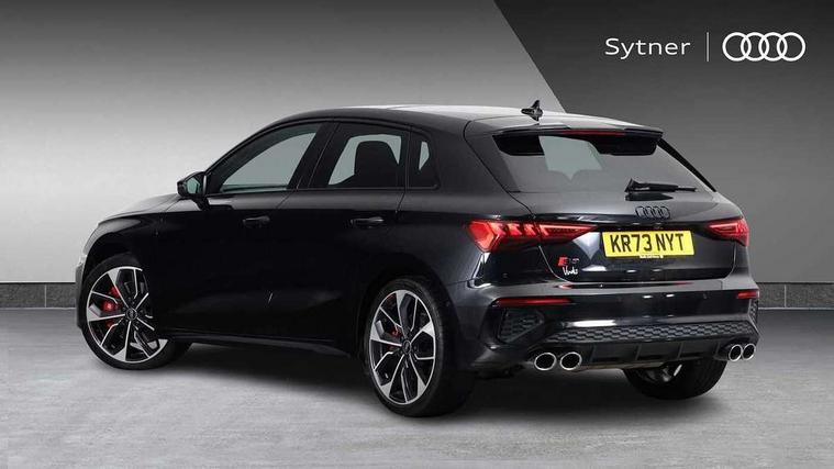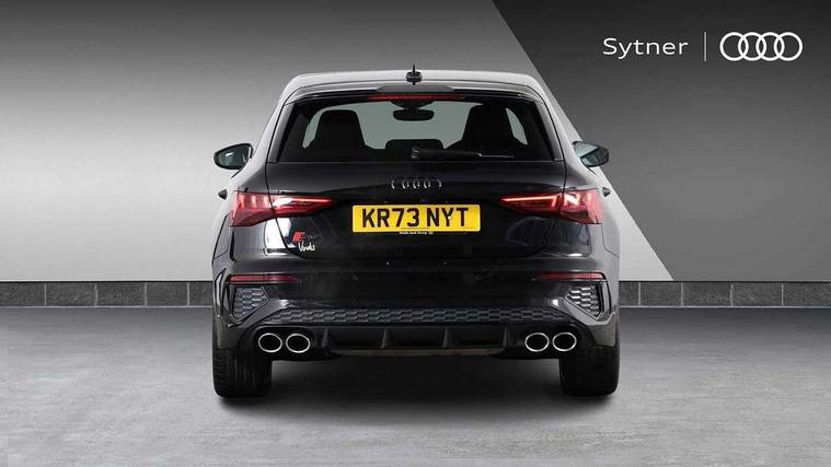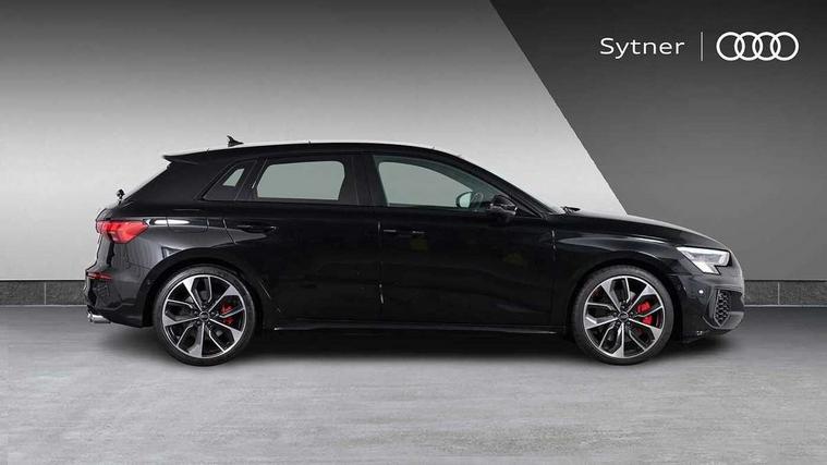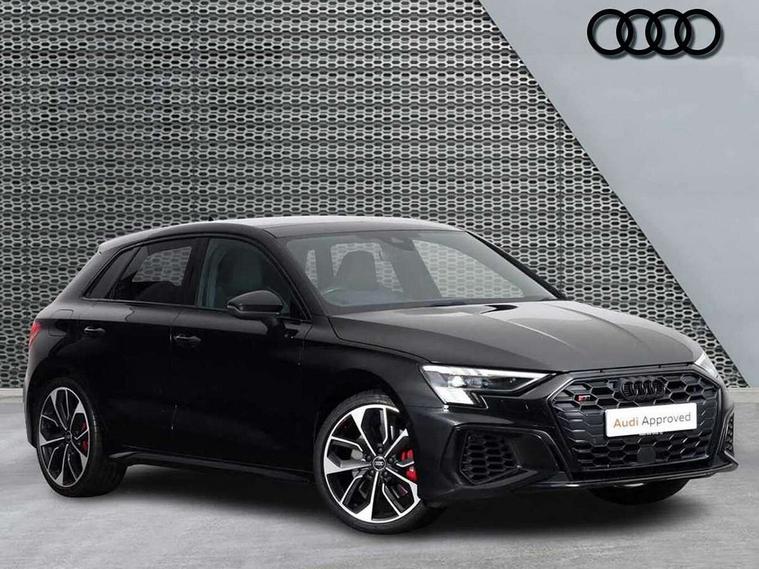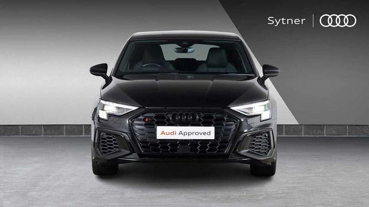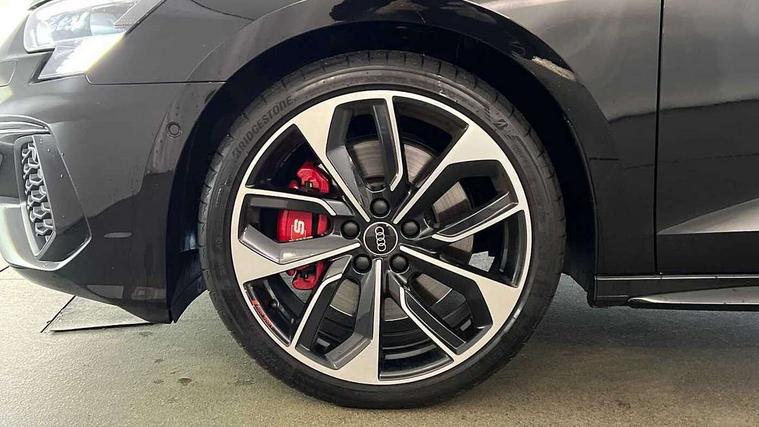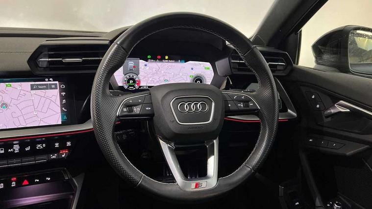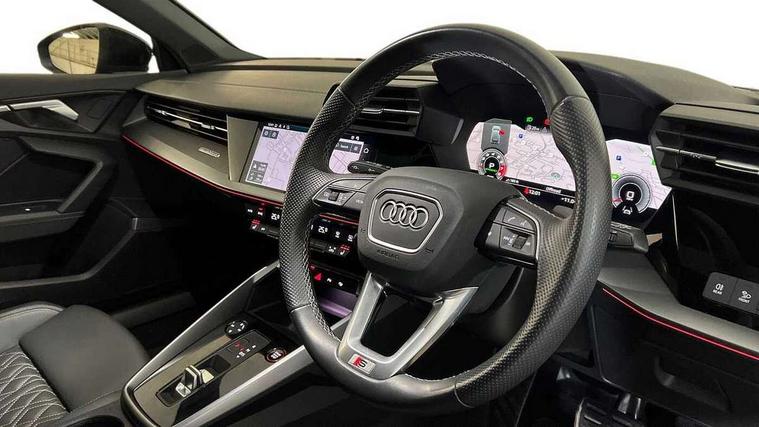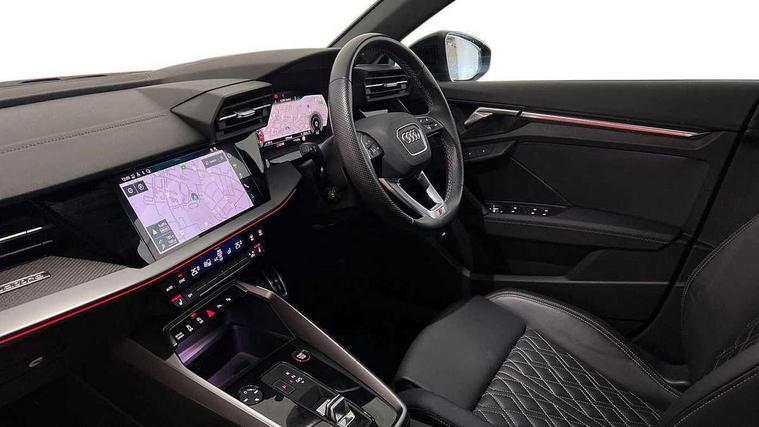 Adaptive cruise assist, Audi drive select (Auto, Comfort, Dynamic, Efficiency and Individual), Audi smartphone interface, Audi virtual cockpit plus - 12.3" full HD resolution dynamic digital instrument cluster, Automatic start/stop system with recuperation, Bluetooth interface, Collision avoidance assistant, e-Call (emergency call), Head up Display, Lane change assistant with exit warning system and rear cross traffic alert, Lane departure warning system, MMI Navigation Plus with high resolution 10.1" colour touch screen display, Power operated tailgate - Luggage compartment lid opens/closes electrically, Progressive steering, Service indicator, Trip computer, Voice control system with natural language interaction, Quattro permanent all wheel drive, S suspension with damper control, 2xUSB-C connection with data and charging functions, DAB Digital radio, 3rd brake light, Acoustic glass windscreen, Audi Beam uses LEDs to project Vorsprung onto the ground as you exit your S3, Auto dimming frameless rear view mirror, Carbon door mirror housings, Dual branch oval twin tailpipes in chrome plated finish, Electrically adj heated/folding + automatically dimming exterior mirrors with memory + automatic kerb side function for passenger side exterior mirror, Front electric windows, Headlight washers, Heat insulating glass windscreen, Illuminated door sills with aluminium inserts at the front with S logo, Integrated LED indicators in door mirrors, LED daytime running lights, Light and rain sensors, Privacy glass - dark tinted rear window, rear door and side windows, Rear electric windows, Rear side air outlets in grained matt black, Rear side wing doors, Rear wiper, 12V socket and storage compartment in front centre console, 3 seat bench in 2nd row, 3 spoke leather multifunction steering wheel with gear shift paddles, 4 way electrically adjustable lumbar support for driver and front passenger, 60/40 split folding rear seat bench, Black cloth headlining, Dual zone electronic climate control, Fine Nappa leather upholstery with front sports seats S embossed logo, Front and rear centre armrest in artificial leather, Front and rear headrests, Front/rear floor mats, Height and reach adjustable steering wheel, Interior lighting - glove compartment light and right hand side, Luggage compartment floor covering, Seat side bolsters, Single front passenger seat, Stainless steel pedals and front footrest in black, Aluminium interior elements pack - A3 Sportback, Black styling pack - A3 Sportback/S3, Body styling design pack - S3, Extended ambient lighting pack - A3 Sportback, Storage pack - A3 Sportback, Technology pack pro with 360 camera - A3 Sportback/Voursprung, 3x3 point rear seat belts, Driver and front passenger airbag with passenger airbag deactivation, Electronic Stabilisation Control (ESC) including ABS, ASR and EDL, First aid kit with warning triangle and 2 safety vests, Front side airbags with head airbags and interaction airbag, Pre-sense front with pedestrian and cyclist detection, Seatbelt monitoring, Tyre pressure loss indicator, Anti theft alarm, Anti-theft wheel bolts, Electronically operated child locks, Immobiliser, Remote control central locking, Carbon inlays, accent surfaces in the dashboard and centre console in platinum grey silk effect paint finish,