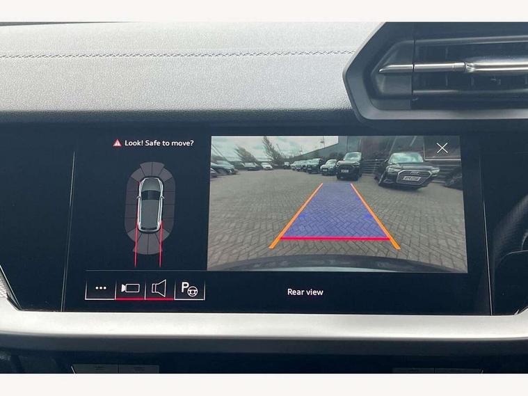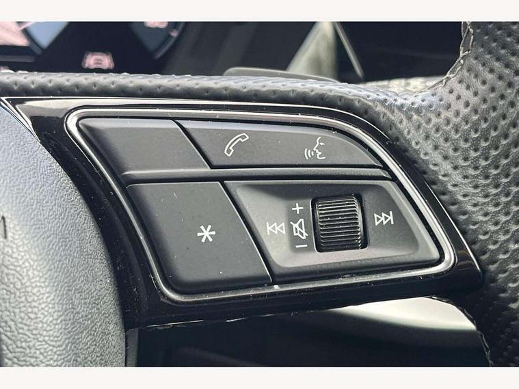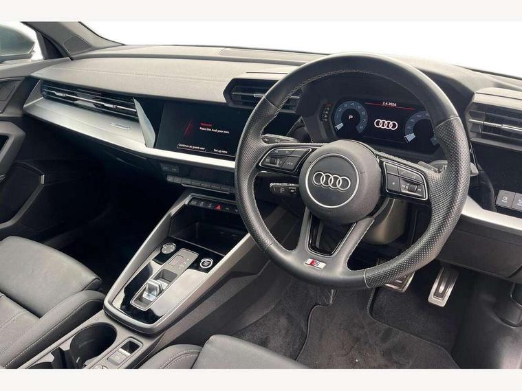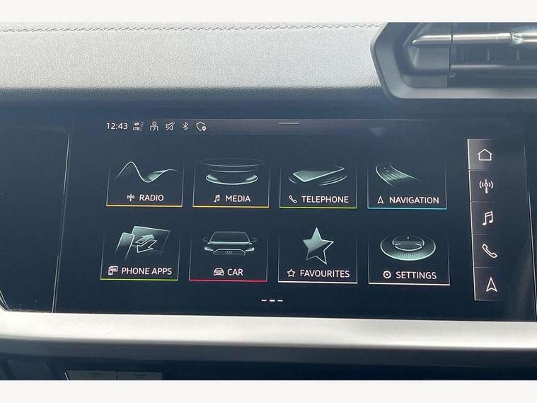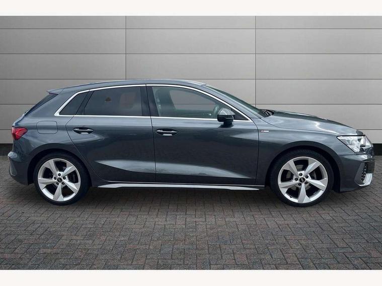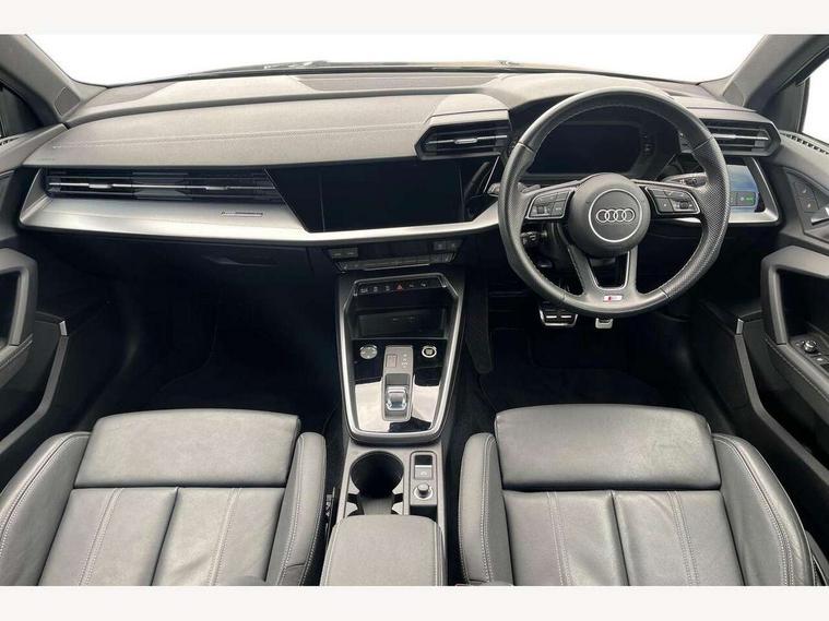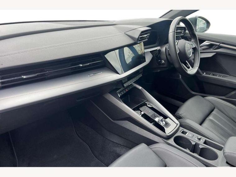 Audi drive select (Auto, Comfort, Dynamic, Efficiency and Individual), Audi smartphone interface, Audi Virtual Cockpit - 10.25" digital and colour instrument cluster, Automatic start/stop system with recuperation, Bluetooth interface, Collision avoidance assistant, e-Call (emergency call), Electromechanical power speed sensitive steering, Lane departure warning system, MMI Navigation Plus with high resolution 10.1" colour touch screen display, Service indicator, Trip computer, Voice control system with natural language interaction, Sports suspension, 2xUSB-C connection with data and charging functions, 6 passive loudspeakers, DAB Digital radio, 3rd brake light, Acoustic glass windscreen, Aluminium window trim, Auto dimming frameless rear view mirror, Body colour exterior mirrors, Electrically adjustable/heated/folding/auto dimming door mirrors with integrated LED indications + kerb view function for passenger side, Front electric windows, Illuminated aluminium inserts front door sills with S logo, LED daytime running lights, LED headlights with LED rear lights and dynamic rear indicators, Light and rain sensors, Privacy glass - dark tinted rear window, rear door and side windows, Rear electric windows, Rear side air outlets in grained matt black, Rear side wing doors, Rear wiper, S line bumpers, S roof spoiler, 12V socket and storage compartment in front centre console, 3 seat bench in 2nd row, 3 spoke leather multifunction steering wheel with paddle shift, 4 way electrically adjustable lumbar support for driver and front passenger, 60/40 split folding rear seat bench, Black cloth headlining, Dual zone electronic climate control, Front and rear centre armrest in leather, Front and rear headrests, Front/rear floor mats, Height and reach adjustable steering wheel, Interior lighting - glove compartment light and right hand side, Luggage compartment floor covering, Manual boot compartment lid, Manually adjustable front seats, Seat side bolsters, Single front passenger seat, Stainless steel pedals and front footrest in black, Twin leather upholstery with front sports seats S embossed logo, Aluminium interior elements pack - A3 Sportback, LED interior lighting pack - A3 Sportback, S line styling pack - A3 Sportback, 3x3 point rear seat belts, Driver and front passenger airbag with passenger airbag deactivation, Electronic Stabilisation Control (ESC) including ABS, ASR and EDL, First aid kit with warning triangle and 2 safety vests, Front side airbags with head airbags and interaction airbag, Pre-sense front with pedestrian and cyclist detection, Seatbelt monitoring, Tyre pressure loss indicator, Anti theft alarm, Anti-theft wheel bolts, Electronically operated child lock, Immobiliser, Remote control central locking, Dark spectrum aluminium inlays, accent surfaces in the dashboard and centre console in platinum grey silk effect paint finish,