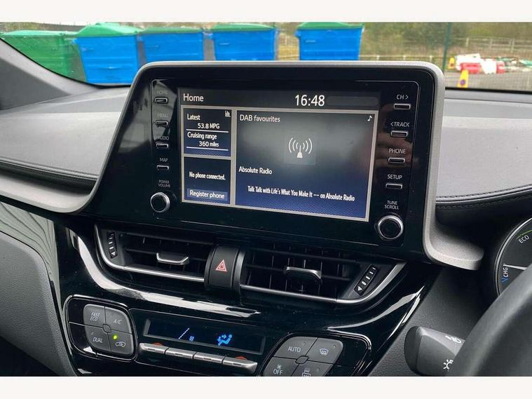 4.2" coloured TFT screen for multi-information display, Adaptive cruise control, Apple car play and Android auto, Bluetooth connectivity, E-call, Electric power steering, Hybrid system indicator, Lane departure alert with steering control, Lane trace assist, Push button start, Push button tailgate release, Remote boot door release in cabin, Remote boot door release in key, Reversing camera, Road sign assist - RSA, Smart voice assist, Trip computer, Voice recognition, Vehicle Stability Control (VSC), 6 speakers, AM/FM radio, DAB Radio (Digital Audio Broadcasting), Toyota touch 2 multimedia system with 8" display, USB connector, Wi-fi connectivity, Anti-jam protection on power windows, Auto high beam, Auto up and down function on all power windows, Automatic headlights, Automatic headlights cut-off, Black and body coloured rear bumper, Black lower front grille, Black upper front grille, Body colour door handles, Body colour door mirrors, Body colour front spoiler lip, Body coloured front bumper, Boot door release with push button, Electric heated door mirrors, Follow me home headlights, Front and rear power windows, Front fog lights, Headlight cut off reminder, Honeycomb lower front grille, LED daytime running lights, LED High mounted stop light, LED rear brake lights, LED rear combination lights, Manual headlight levelling, Manually retractable door mirrors, Noise reduction layer on front windows and windscreen, Power adjustable door mirrors, Rear side wing doors, Rear spoiler, Rear tailgate, Rear window defogger, Rear window wiper, Reflective LED headlights, Shark fin antenna, UV-filter on driver and passenger windows, UV-filter on rear windows, Variable front intermittent wipers, 12v power outlet - front, 3 rear headrests, 3 seat bench in 2nd row, 3 spoke leather steering wheel, 60/40 split folding 2nd row rear seats, Adjustable rear headrests, Adjustable speed limiter switch on steering wheel, Assist grips front and centre pillar, Audio and telephone switches on steering wheel, Black front door assist grips, Boot light, Chrome interior door handles, Cloth upholstery, Driver and front passenger personal light, Driver and front passenger Whiplash Injury Lessening seats, Dual zone automatic air conditioning, Floor mats, Front cupholders, Front head restraints, Front sports seats, Glovebox with internal light, Hard tonneau cover, Hooks for luggage holding net, Humidifying Nanoe air purifier, Illuminated entry system, Isofix attachments on outer rear seats, Leather gearshift, Light on driver sun visor, Light on passenger sun visor, Manual telescopic steering wheel, Manual tilt steering wheel, Manually adjustable lumbar support on driver seat, Manually height adjustable driver seat, Manually height adjustable front passenger seat, Manually reclining driver seat, Manually reclining front passenger seat, Manually sliding driver seat, Manually sliding front passenger seat, Microphone on front personal light, Mirror on driver sun visor, Mirror on passenger sun visor, Multimedia switches on steering wheel, Pollen filter, Shopping bag hooks, Single front passenger seat, Slow opening on lower glovebox, Voice recognition switch on steering wheel, 16 Disk front wheel brake, 3x3 point rear seatbelts, ABS+EBD+Brake assist, Electronic parking brake, Front and rear seatbelt reminder, Front passenger airbag on/off switch, Hill start assist control (HAC), Pre collision system with pedestrian detection, Pre-tensioners and force limiters, Rear door child safety locks, SRS Airbags - Driver + Front passenger, front side, front and rear curtain and driver's knee airbags, Toyota safety sense, Tyre pressure monitoring system, Tyre pressure warning system, Acoustic vehicle alert system (AVAS), Glass-breaking alarm sensors, Immobiliser, Intrusion alarm, Intrusion sensor, Motion sensor alarm, Power door locks, Power passenger window lock, Remote central locking, Black lower dashboard, Black upper dashboard, Grey deco line on upper dashboard, Matte black centre console, Tyre repair kit,