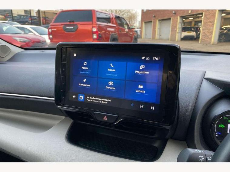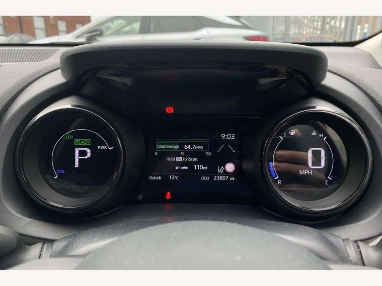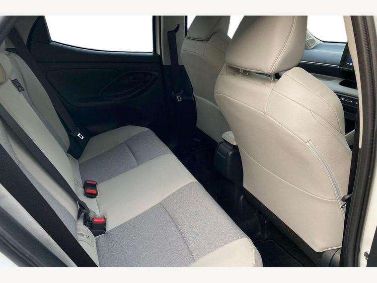 Adaptive cruise control, Adjustable speed limit with speed warning, Blind spot monitoring, Bluetooth connectivity, Colour binocular inspired displays with digital speedometer, E-call, Electric power steering, Hybrid energy display, Multi information display switches on steering wheel, Reversing camera, Smartphone integration with Apple CarPlay and Android auto, Tailgate, Touch 2 navigation system, Voice recognition, Vehicle Stability Control (VSC), 6 speakers, 9" HD multimedia display touch screen with Toyota smart connect, USB connection, Acoustic windscreen glass, Auto windscreen wipers, Automatic headlights, Automatically retractable door mirrors, Body coloured door mirrors, Electric adjustable heated door mirrors, Follow me home headlights, Front auto power windows with anti jam protection, Full LED rear lights, LED daytime running lights, LED front fog lights, LED front light guide, LED Headlights, LED High mounted stop lamp, LED Indicators, LED rear light guide, Manual headlight levelling, Painted chequered front grille, Rain sensor, Rear auto power windows with anti jam protection, Rear privacy glass, Rear side wing doors, Rear spoiler, Rear wiper, Satin lower front grille, Shark fin antenna, Turning signal integrated indicators in door mirrors, Variable front intermittent wipers, 3 adjustable rear headrests, 3 seat bench in 2nd row, 3 spoke leather steering wheel, 60/40 split folding rear seat, Active headrests, Adjustable boot height, Coat hooks in rear grab handles, Cup holders (2 front & door), Data Communication Module (DCM) connected services, Dual zone automatic air conditioning, Fabric seat with partial synthetic leather upholstery, Front armrest, Front sport seats, Glovebox, Grey roof lining, Height adjustable driver's seat, Height adjustable passenger seat, Isofix seat fixing, Leather gearshift, Map pockets on the backs of the front seats, Pollen filter, Shopping bag hooks, Single front passenger seat, Tilt/telescopic steering column, Parking pack - Yaris, 3 point seatbelts on all rear seats, ABS+EBD+Brake assist, Electronic parking brake, Emergency brake light system (EBS), Front passenger airbag on/off switch, Front seatbelt reminder, Hill start assist control (HAC), Rear child proof door locks, Rear seat belt reminder, Supplemental Restraint System (SRS) 8 airbags: Driver & passenger's airbags, dual side curtain airbags, side impact airbags, front centre airbag, Toyota Safety Sense 2, Precollison + Night time Pedestrian & Cyclist Detection, Lane Trace Assist, Auto High Beam, Intelligent ACC & Road Sign Assist, Tyre pressure warning system, 2x Master key, Alarm/immobiliser, Keyless smart entry with push button start, Remote AC via MyT, Remote locking via MyT, Remote powered central double locking doors, Satin chrome interior styling, Soft touch instrument panel, Space saver spare wheel,