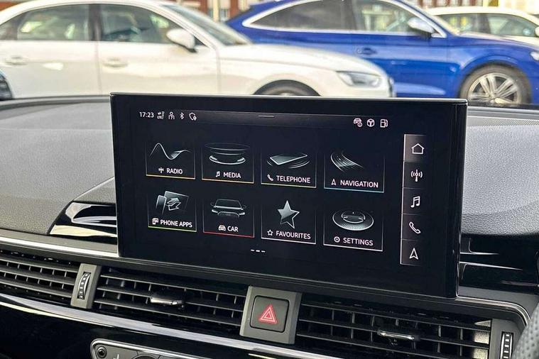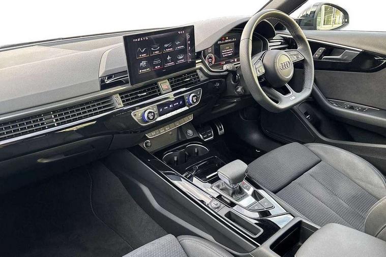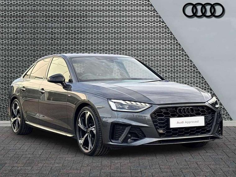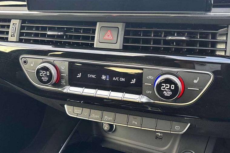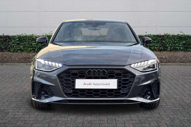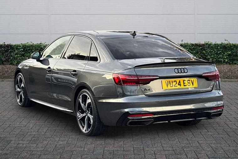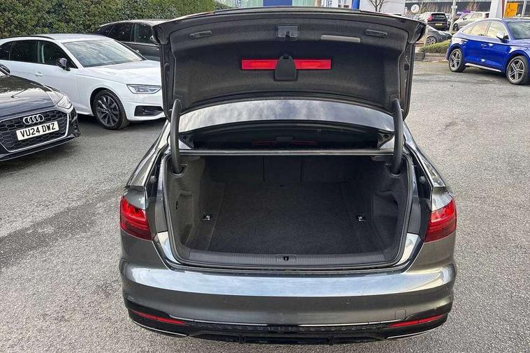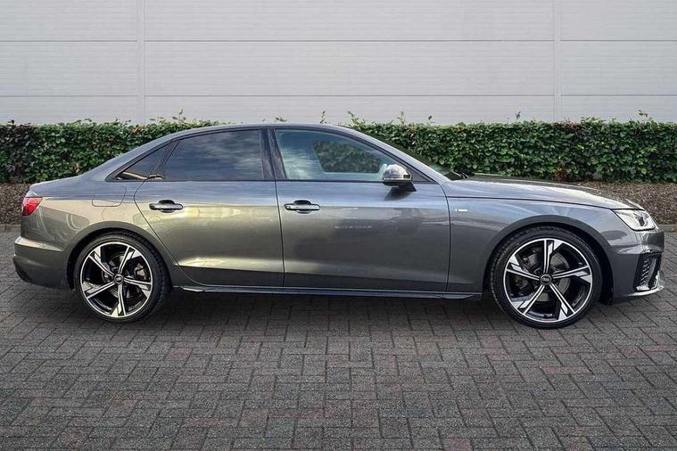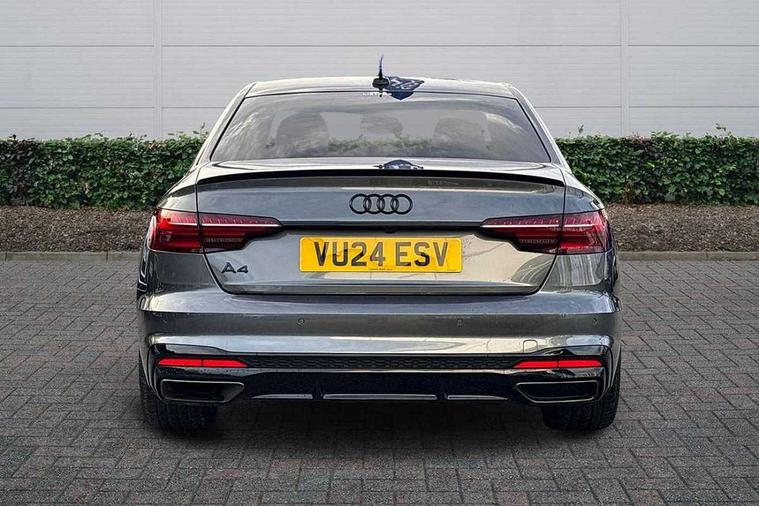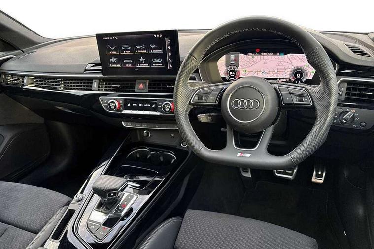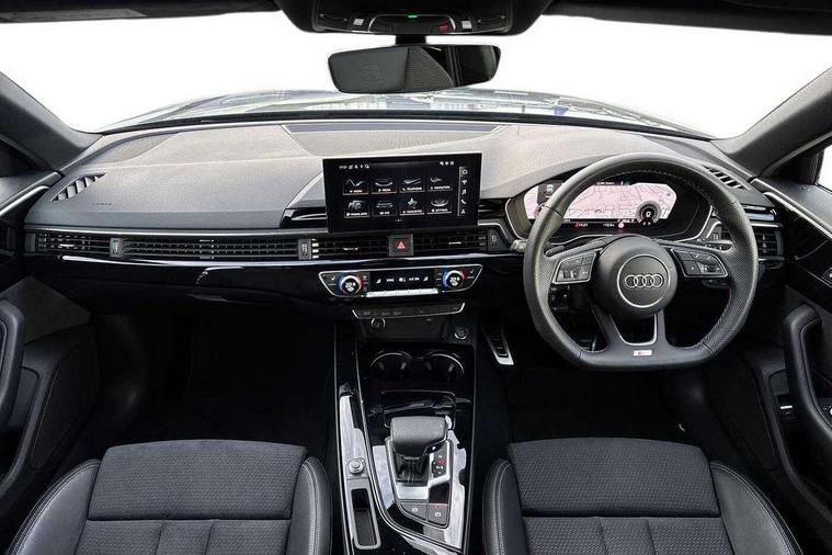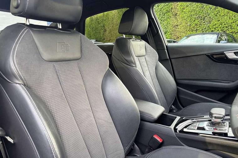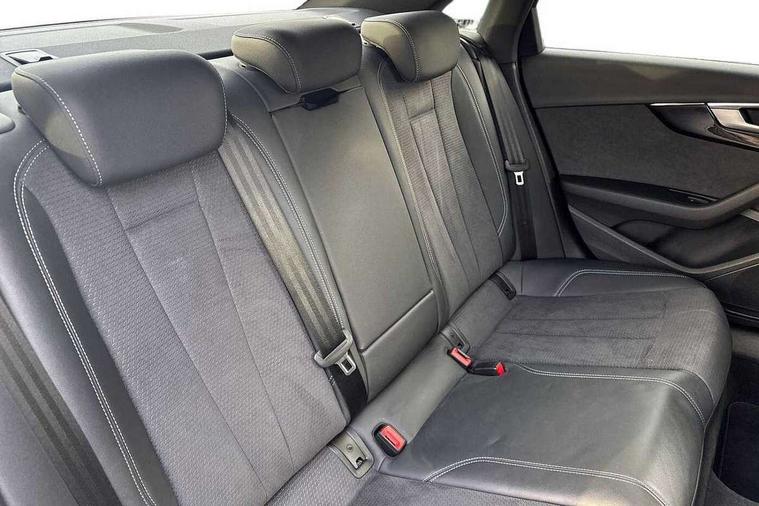 Audi connect safety and service (e-call), Audi drive select, Audi smartphone interface, Audi virtual cockpit, Automatic start-stop system with coasting functionality and efficiency programme, Bluetooth interface, Camera based traffic sign recognition, Electric boot lid release, Electromechanical power steering, Email, calendar and text messages displayed via MMI, Front and rear parking sensors, Lane departure warning, MMI Navigation plus with MMI touch includes 10.1" high resolution colour MMI display, 3D map, Rear view camera, Voice control system, Sports suspension lowered by 23mm, 2 USB charging ports, 8 passive loudspeakers, DAB digital radio reception, Audi beam uses LEDs to project the audi logo onto the ground as you exit your A4, Auto dimming rear view mirror, Black Audi rings and black badging (model name in black badging, no engine badging), Body colour door handles, Body colour front spoiler lip, Body colour side sill trim, Electric adjustable/heated/folding door mirrors with auto dimming, Exhaust tailpipes in high dark chrome, Grained matt black side air inlets with matt aluminium silver inlay, High beam assistant, High gloss black B pillar trims and triangular rear door trim, LED headlights with LED rear lights + dynamic rear indicators + headlight adjustment and high beam, turning light + LED daytime running lights, LED third brake light, Privacy glass, Rain and light sensors, Rear boot, Rear diffuser in matt black with trim strip in matt aluminium silver, Rear side wing doors, Sport front and rear bumpers with side skirts, Variable intermittent front wash/wipe, Windscreen with acoustic glazing, 4 way electric lumbar support for driver and front passenger, 40/20/40 split folding 3 rear seat bench in 3 parts with rear centre armrest, Black carpets, Black cloth headlining, Black perforated leather gearknob, Contrast stitching on seats, steering wheel and gear lever gaiter, Deluxe 3 zone electronic climate control, Front and rear head restraints, Front centre armrest, Heated front seats, Illuminated door sill trims with S logo, ISOFIX child seat mounting and top tether, Manual seat adjustment, Single front passenger seat, Stainless steel pedals and foot rest, Black styling pack - A4 Saloon, LED Interior light pack - A4/S4, 3 rear seatbelts, 6 airbags - Driver, front passenger, curtain and side windows, Attention and drowsiness assist, Electronic Stabilisation Control (ESC) including ABS, ASR and EDL, Hill hold assist, Multi collision brake assist, Pop-up bonnet for pedestrian protection, Pre sense city, Rear door child safety locks, Seatbelt monitoring, Warning triangle and first aid kit, Anti theft alarm, Anti theft wheel bolts, Central locking, Keyless Go, Piano black finish inlay, Tool kit, Tyre repair kit,