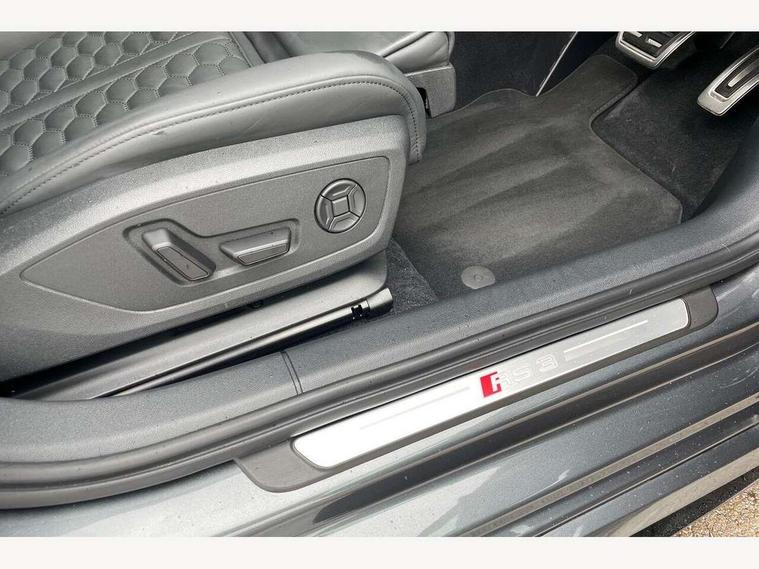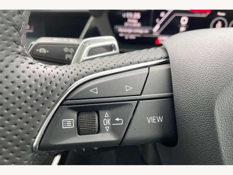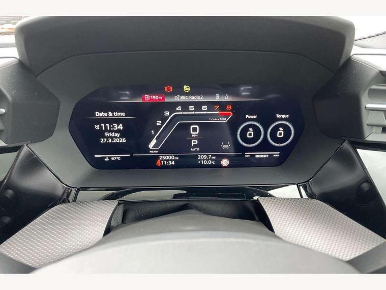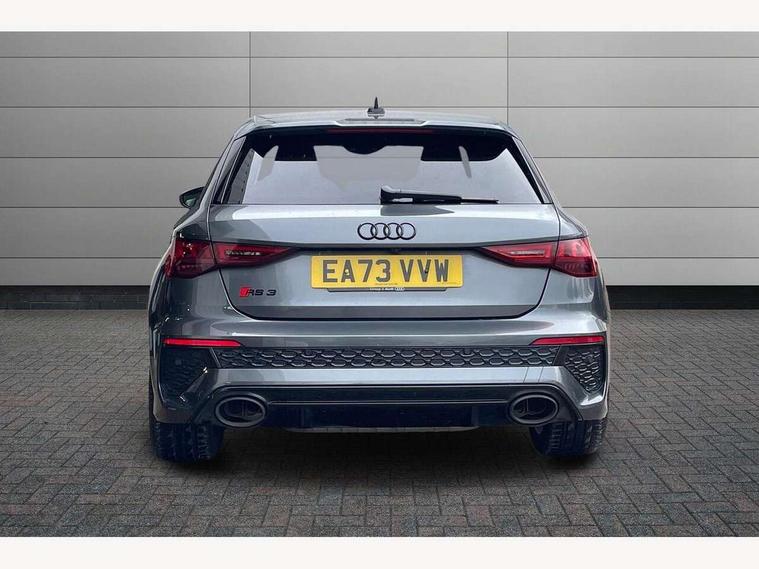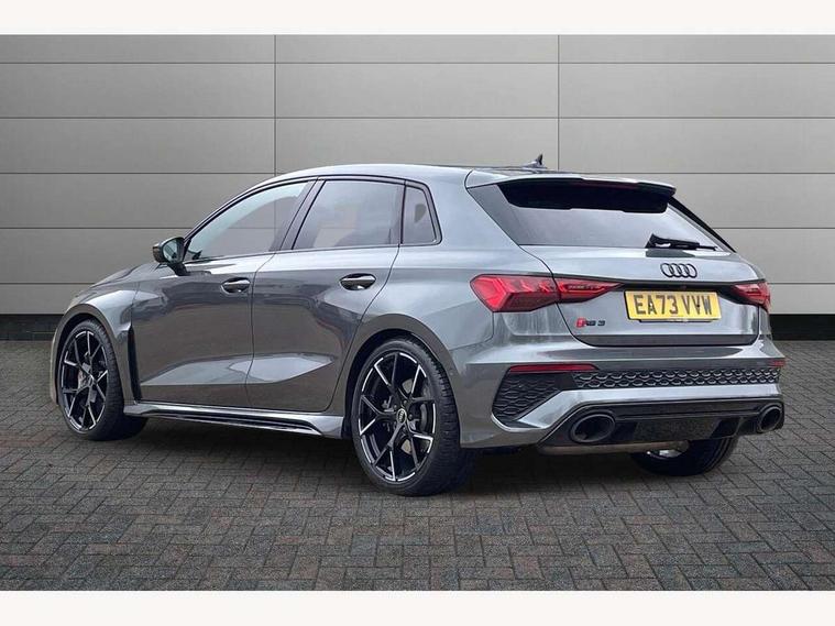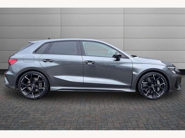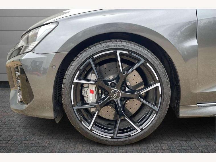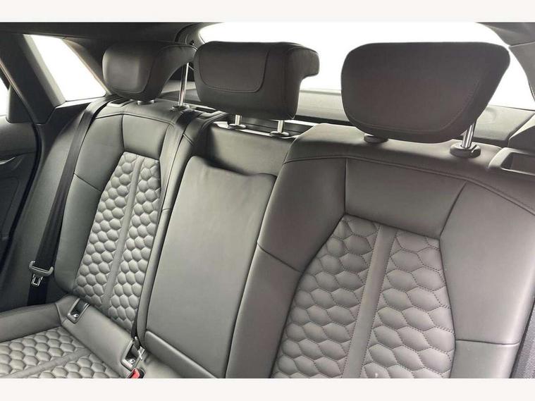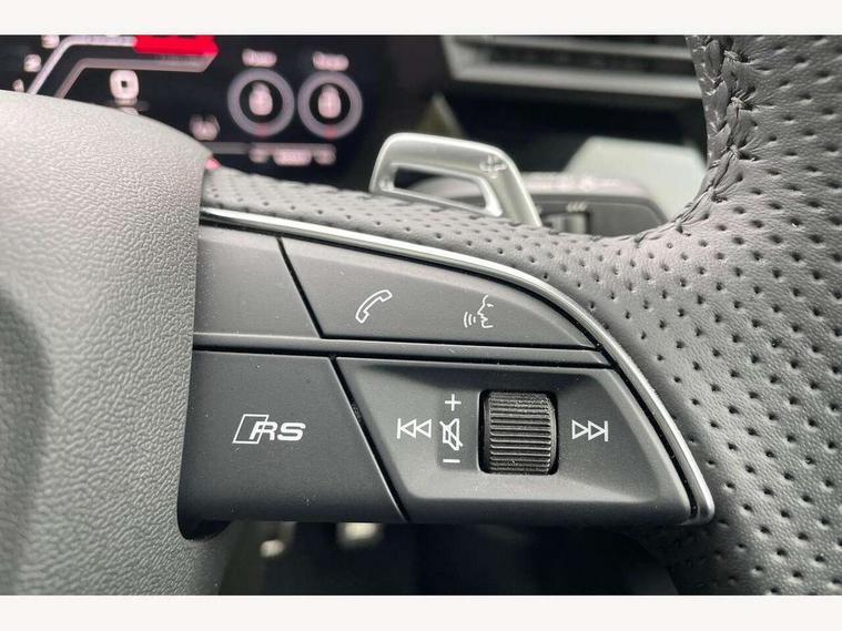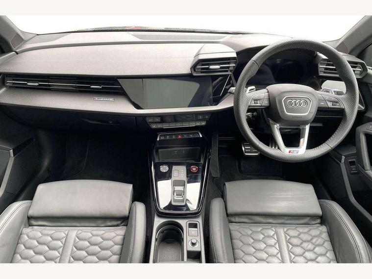 Adaptive cruise assist, Adaptive cruise control, Audi smartphone interface, Audi virtual cockpit with RS specific display 12.3" full colour digital instrument cluster, Automatic start/stop system with recuperation, Bluetooth interface, Camera based traffic sign recognition, Collision avoidance assistant, Emergency e-call, Head up Display, Lane departure warning system, Legal emergency call, Parking assist with parking system plus, Power operated tailgate - Luggage compartment lid opens electrically, Progressive power assisted steering, Reversing camera, Quattro permanent four wheel drive, Rear suspension, DAB Digital radio, 3rd brake light, Acoustic glass windscreen, Audi beam uses LEDs to project the Audi sport logo onto the ground as you exit your RS 3, Audi matrix LED headlights, LED rear lights, dynamic front and rear indicators and headlight cleaning system, Auto dimming rear view mirror, Black side skirts, Body colour roof, Carbon exterior door mirror, Carbon fibre engine cover, Daytime running lights, Electric adj heated/folding + auto dimming exterior mirrors with memory + LED indicator + auto kerb side function for passenger side exterior mirror, Front spoiler in high gloss black, Heat insulating glass windscreen, Light and rain sensors, Panoramic glass sunroof, Privacy glass - dark tinted rear and rear side windows from B-pillar backwards, Rear side wing doors, Rear window wiper and washer system, RS exterior features in gloss black, RS sports exhaust system, 3 seat bench in 2nd row, 3 spoke leather multifunction steering wheel with gear shift paddles, 4 way lumbar support for front seats, 40/20/40 split folding rear seat bench, Black cloth headlining, Dual zone electronic climate control, Electrically adjustable front seats with memory function for driver's side, Front and rear headrests, Front centre armrest, Front sports seats RS embossed logo, Front/rear floor mats, Heated front seats, Honeycomb stitching and RS embossing, Illuminated door sill trims inlays in aluminium with RS 3 logo, Illuminated vanity mirror, RS emblems, Single front passenger seat, Stainless steel pedals and front footrest in black, Aluminium interior elements pack - RS3, Ambient lighting pack - RS3, Comfort and sound pack - RS3, Driver assistance pack with 3 spoke leather multi function steering wheel - RS3, MMI navigation plus with MMI touch - RS3, RS bodystyling - RS3, Storage Pack - RS3, 3x3 point rear seat belts, ABS/EBD, ASR, Audi pre sense front, Driver/Front Passenger airbags, EDL, ESC - Electronic Stability Control + traction control, Front passenger airbag deactivation, Front side airbags with head airbags and interaction airbag, Hill hold assist, Seat belt reminder with passenger presence detection in rear, Tyre pressure loss indicator, Warning triangle and first aid kit, Anti theft alarm, Anti-theft wheel bolts, Electronically operated child lock, Remote control central locking, Full decorative carbon trim, 19" 5 Y spoke black with graphic print alloy wheels, Tool kit, Tyre repair kit,